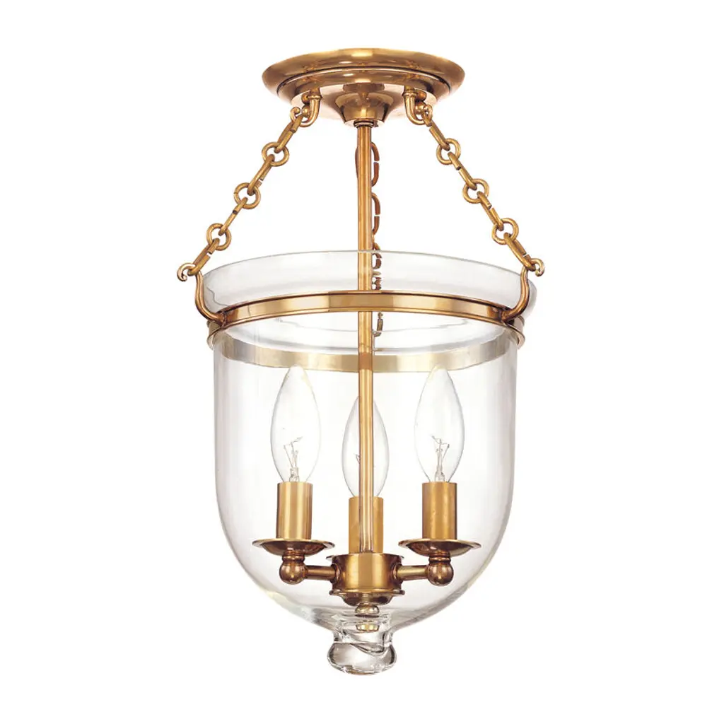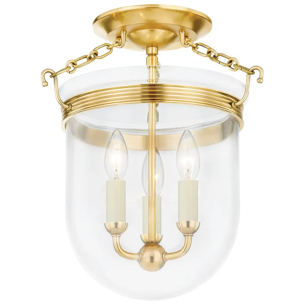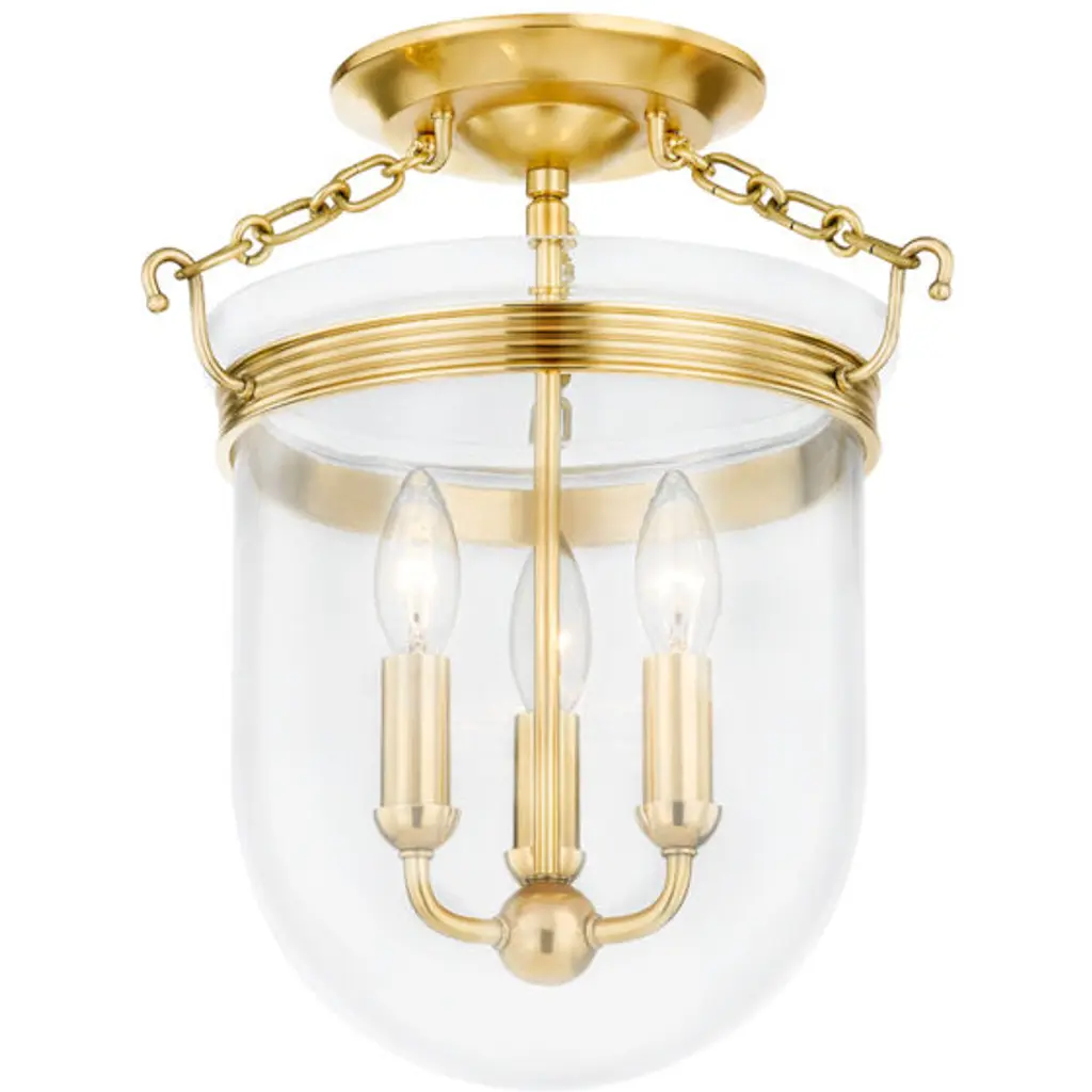 Hudson Valley Lighting presents the Rousham Semi-Flushmount, a captivating piece that reimagines the classic bell jar design with contemporary flair. Its flowing lines and meticulous details elevate the aesthetic appeal. The Aged Brass ribbed metal banding and stately chain contribute to a sense of refined sophistication. The semi-flushmount's graceful glass element, characterized by flowing contours, adds a subtle yet captivating accent that distinguishes the fixture. With its modern interpretation and attention-grabbing features, the Rousham Semi-Flushmount effortlessly combines elegance with contemporary style, making it a remarkable addition to any space.