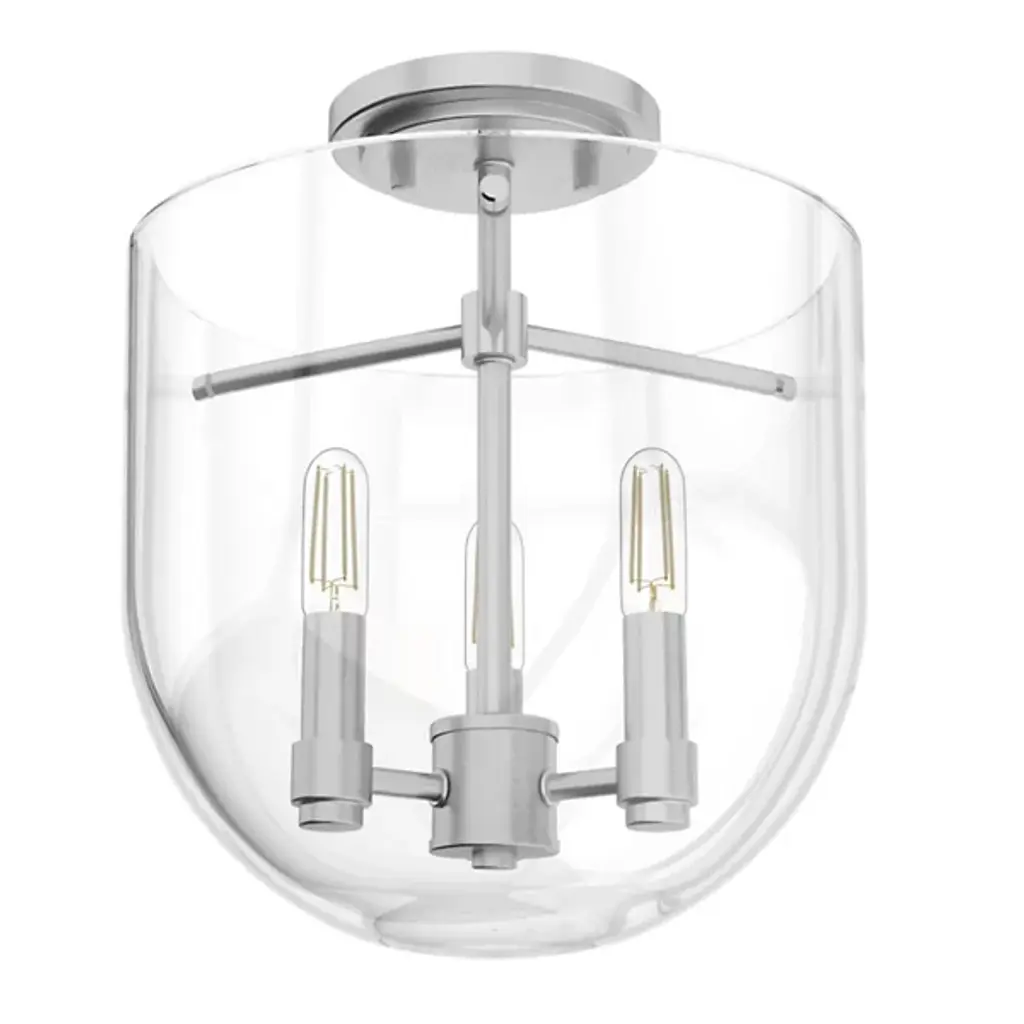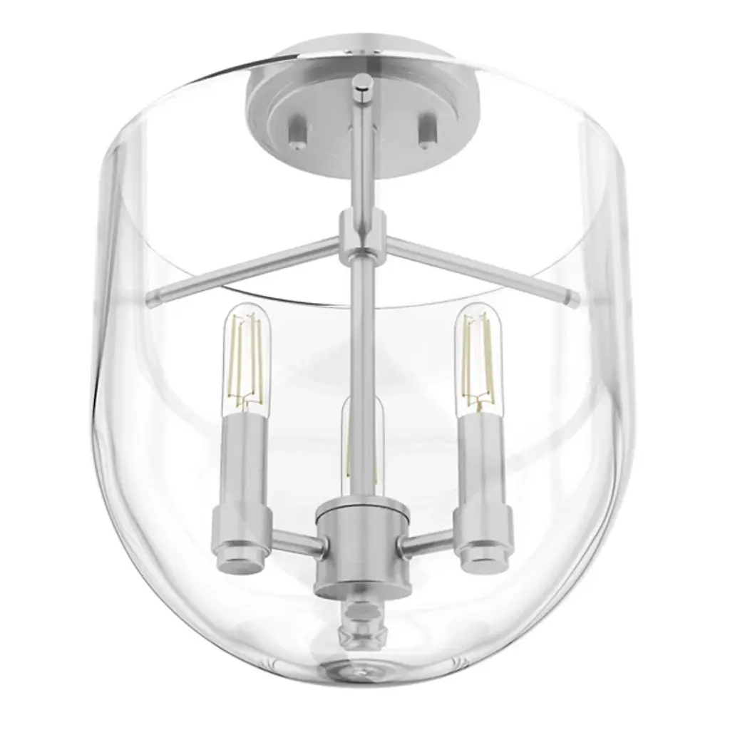The Sacha Semi-Flushmount by Hunter Fans is a contemporary addition to spaces with a clean composition. Designed with cathedral-like elegance, this close-to-the-ceiling piece pairs a bell-shaped glass shade with a round canopy, sleek stem, and set of visible candelabras. Offering plenty of illumination to surroundings, this piece works in a range of locations, including those with lower ceilings, to bring a sense of sophisticated simplicity to the rooms it brightens.