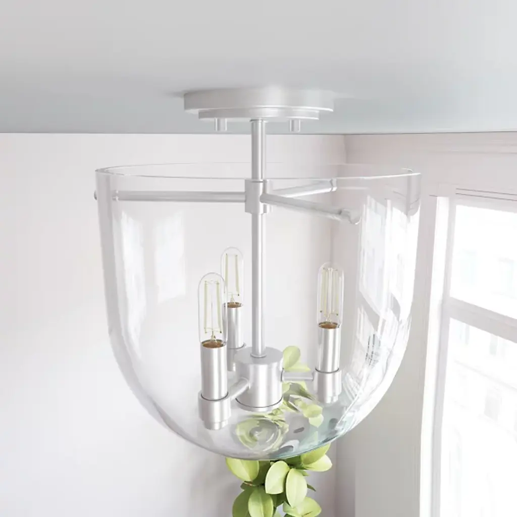 The Sacha Semi-Flushmount by Hunter Fans is a contemporary addition to spaces with a clean composition. Designed with cathedral-like elegance, this close-to-the-ceiling piece pairs a bell-shaped glass shade with a round canopy, sleek stem, and set of visible candelabras. Offering plenty of illumination to surroundings, this piece works in a range of locations, including those with lower ceilings, to bring a sense of sophisticated simplicity to the rooms it brightens.