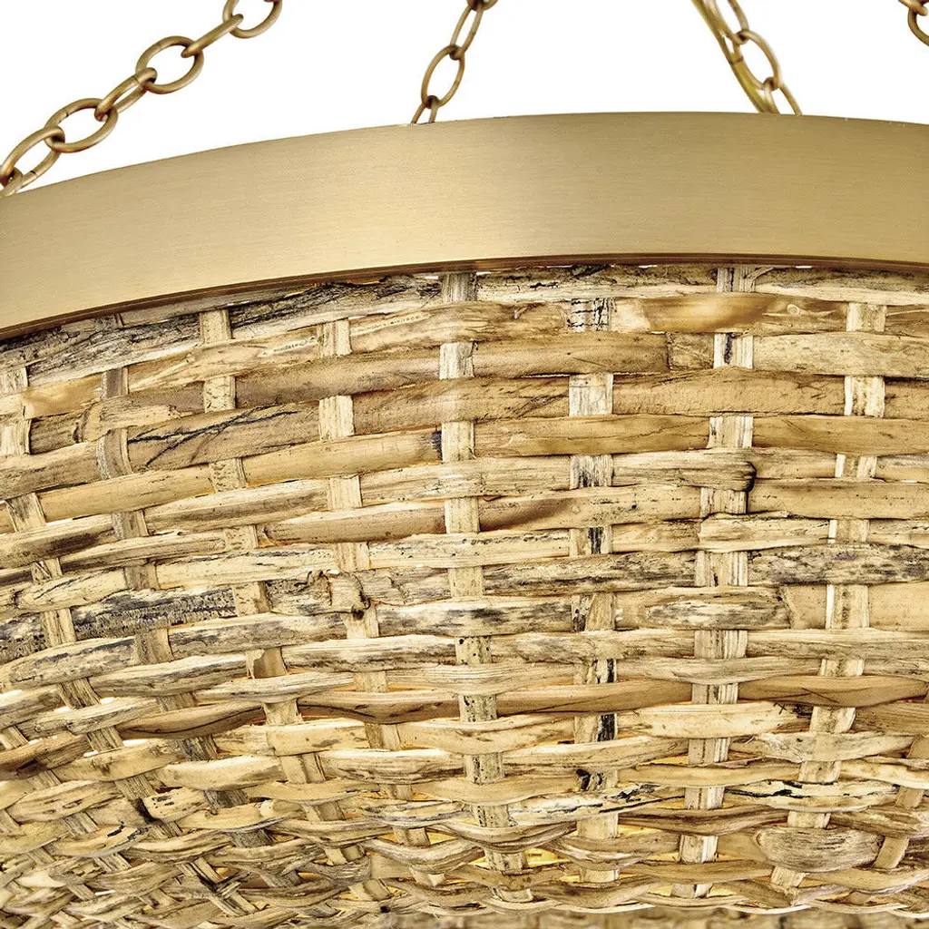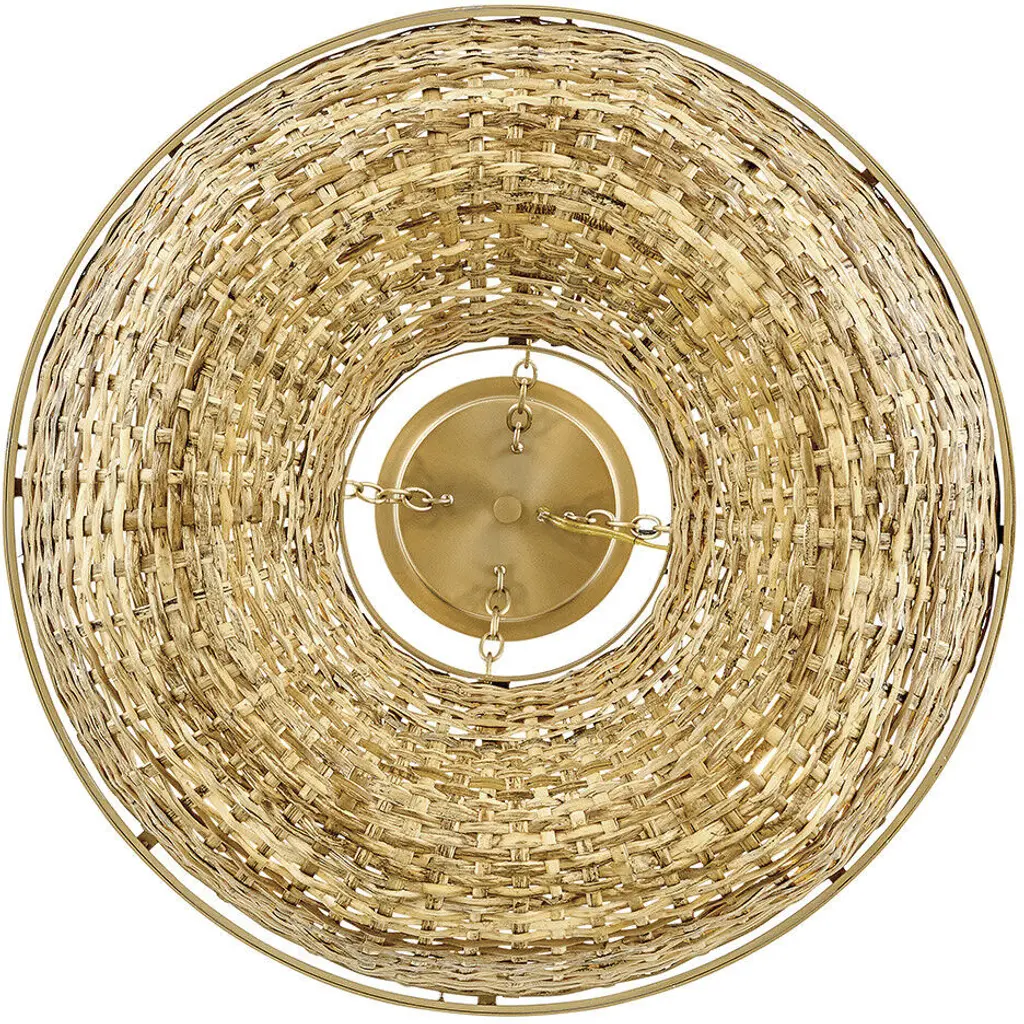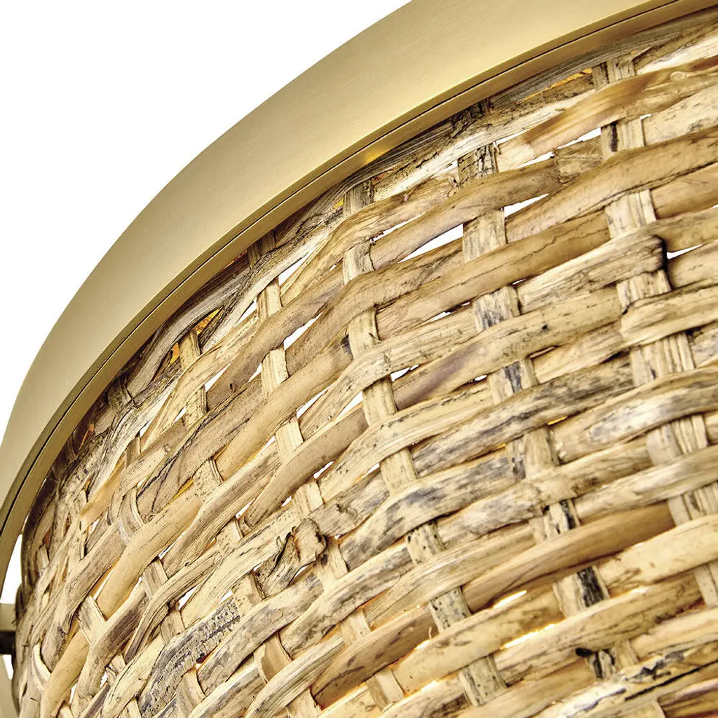Polished details and inviting organic texture give Sanibels basket-woven natural paper shade incredible charm and elevated style. Chic metal trim and decorative chains accentuate the classic round silhouette, enhanced by a refined Lacquered Brass finish.