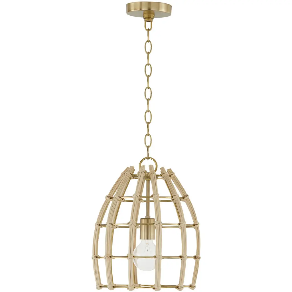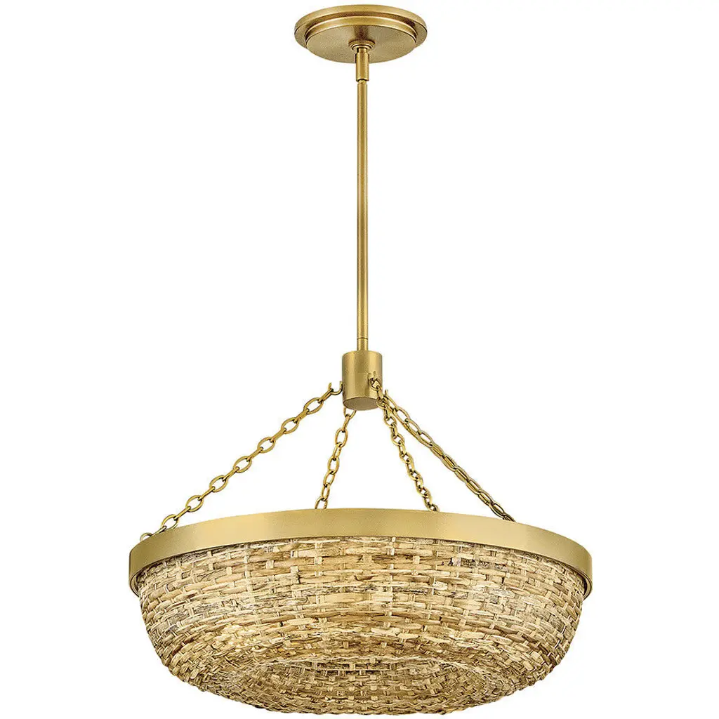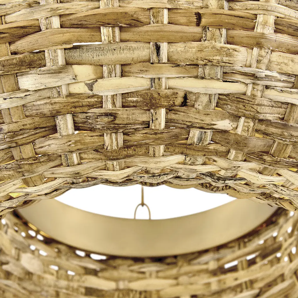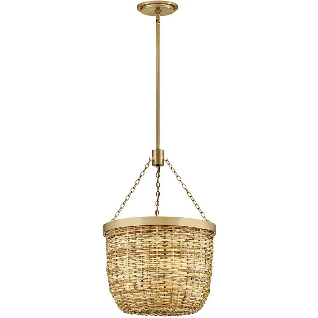 Polished details and inviting organic texture give Sanibels basket-woven natural paper shade incredible charm and elevated style. Chic metal trim and decorative chains accentuate the classic round silhouette, enhanced by a refined Lacquered Brass finish.
