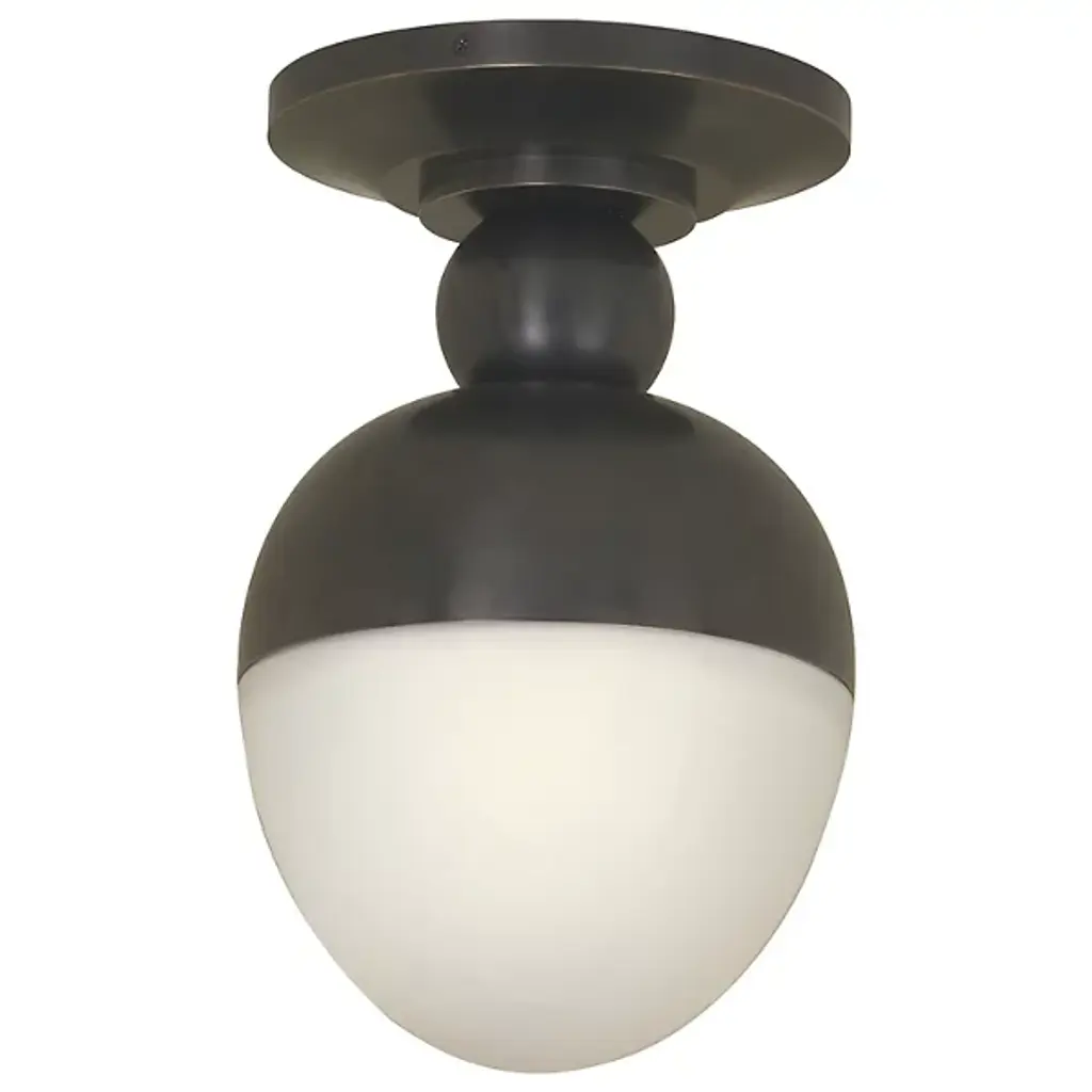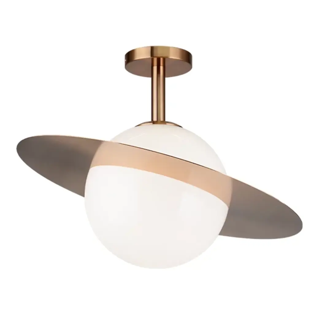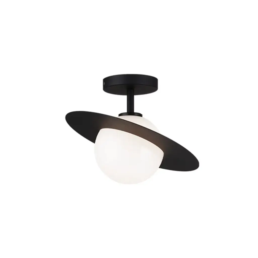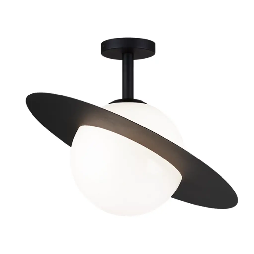 The Saturn Semi-Flushmount by Huxe lends a sleek modern character ideal for use in a wide range of indoor décor. A smooth metal disc forms the fixture’s canopy, sending down a short, central stem to a single candelabra-base lamp below, while a spherical opal glass shade sweeps around the lamping, reducing bright glare to a warm, pleasing glow. A flat ring sweeps around the shade, calling to mind the silhouette of the planet Saturn, and glittering with reflected light above and below the fixture.