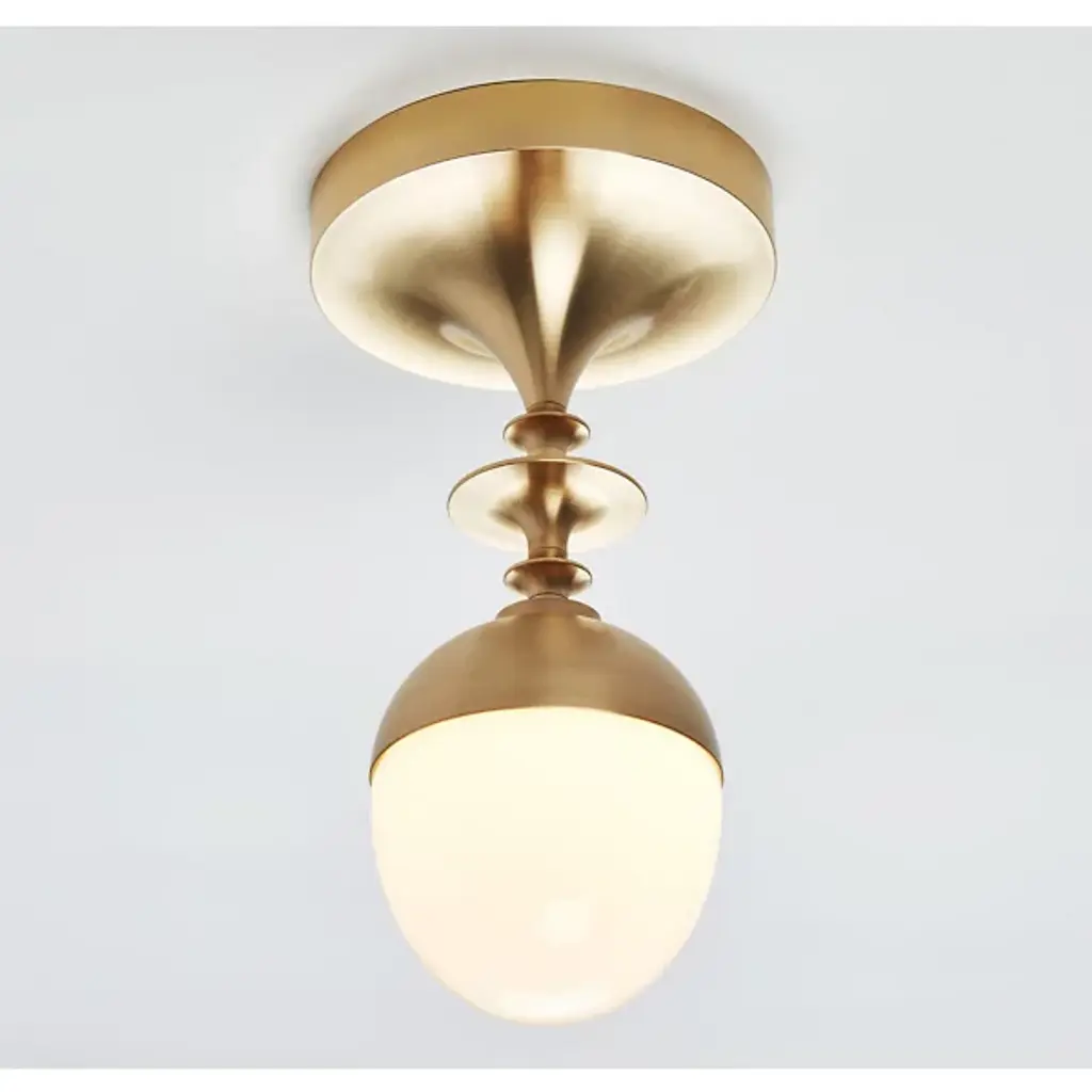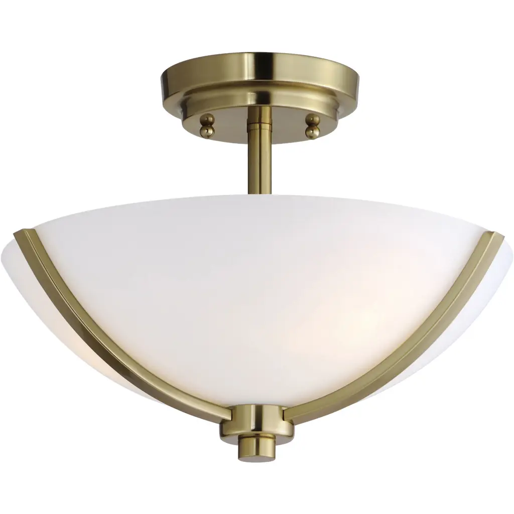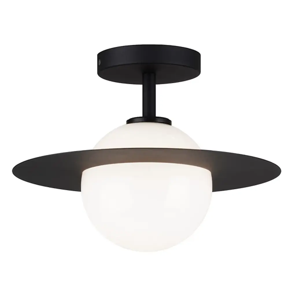 The Saturn Semi-Flushmount by Huxe lends a sleek modern character ideal for use in a wide range of indoor décor. A smooth metal disc forms the fixture’s canopy, sending down a short, central stem to a single candelabra-base lamp below, while a spherical opal glass shade sweeps around the lamping, reducing bright glare to a warm, pleasing glow. A flat ring sweeps around the shade, calling to mind the silhouette of the planet Saturn, and glittering with reflected light above and below the fixture.