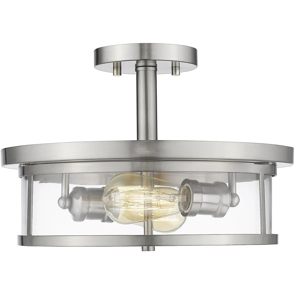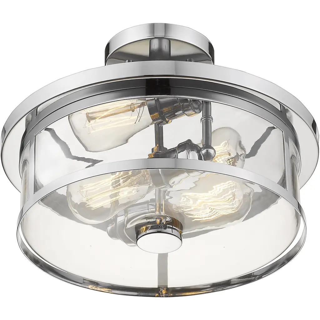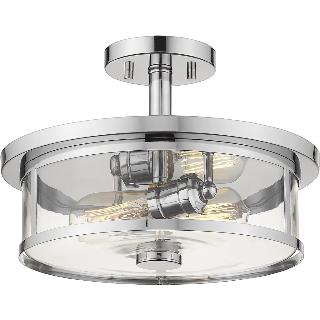 Highlight a mid-century modern style with this contemporary two-light semi flush mount. A luminous chrome finish underscores the clear glass small cylinder shade.
