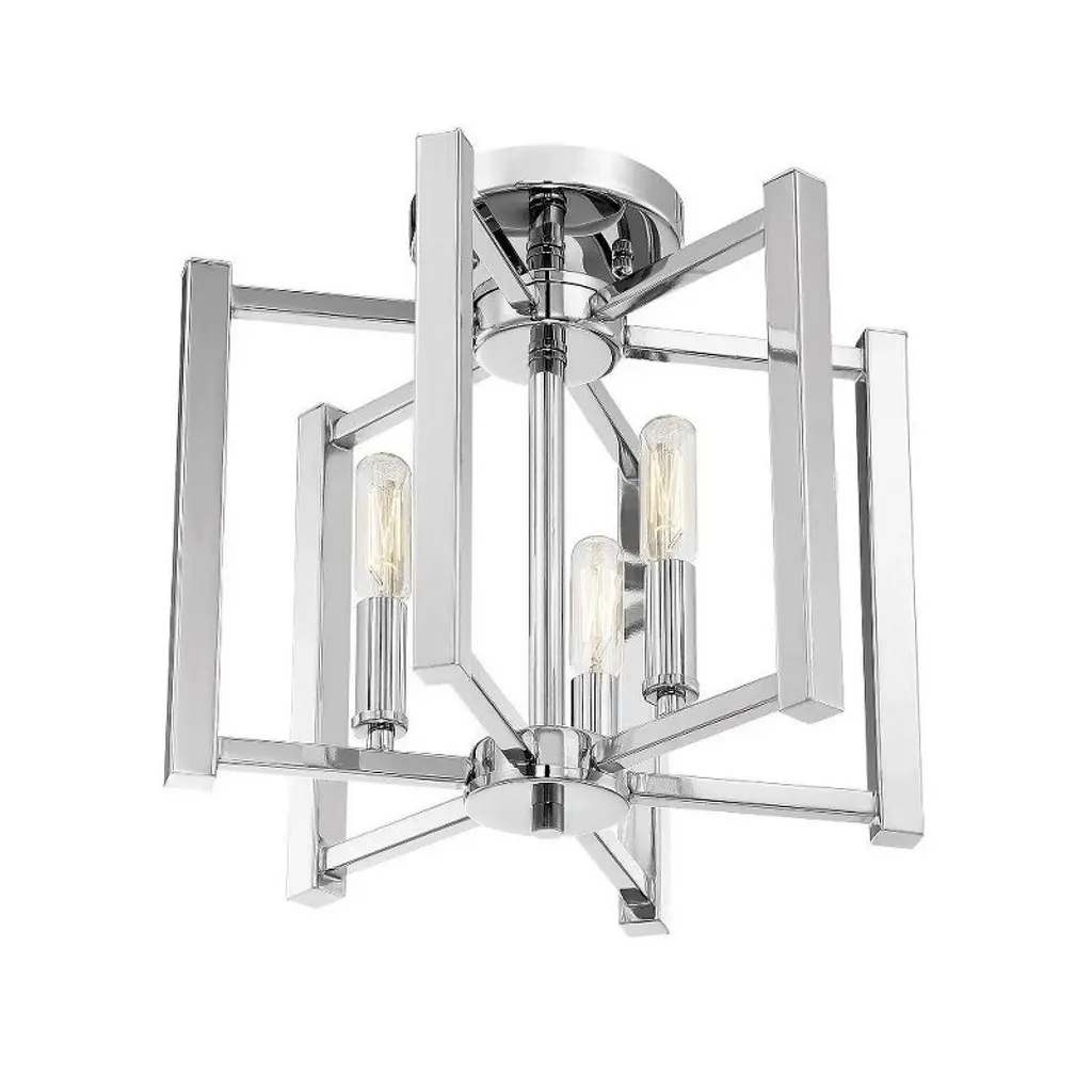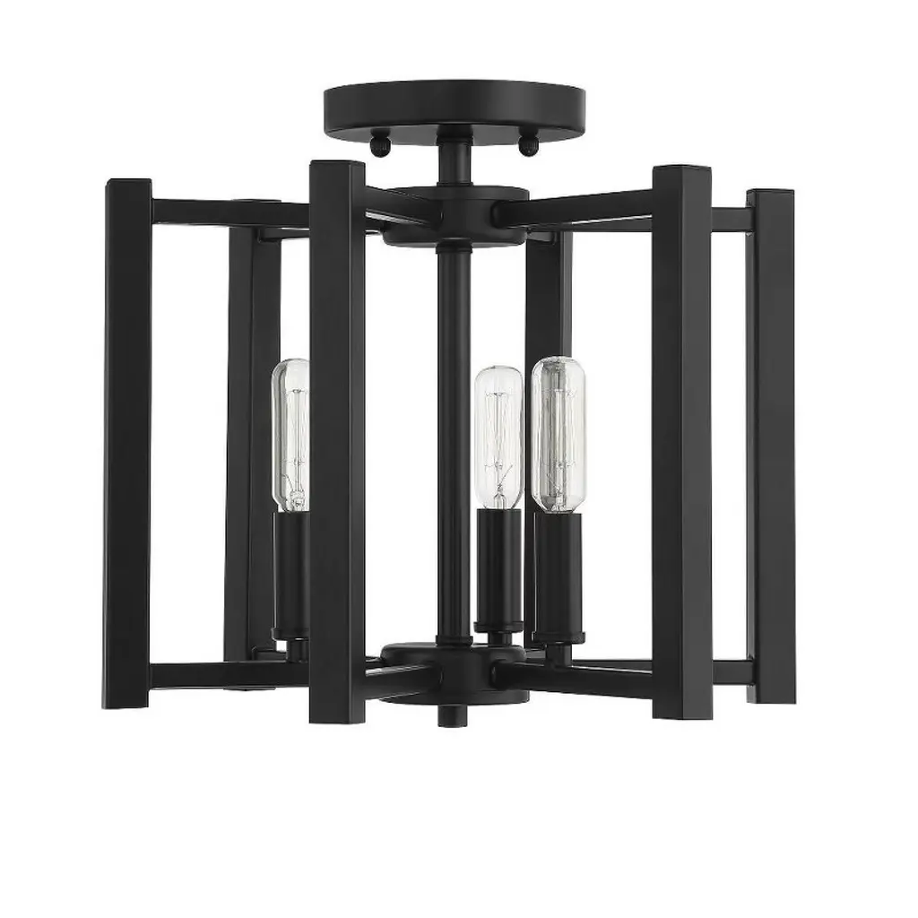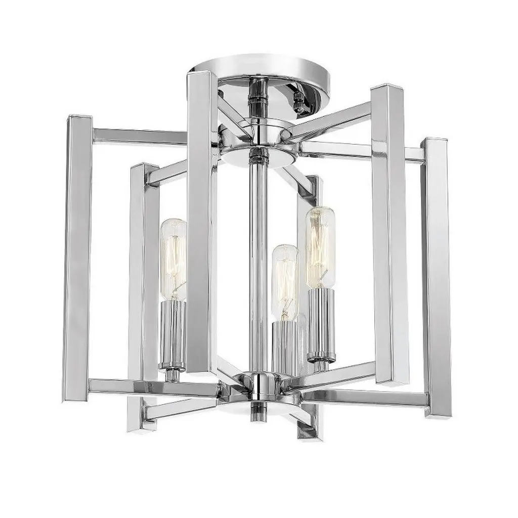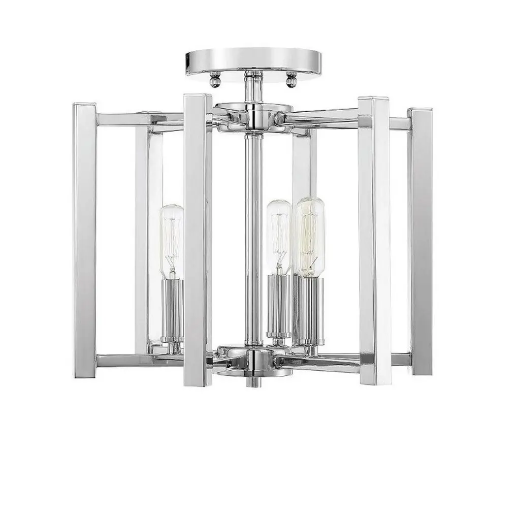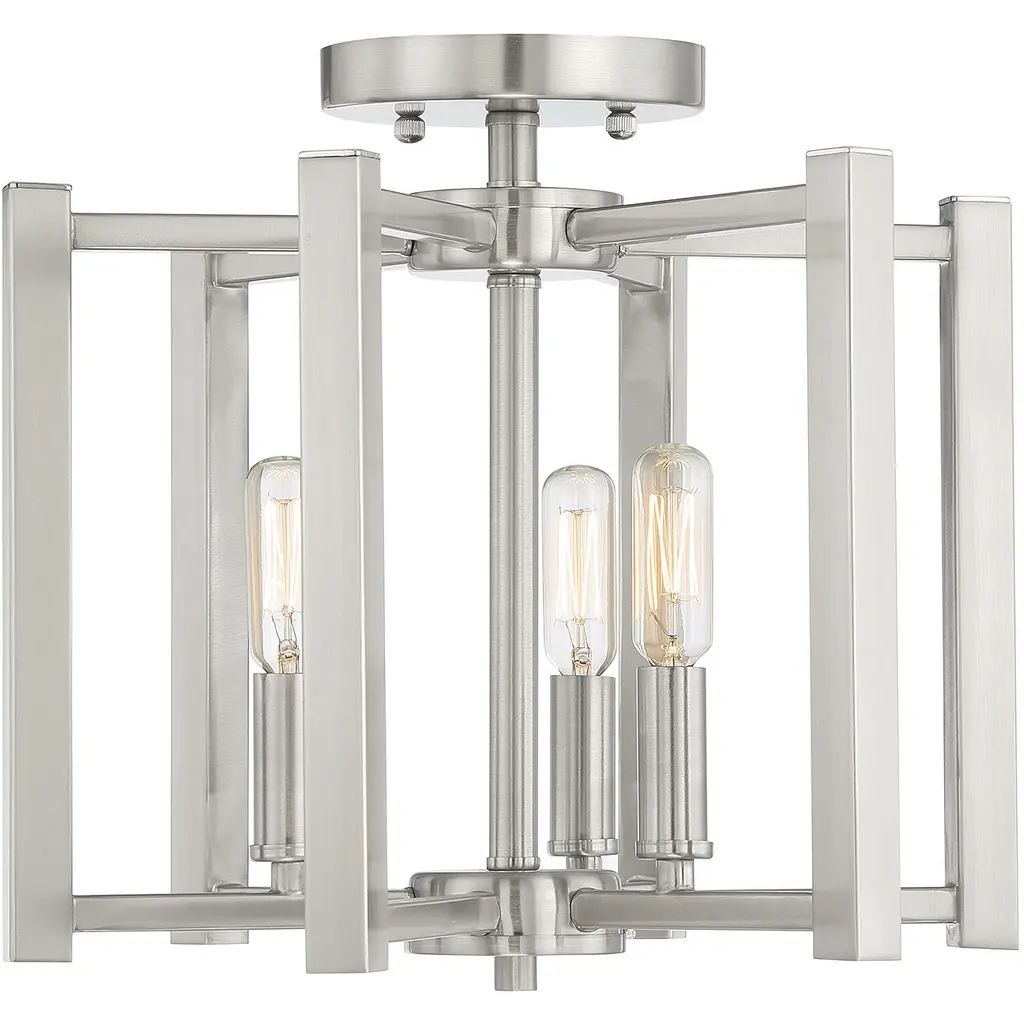 A simple cage with modern flair defines the Benson Collection. This universally flattering three-light semi-flush mount in a satin nickel finish measures 12" high x is 13" wide. It provides ample illumination from three 60-watt candelabra bulbs. Material: Metal, Finish Color: Satin Nickel, Width: 13", Height: 12", Lamping Type: Incandescent, Number Of Bulbs: 3, Wattage: 60 Watts, Dimmable: Yes, Moisture Rating: Dry Rated