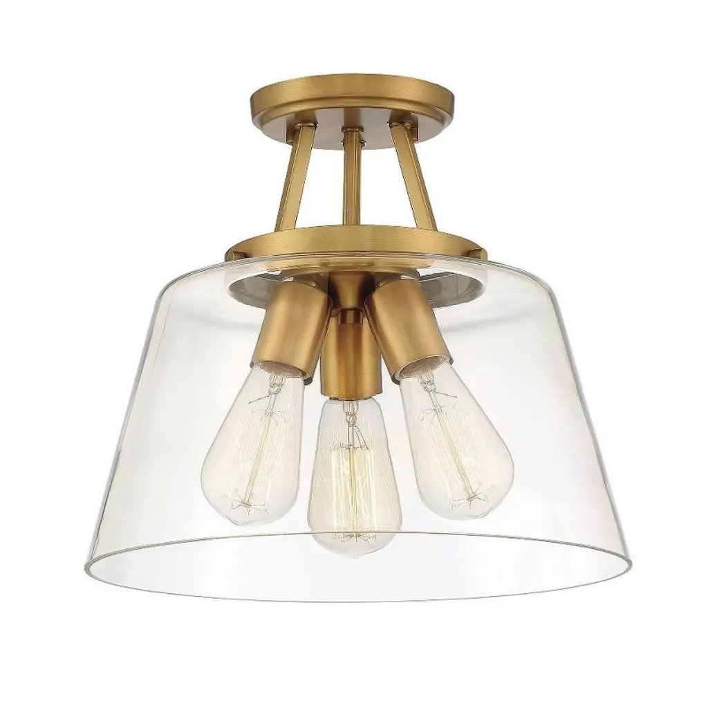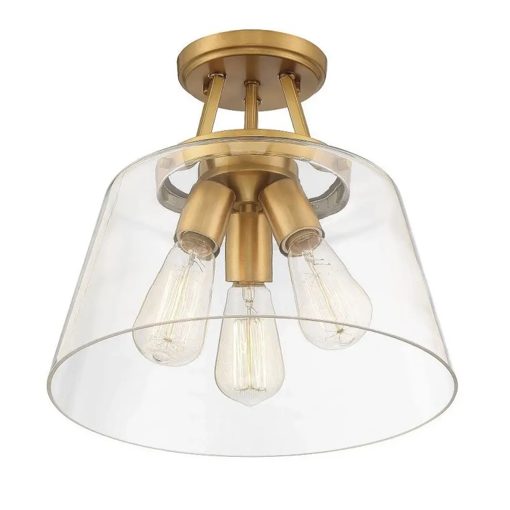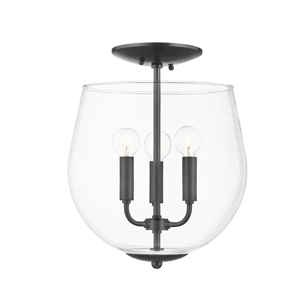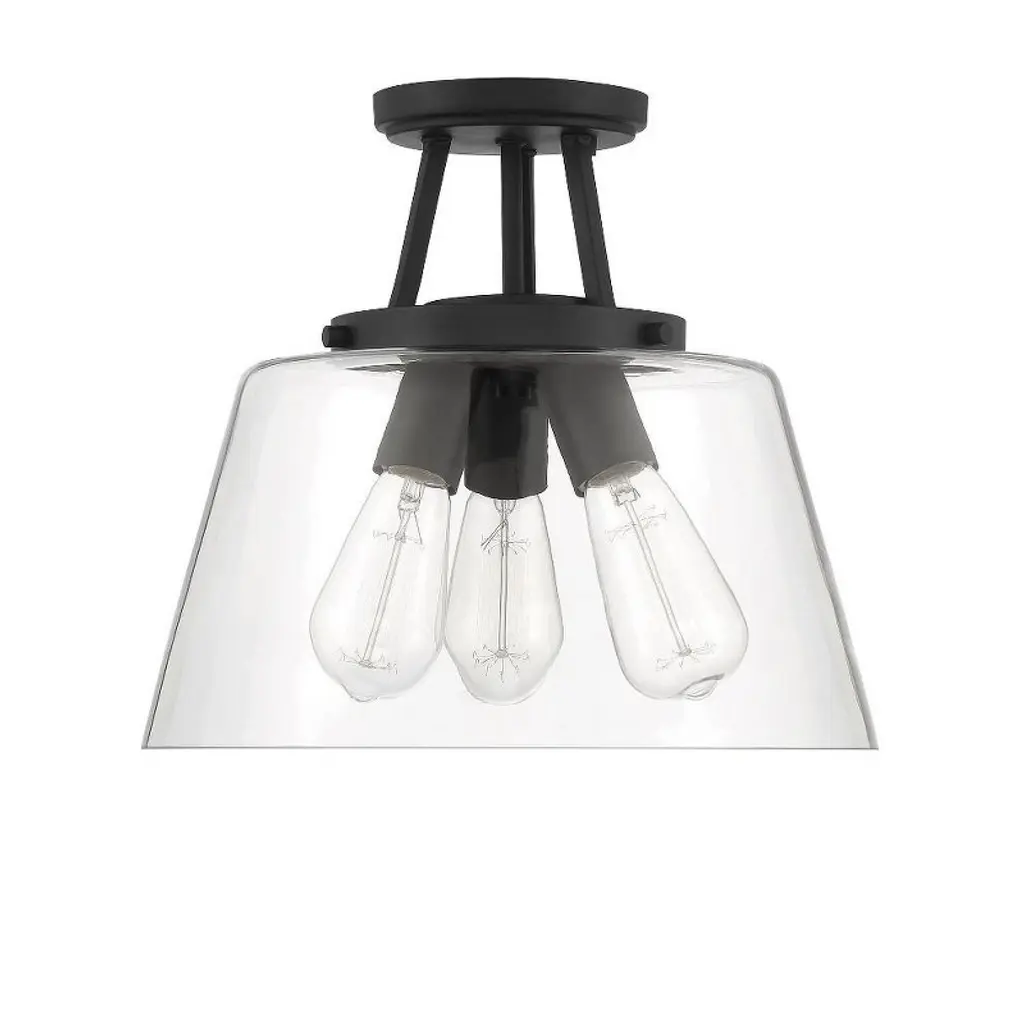 The Calhoun Collection is distinguished by simple lines that can easily enhance transitional and contemporary décor. Measuring 11½" high x 13" wide, this three-light semi-flush mount offers a clean silhouette in a matte black finish and clear glass shades. It is illuminated by three 60-watt Edison-base bulbs. Material: Glass, Finish Color: Matte Black, Width: 13", Height: 11.5", Lamping Type: Incandescent, Number Of Bulbs: 3, Wattage: 60 Watts, Dimmable: Yes, Moisture Rating: Dry Rated
