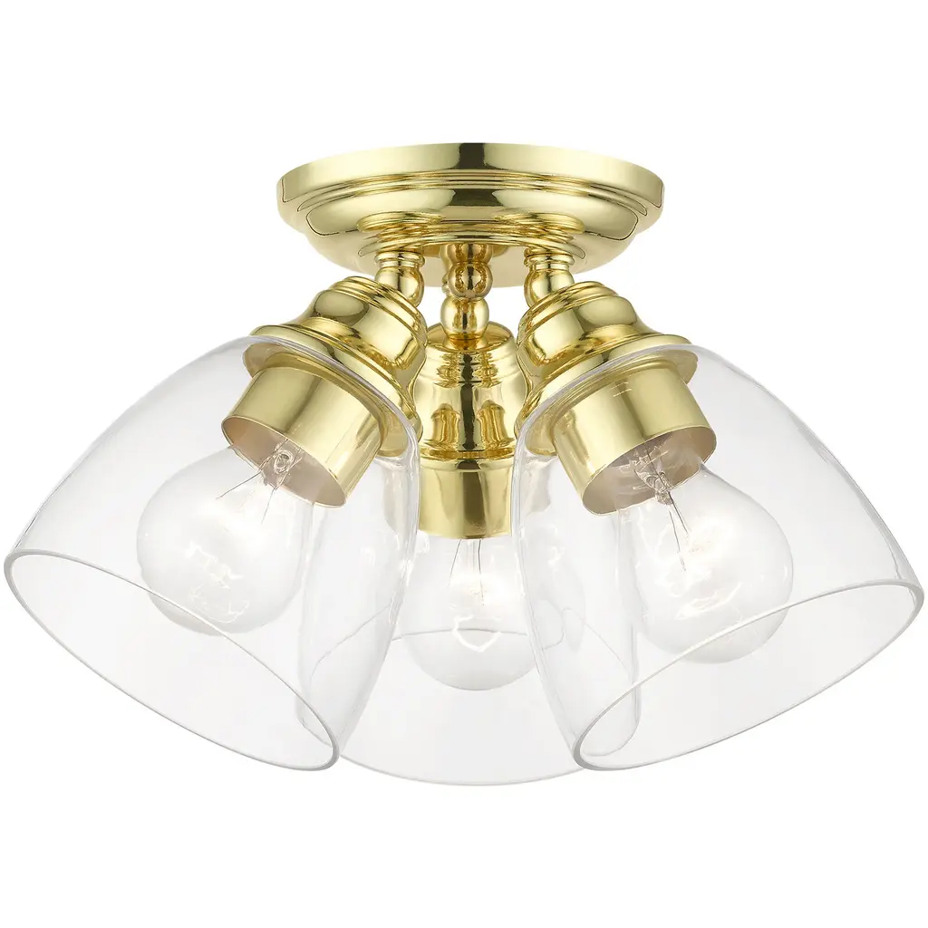 The Calhoun Collection is distinguished by simple lines that can easily enhance transitional and contemporary décor. Measuring 11½" high x 13" wide, this three-light semi-flush mount offers a clean silhouette in a warm brass finish and clear glass shades. It is illuminated by three 60-watt Edison-base bulbs. Material: Glass, Finish Color: Warm Brass, Width: 13", Height: 11.5", Lamping Type: Incandescent, Number Of Bulbs: 3, Wattage: 60 Watts, Dimmable: Yes, Moisture Rating: Dry Rated