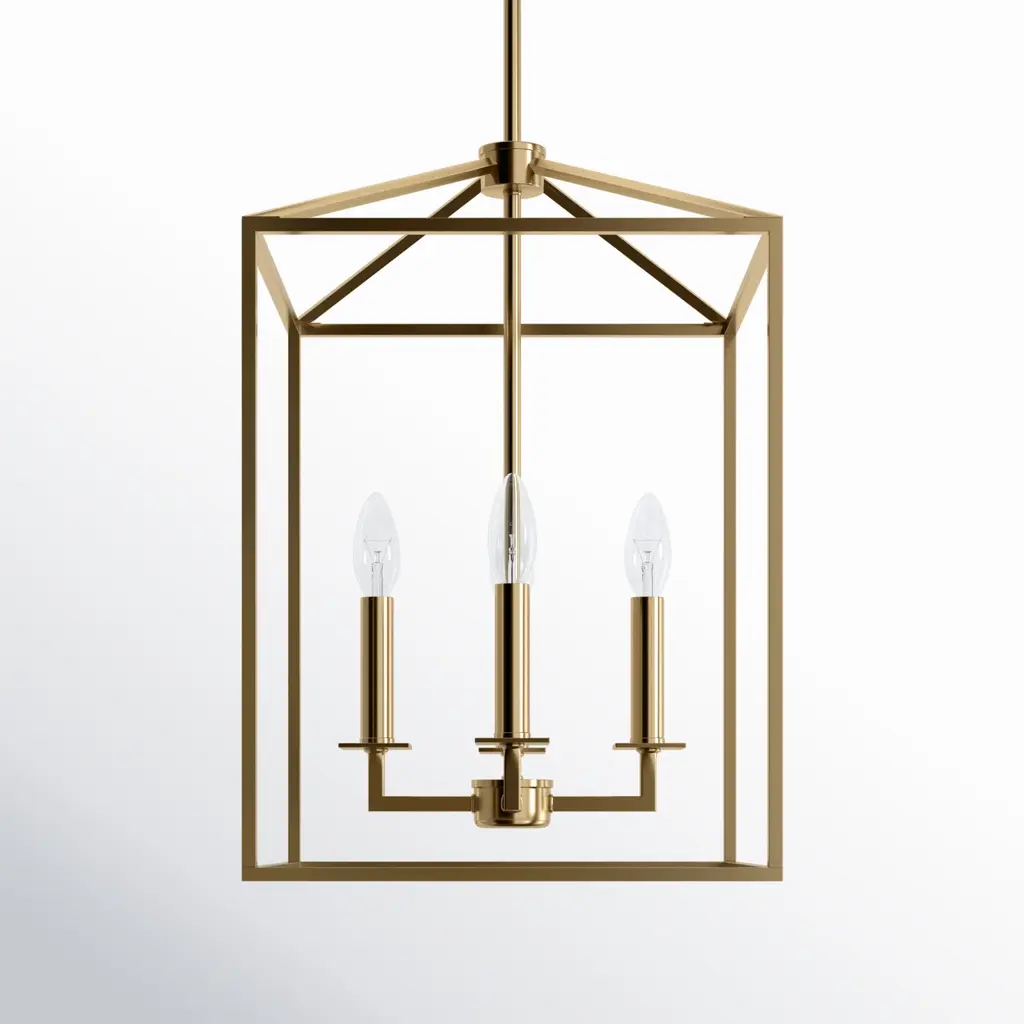 When you have a traditional aesthetic, and want to inject a sense of modernism, choose this Townsend ceiling fixture. It’s a classic lantern style with the familiar, vintage appeal of colonial or old English candle fixtures —but the open geometric frame and bright, warm brass finish create a delightful contemporary twist. This timeless quality blends very well with your traditional, transitional, bohemian, contemporary, or modern farmhouse decor. Four lights within the open framework have metal candle covers and hold 60W, C-style bulbs. The fixture is 13” wide and 13” high, with a semi-flush mounting: a superb fit for your dining room, kitchen, living room, entryway, bedroom, closet, family room, office, stairway, or great room.