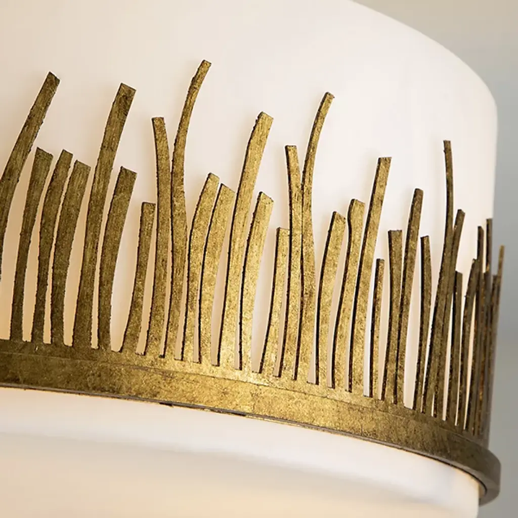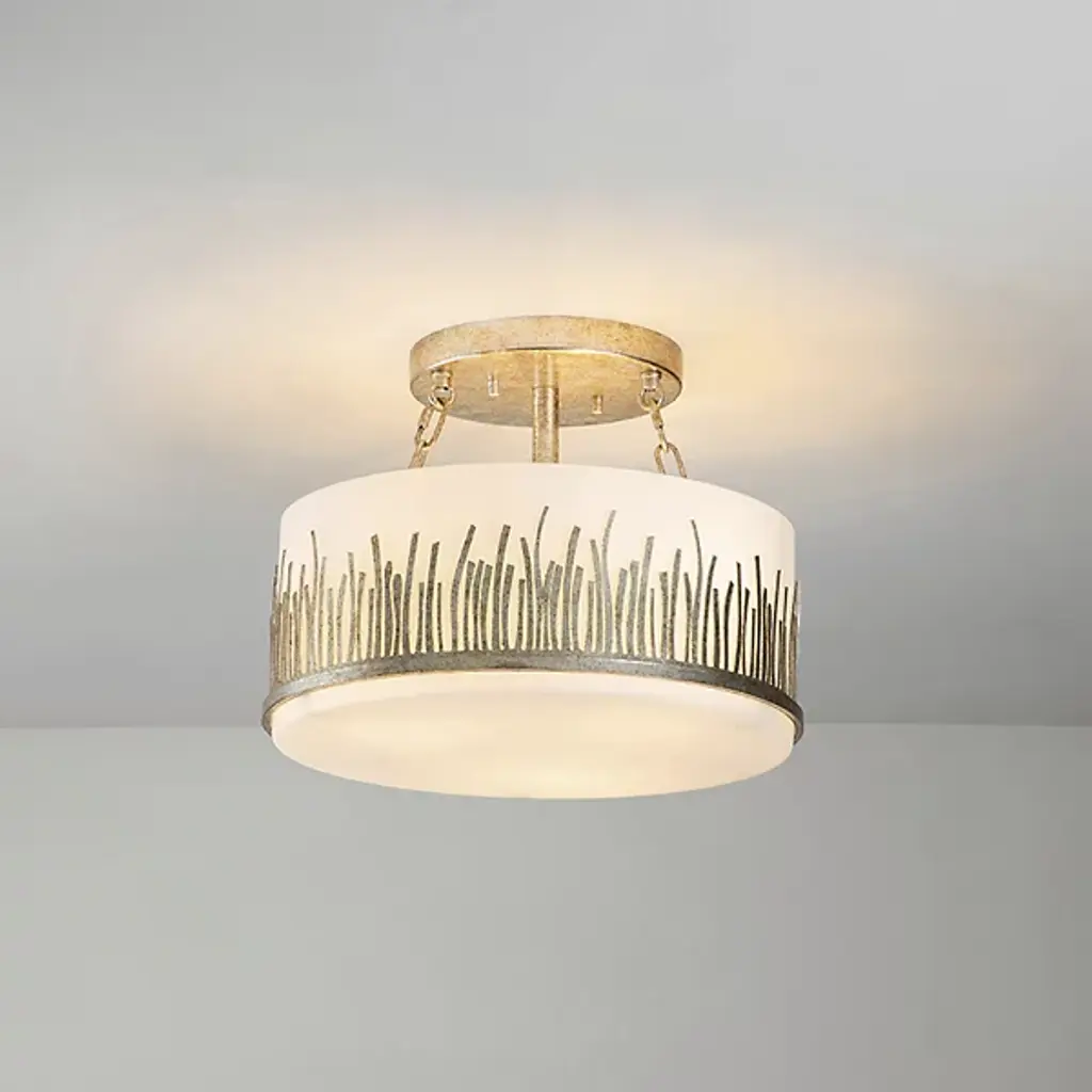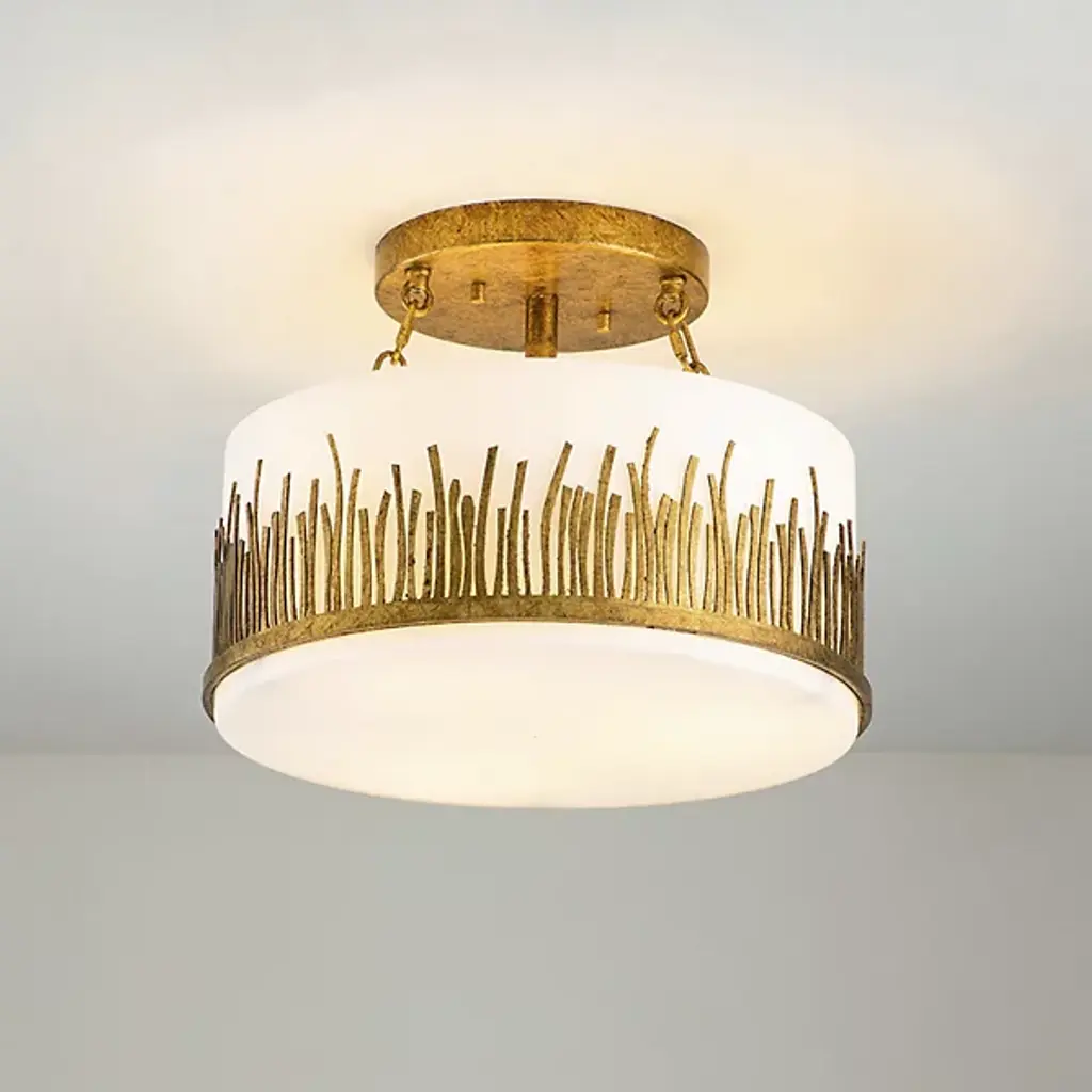 The soft, feathered, and artful personality of natural sawgrass inspires the elegant design of the Sawgrass Semi-Flushmount from Lucas McKearn. It sets itself apart with a grand metal structure. Following a ring framework, linear accents vary in size and movement to suggest the familiar grass. A glass drum shade adds an ultra-clean backdrop to the ornate design. Light escapes from it with warmth and dimension.