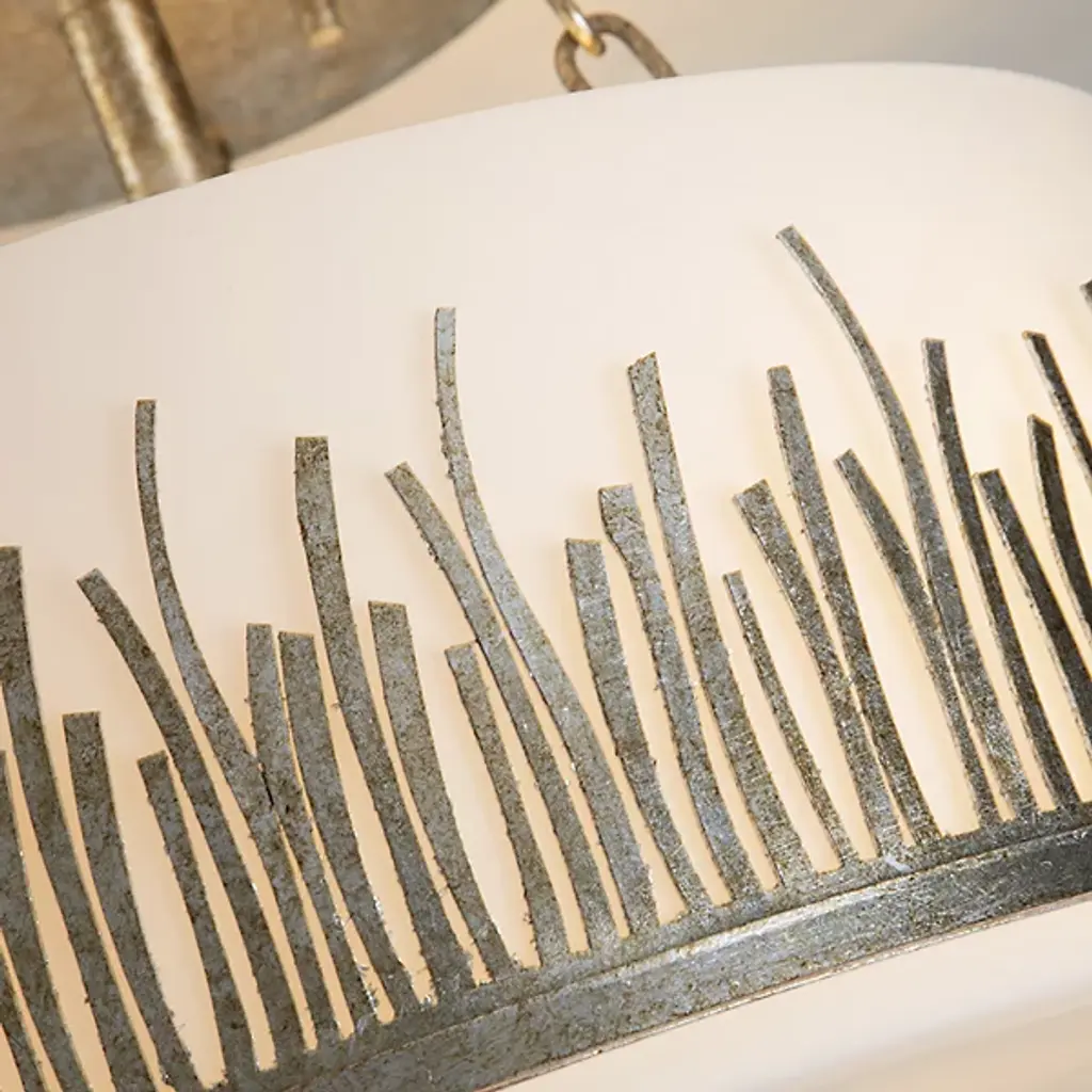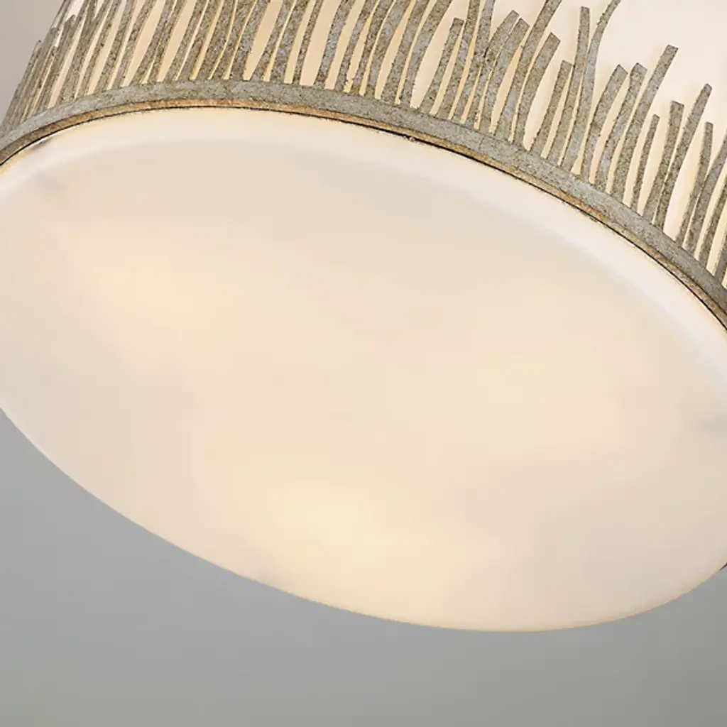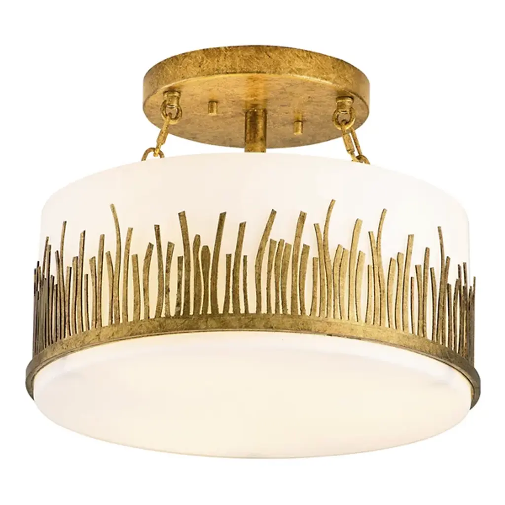 The soft, feathered, and artful personality of natural sawgrass inspires the elegant design of the Sawgrass Semi-Flushmount from Lucas McKearn. It sets itself apart with a grand metal structure. Following a ring framework, linear accents vary in size and movement to suggest the familiar grass. A glass drum shade adds an ultra-clean backdrop to the ornate design. Light escapes from it with warmth and dimension.