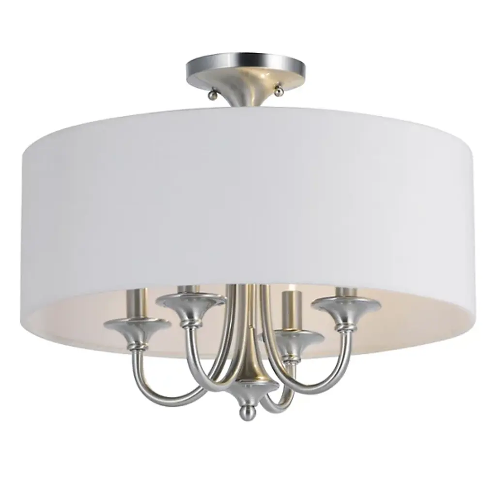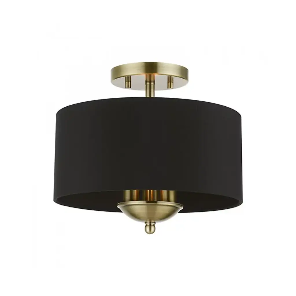 The Schwartz Semi-Flushmount from Alder & Ore adds a regal transitional presence to low-ceilinged spaces. Starting with a smooth, low-profile canopy, it drops a slender downrod to a bowl-shaped hub sporting elegant accenting. The hub seats candle-style lamp holders behind a dressy drum shade of hardbacked fabric. This soft textured shade contrasts beautifully with the handsome metal inside it. The spacious shade gentles bright glare into a filtered ambient glow and a streaming wash of comfortable downlighting.