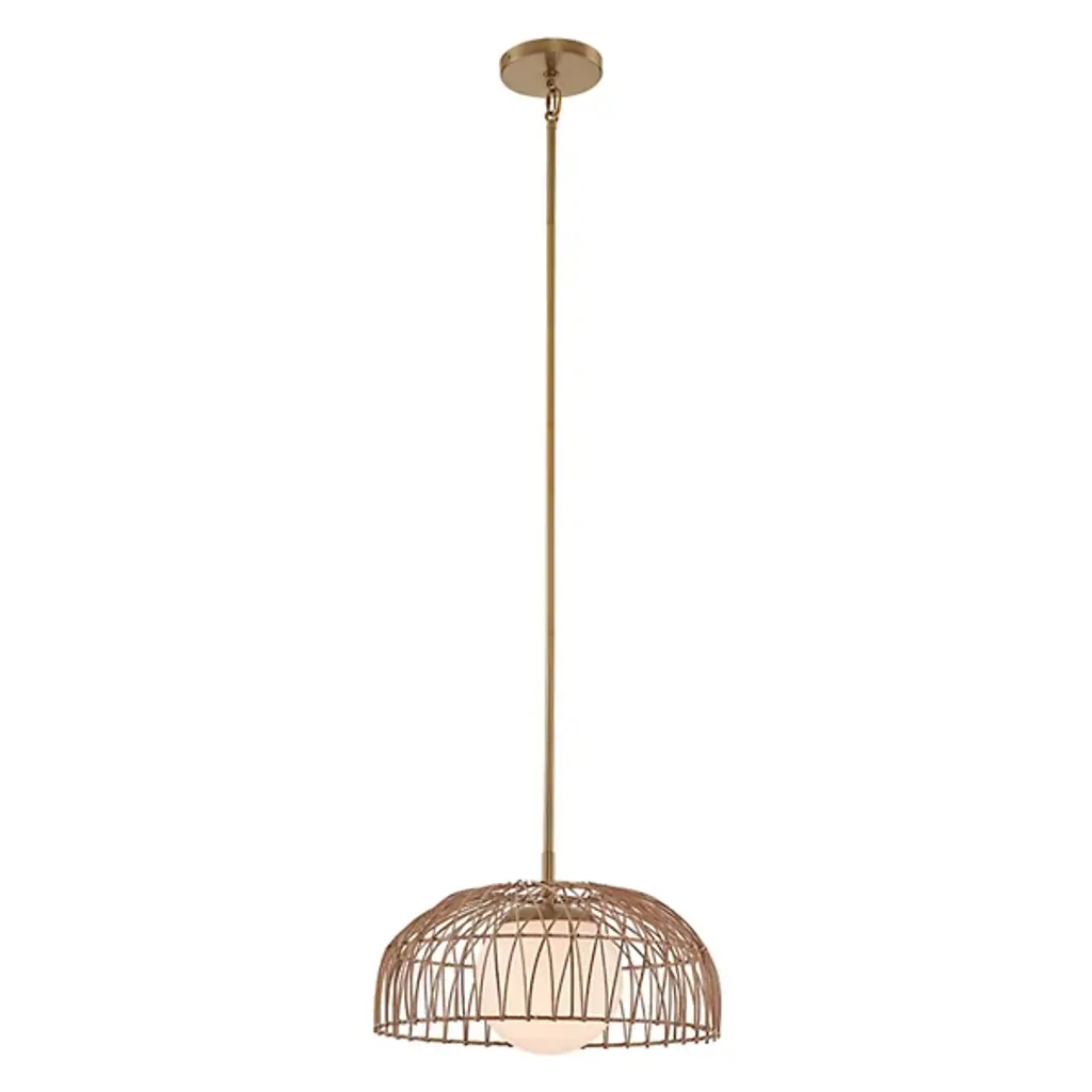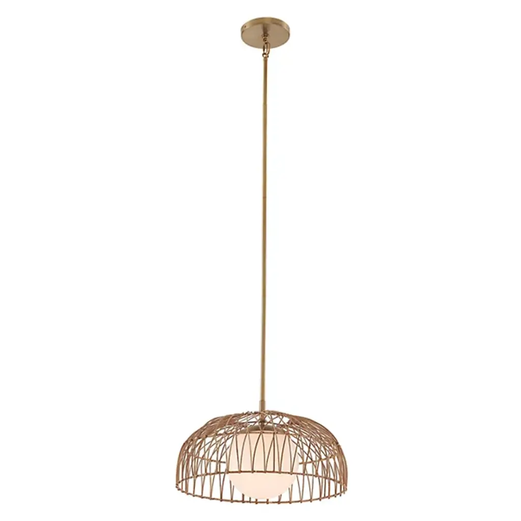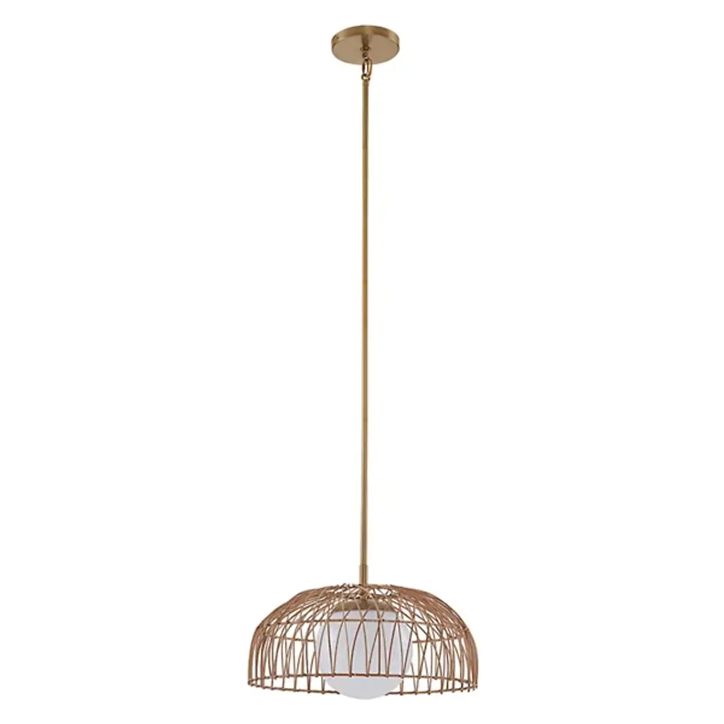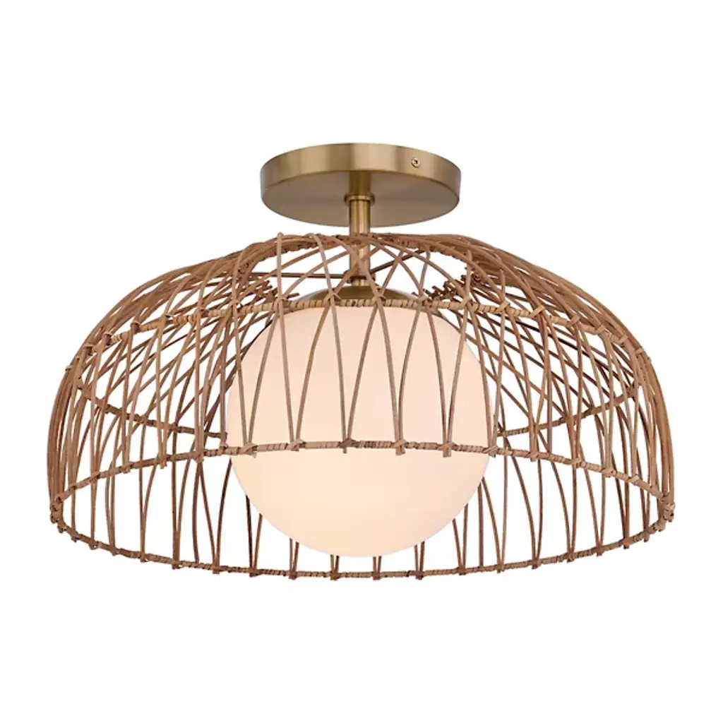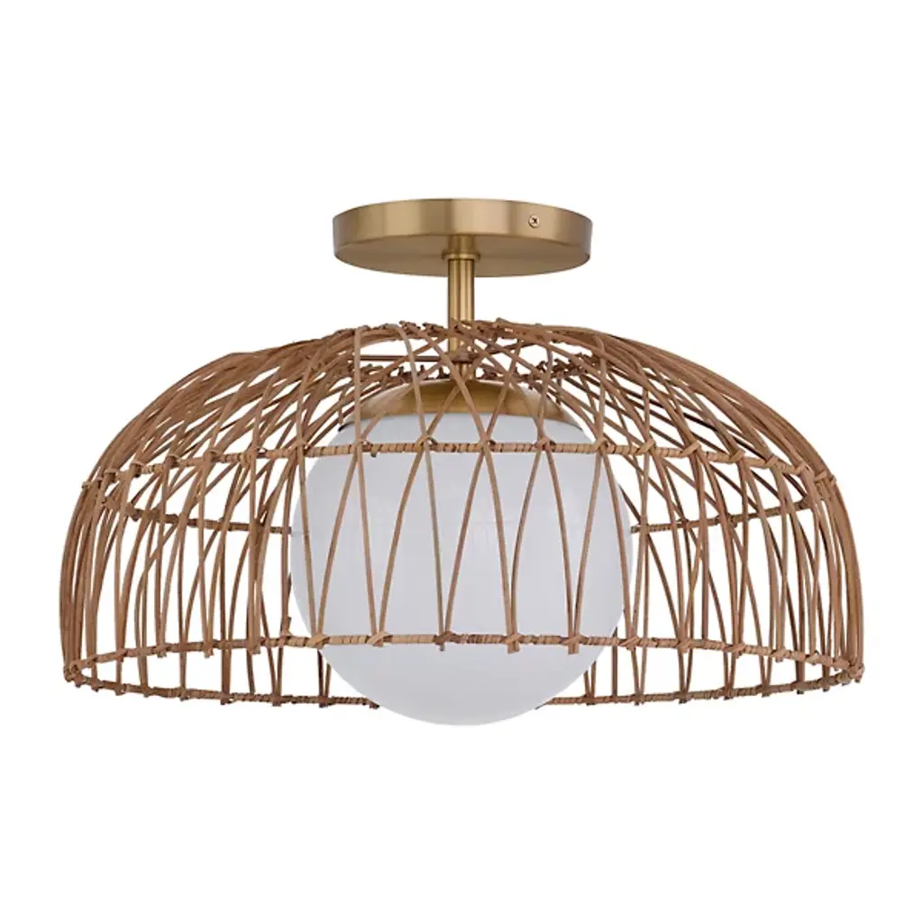 The Shanti Semi-Flushmount / Pendant from Alder & Ore delights with an open design, descending from a disc canopy along a slender central stem, showcasing lamping beneath a dome-shaped wicker shade. An inset translucent glass sphere diffuser softens the light, creating a warm and inviting ambiance. The metal fixture embodies a transitional style with softer classic and traditional design elements, adding a bohemian charm to any space.