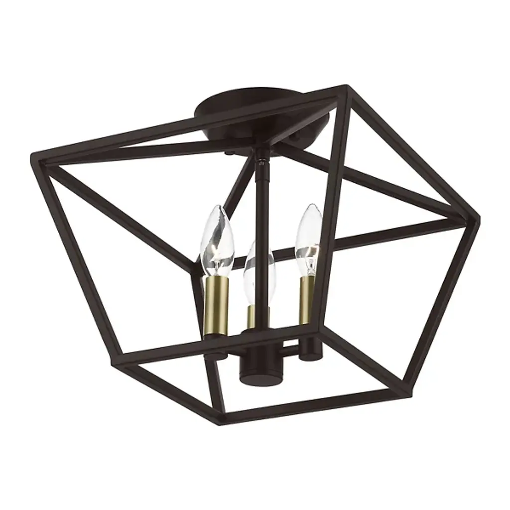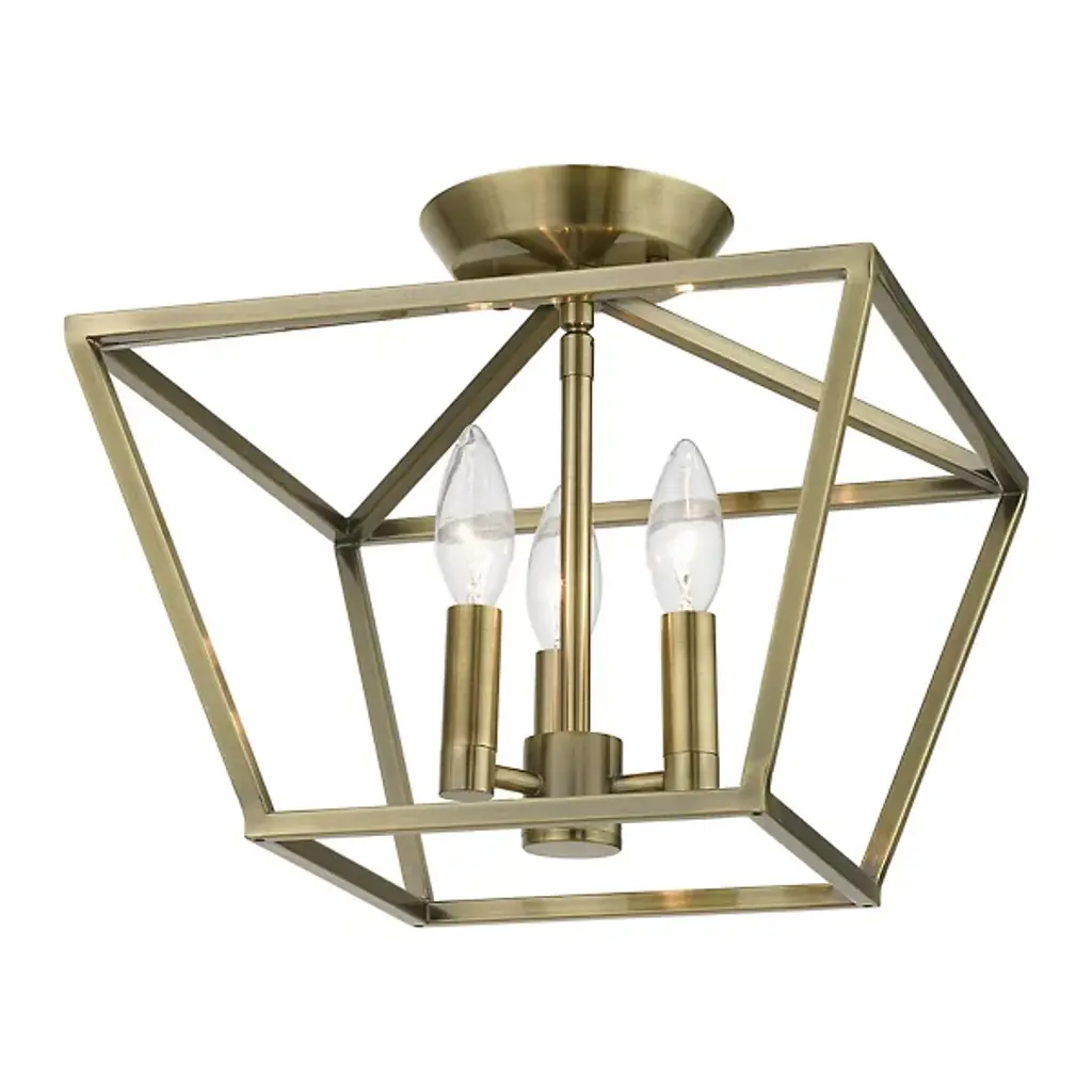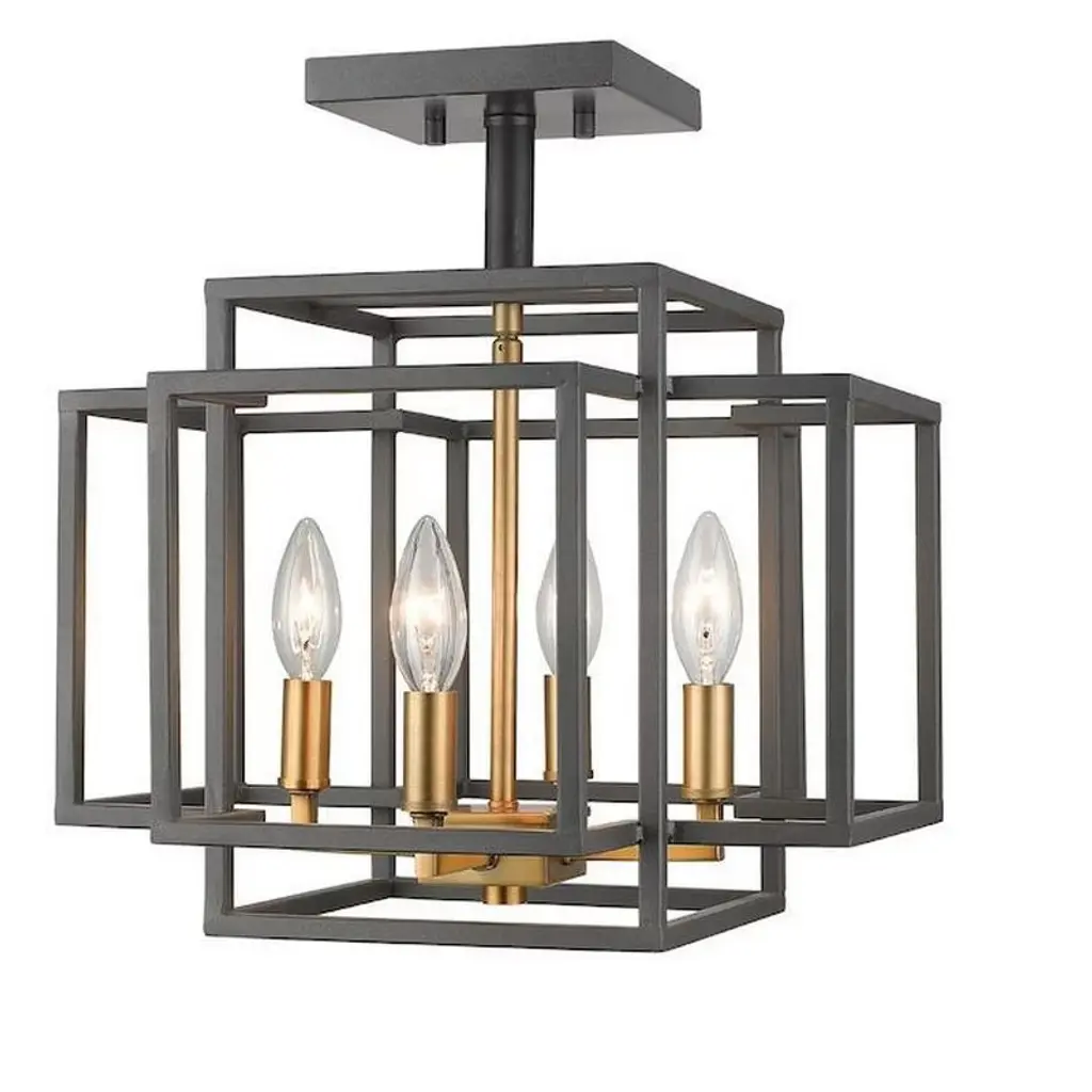 Lend stately appeal to interiors with the Shasta Semi-Flushmount from Alder & Ore. A transitional design starting with a beveled disc canopy, it dispatches a central downrod to candelabra lamping below. A trapezoidal frame extends out around the lamping, adding an elegant, angular accent, casting sharp-cornered shadows around the fixture when illuminated.