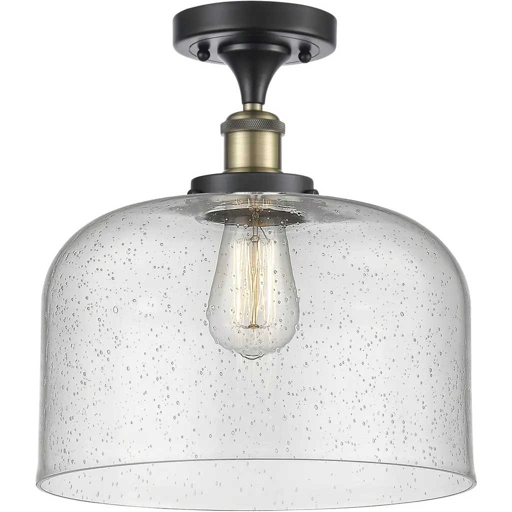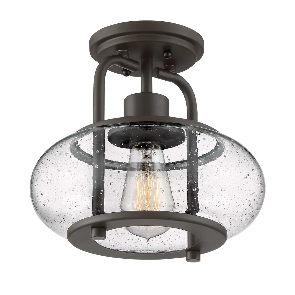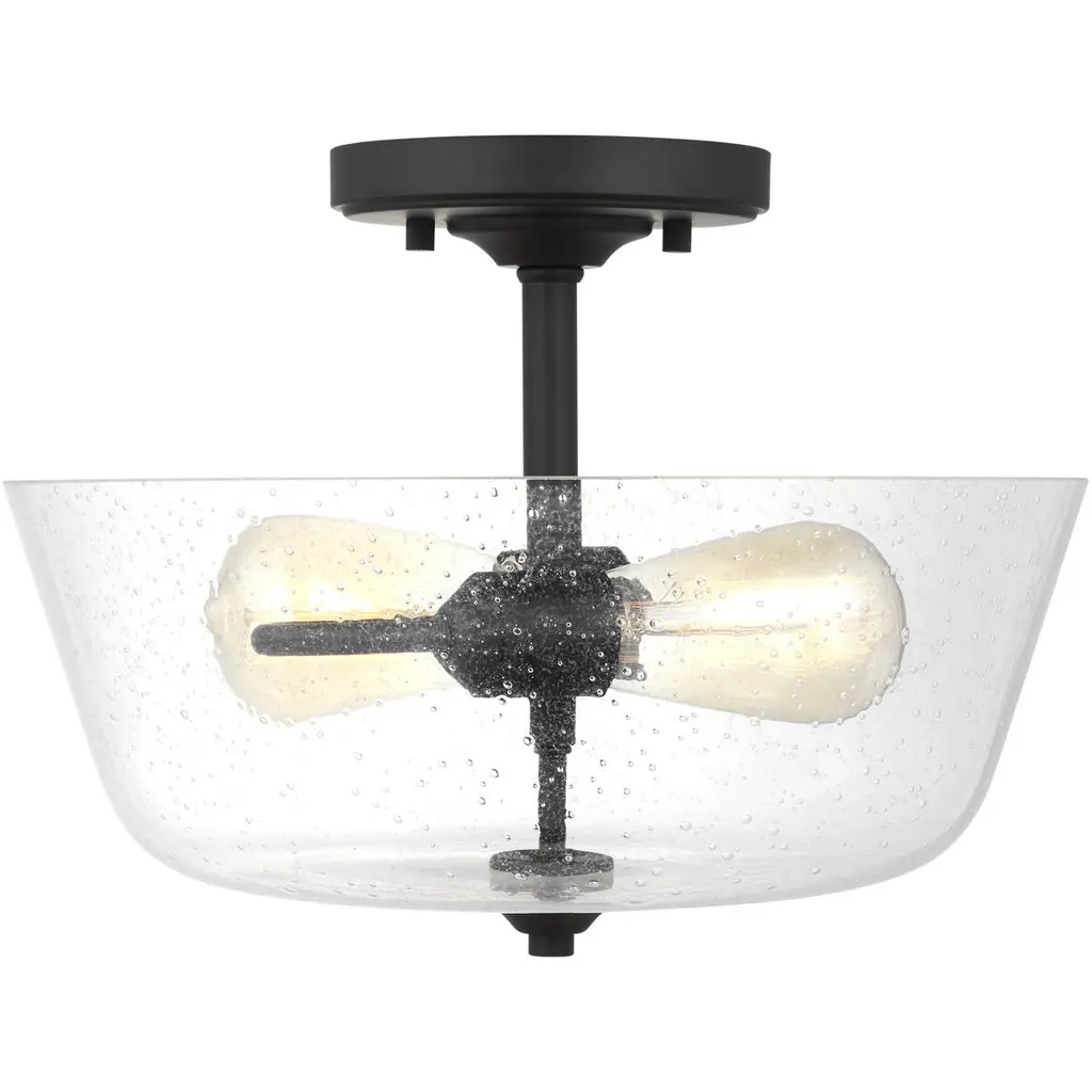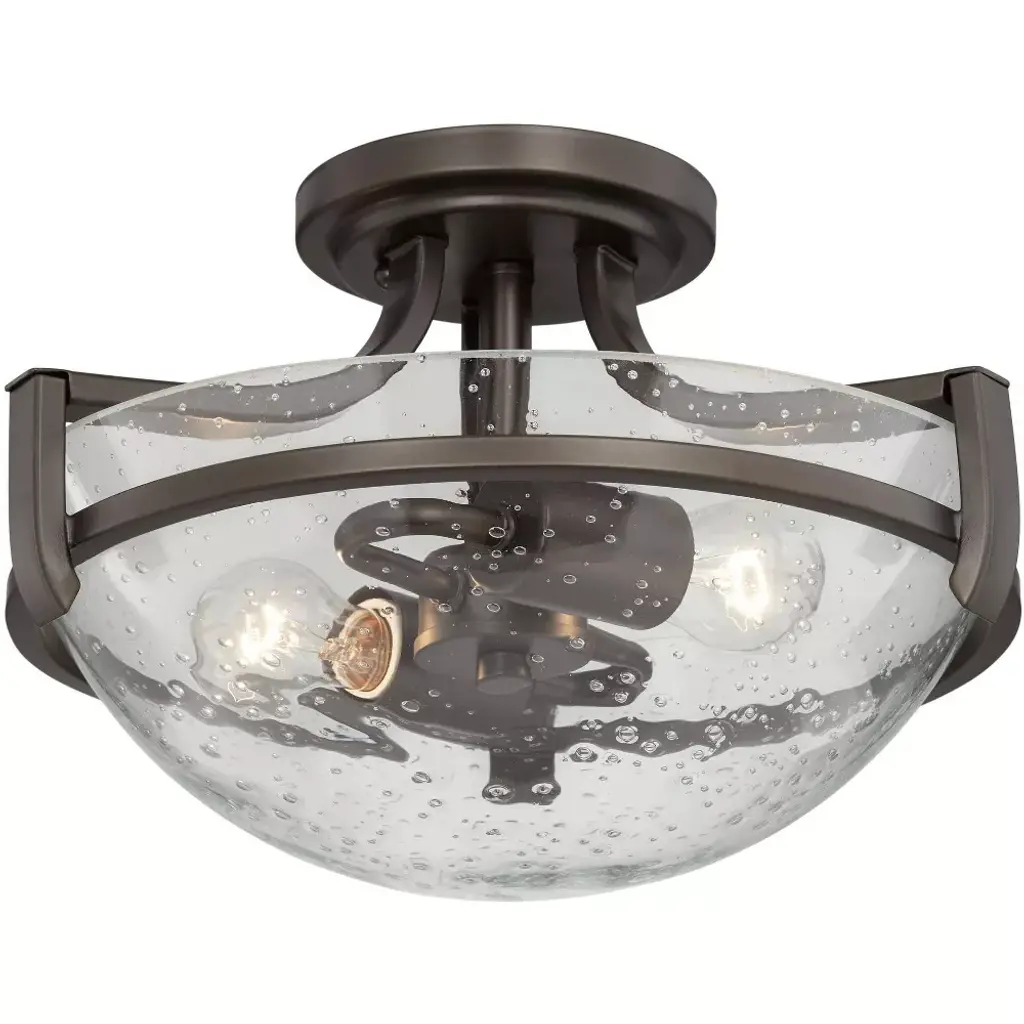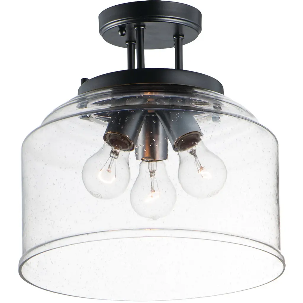 The Shyloh Semi-Flushmount from Minka-Lavery extends a tasteful transitional presence to its surroundings. A sleek disc canopy secures the fixture, extending a slender stem to two side-oriented, damp-listed sockets below set in opposition to each other. A stepped conical finial caps off the stem, anchoring an upward-flaring glass shade steadied by three outward-curving arms, which mellows direct glare from the sides to an even glow, accented by the indirect wash of light expressed above through the diffuser’s open top.