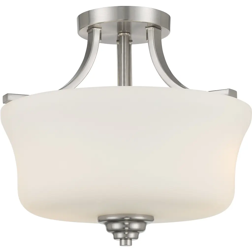 The Shyloh Semi-Flushmount from Minka-Lavery extends a tasteful transitional presence to its surroundings. A sleek disc canopy secures the fixture, extending a slender stem to two side-oriented, damp-listed sockets below set in opposition to each other. A stepped conical finial caps off the stem, anchoring an upward-flaring glass shade steadied by three outward-curving arms, which mellows direct glare from the sides to an even glow, accented by the indirect wash of light expressed above through the diffuser’s open top.