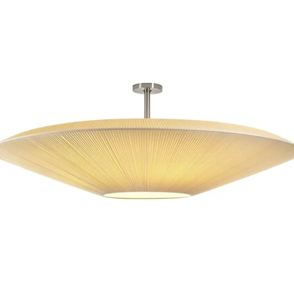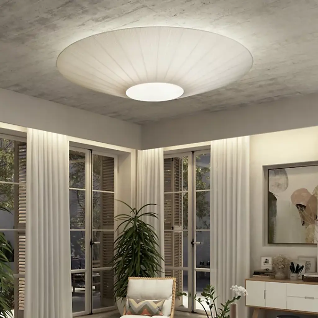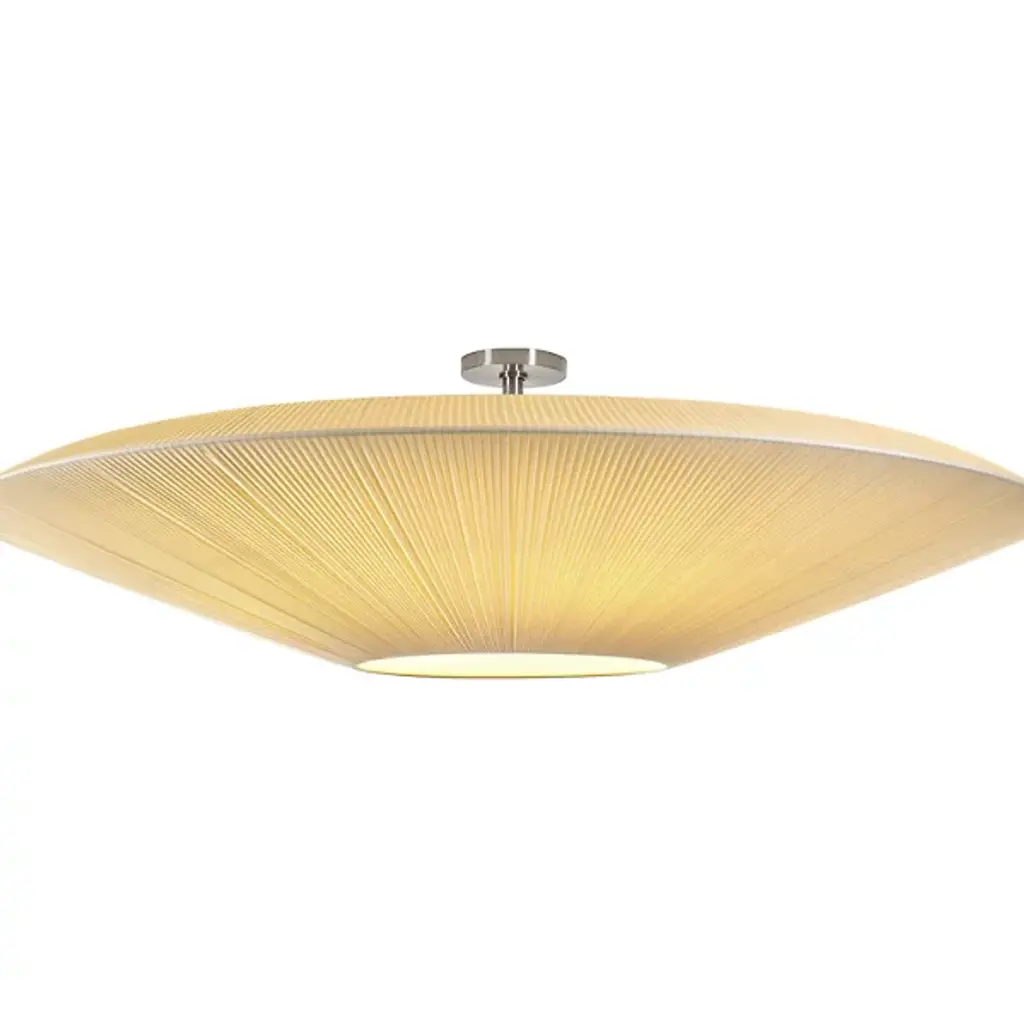 Visually echoing a cross between paper lanterns and interplanetary spacecraft, the Bover Siam 03 Semi-Flushmount is a convex ring of hand wrapped polyester ribbon. The translucent fabric and frosted diffuser work in tandem to provide warm diffused illumination. Available in two size options, the diameter of each is identical, but the suspension length's differ due to varying stem heights. The large option has the longer stem length, and floats further away from the ceiling.