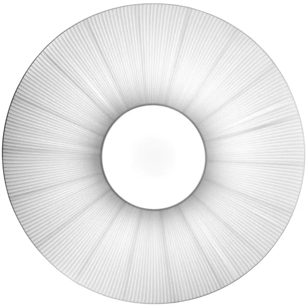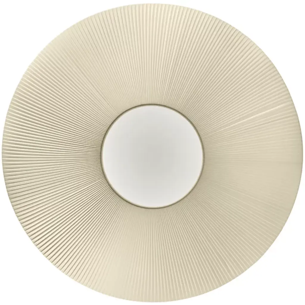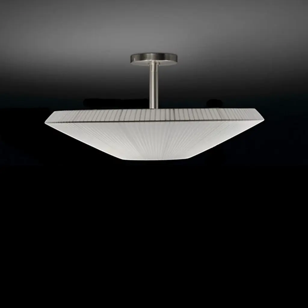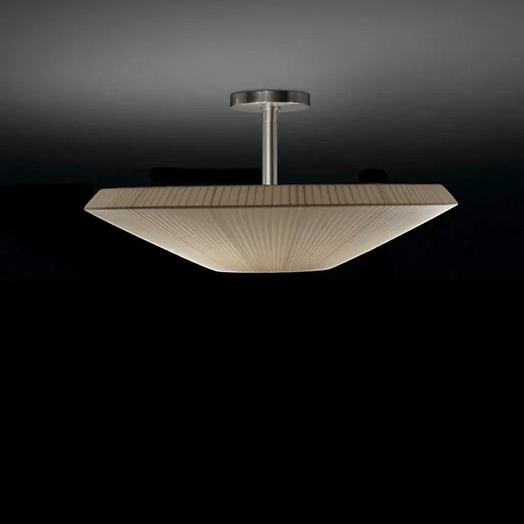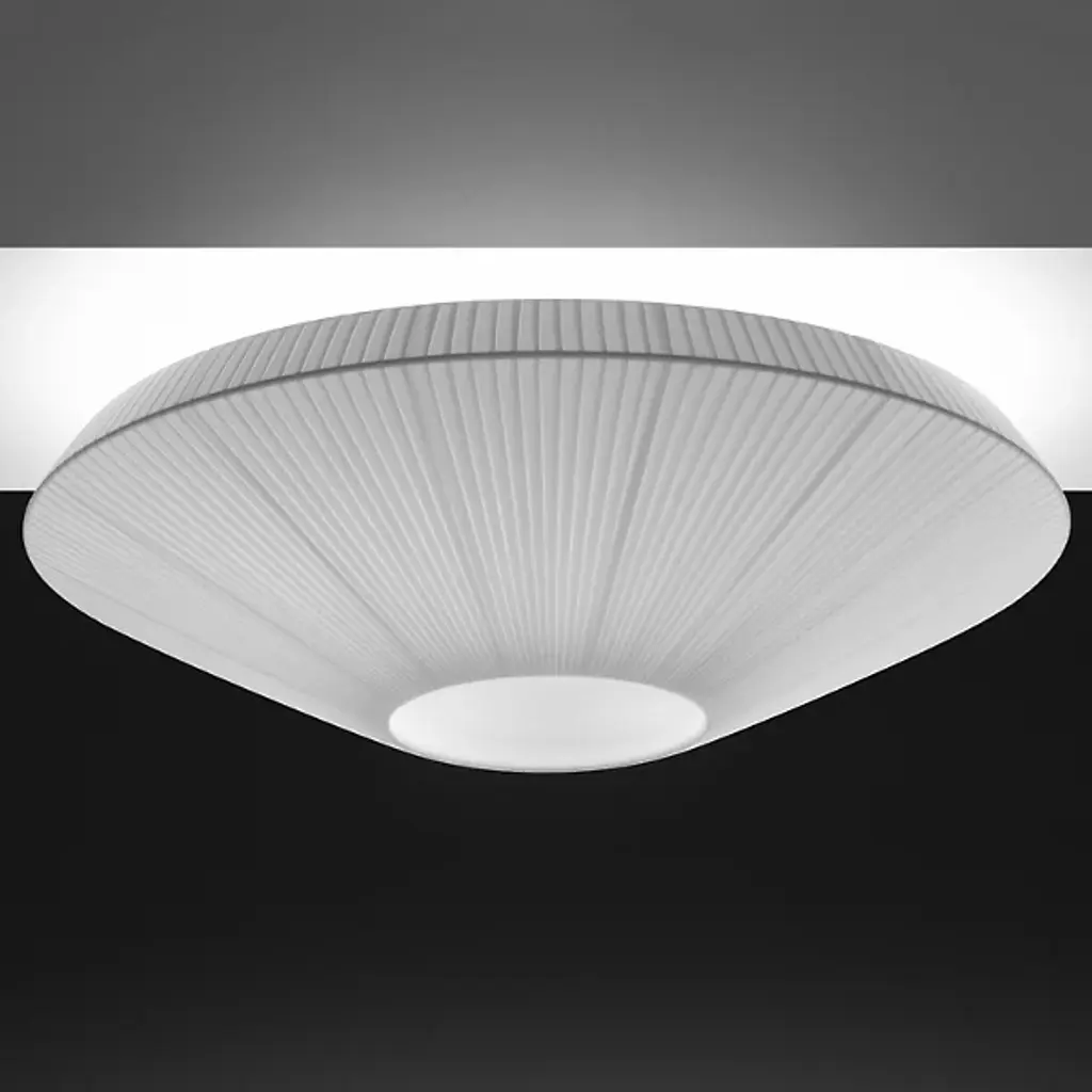Visually echoing a cross between paper lanterns and interplanetary spacecraft, the Bover Siam Medium Semi-Flushmount is a convex ring of hand wrapped polyester ribbon. The translucent fabric and frosted diffuser work in tandem to provide warm diffused illumination. Available in two size options, the diameter of each is identical, but the suspension length's differ due to varying stem heights. The large option has the longer stem length, and floats further away from the ceiling.