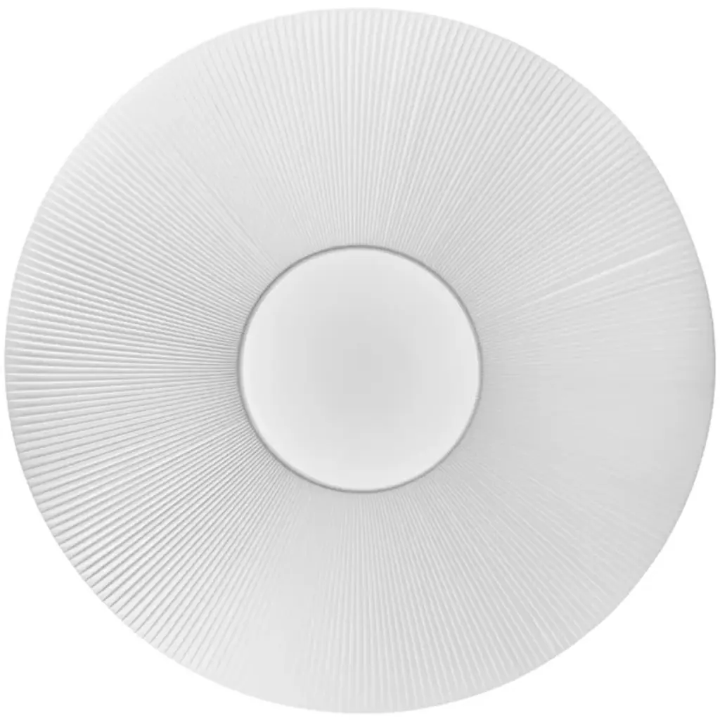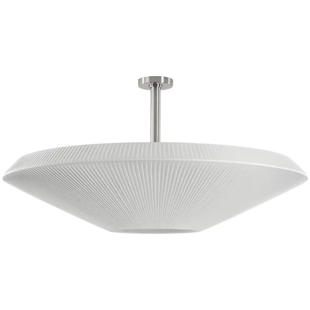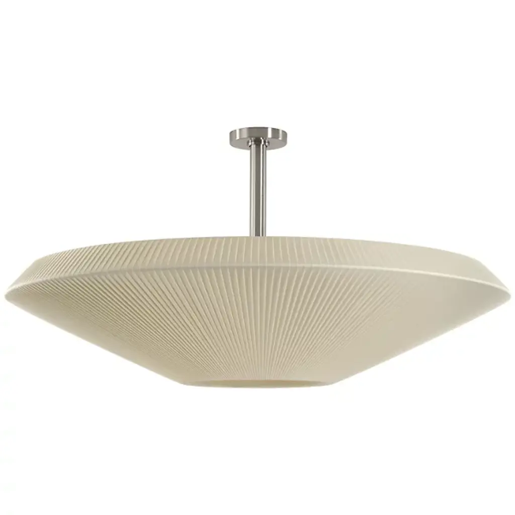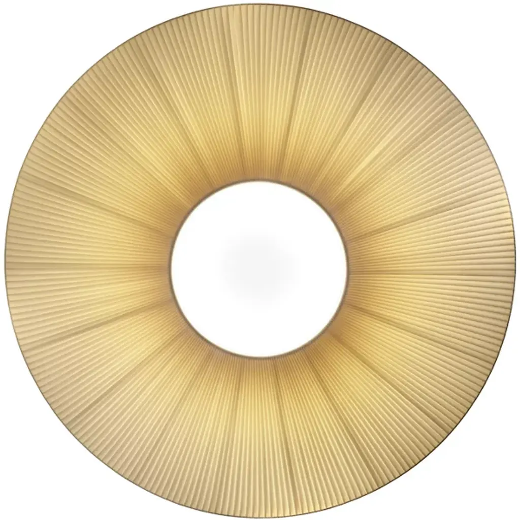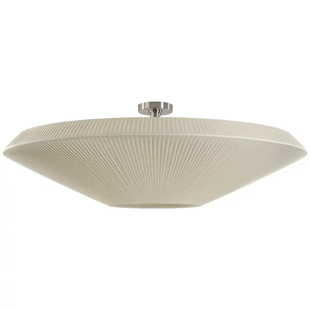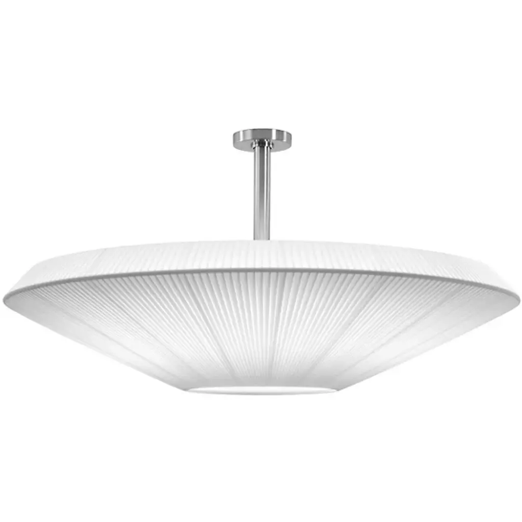 Visually echoing a cross between paper lanterns and interplanetary spacecraft, the Bover Siam Medium Semi-Flushmount is a convex ring of hand wrapped polyester ribbon. The translucent fabric and frosted diffuser work in tandem to provide warm diffused illumination. Available in two size options, the diameter of each is identical, but the suspension length's differ due to varying stem heights. The large option has the longer stem length, and floats further away from the ceiling.