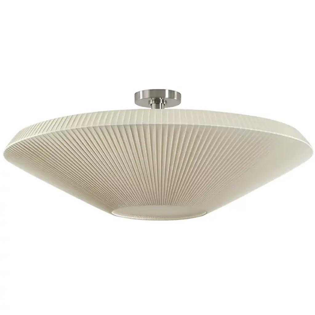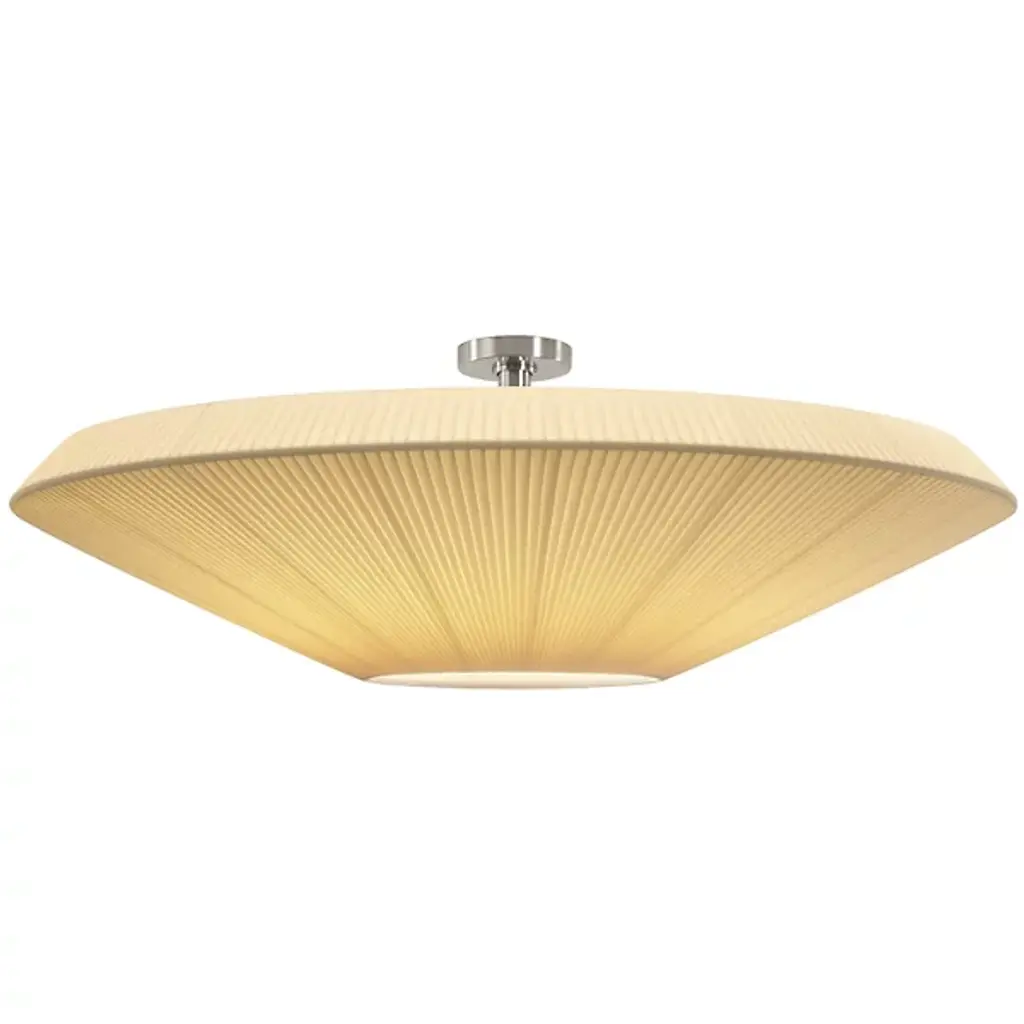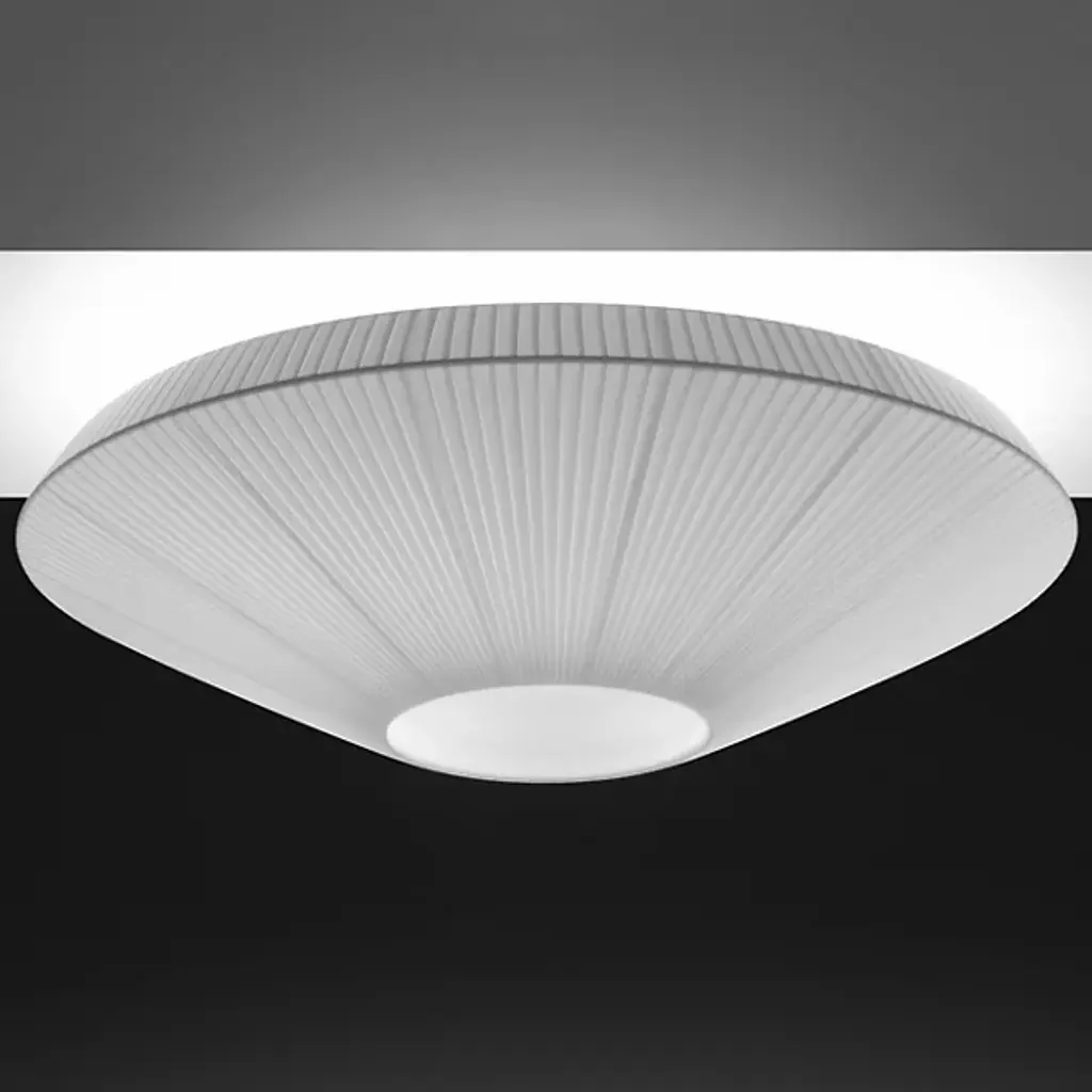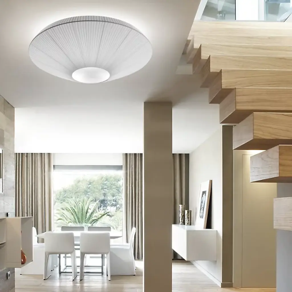 Visually echoing a cross between paper lanterns and interplanetary spacecraft, the Bover Siam Small Semi-Flushmount is a convex ring of hand wrapped polyester ribbon. The translucent fabric and frosted diffuser work in tandem to provide warm diffused illumination. An intriguing candidate for multiple groupings, check out the entire Siam semi-flushmount family for an extensive range of size options.