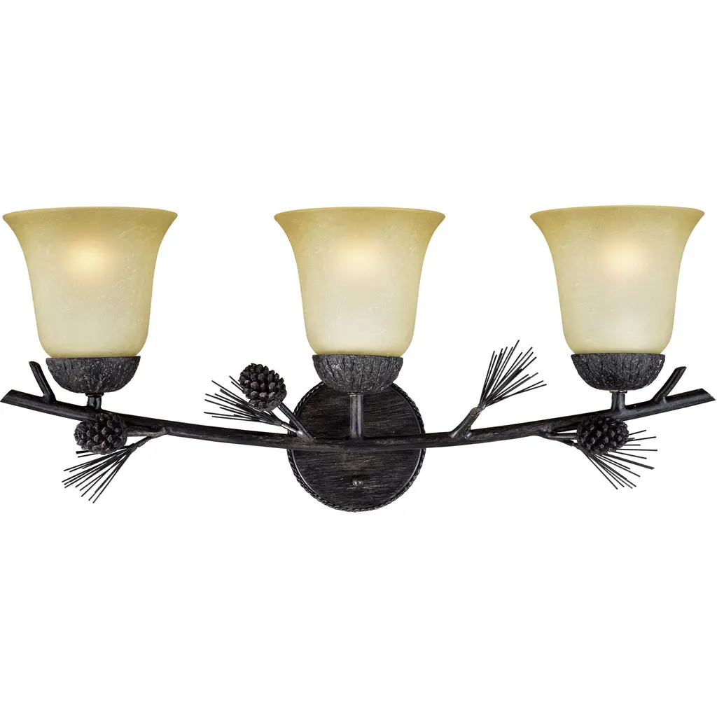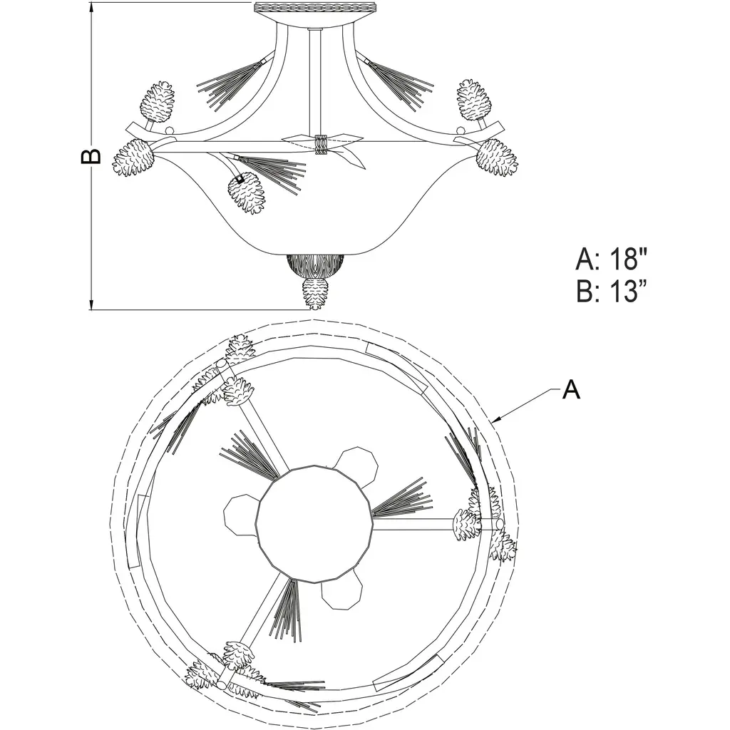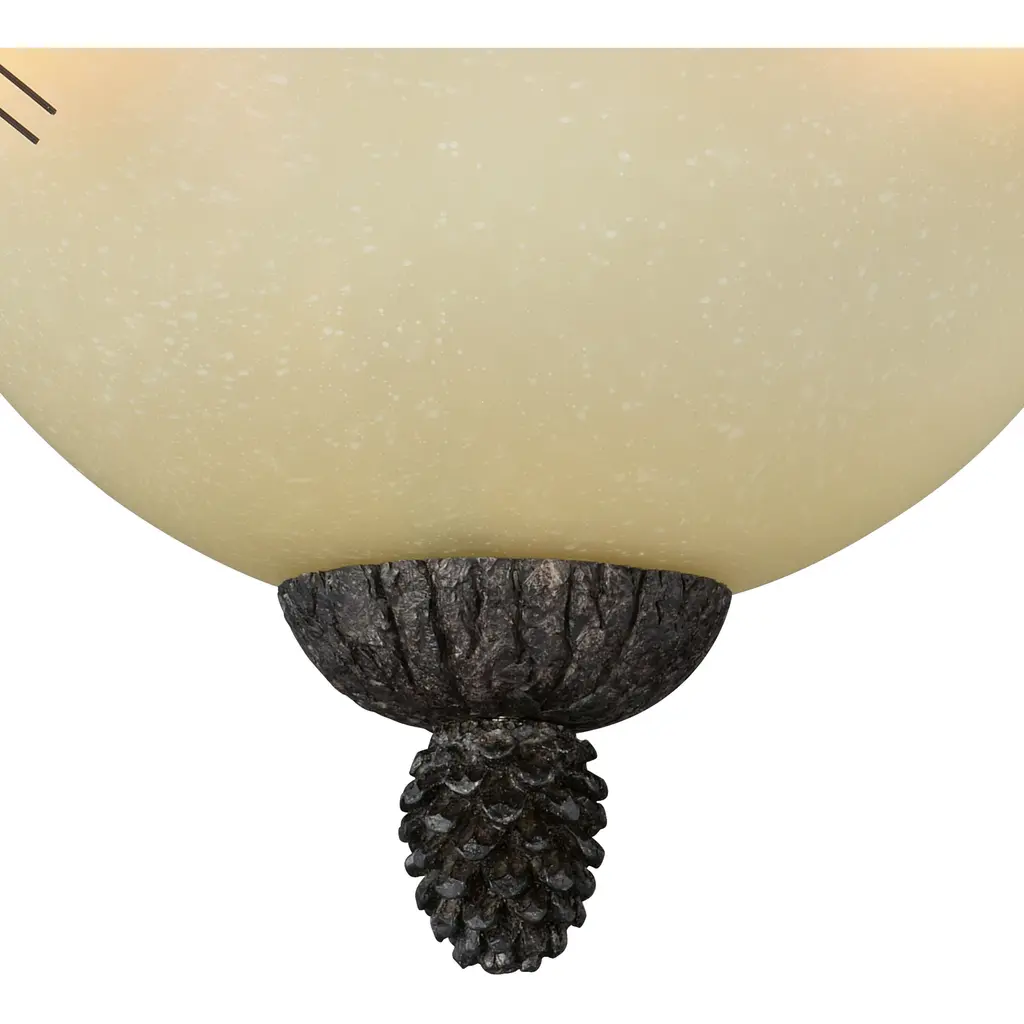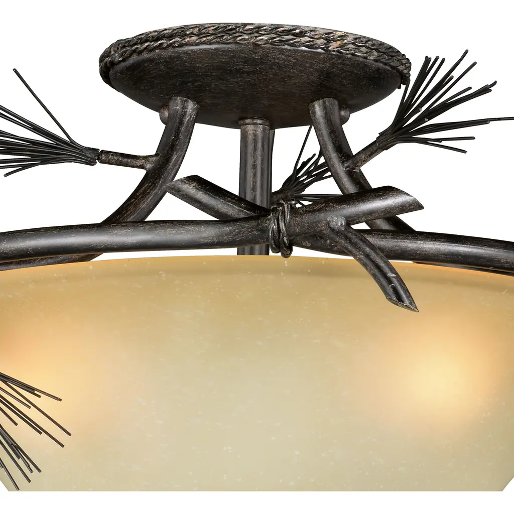 The Sierra collection combines rustic and classic styling that brings nature indoors. This fixture features black walnut finish and frosted scavo glass, with twisted wire rope and pine tree elements. It is a great choice for a vacation lodge, cabin or a suburban home and it will complement a variety of home decors. This semi flush mount ceiling light is ideal for hallways, living rooms, bedrooms, entryways or utility rooms.