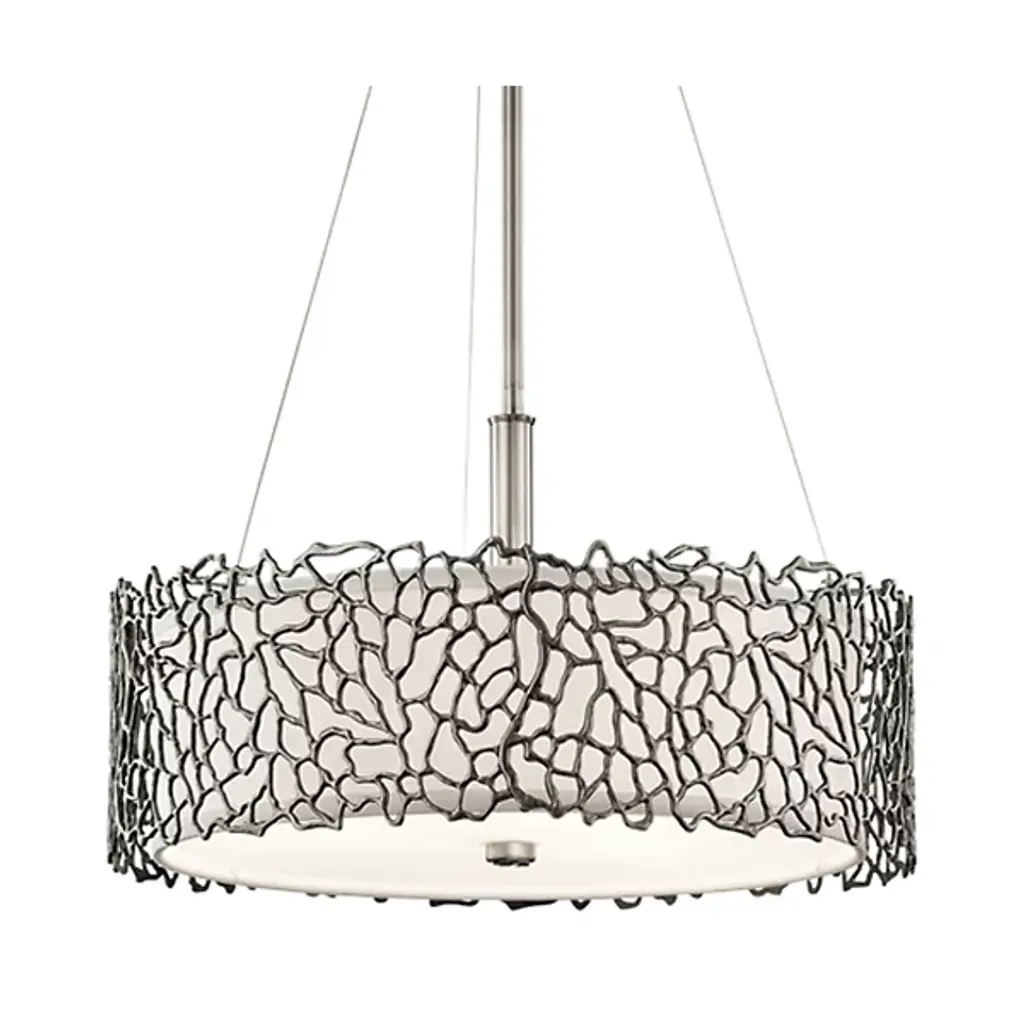 Modern elegance with a decorative organic touch. The Silver Silver Coral Drum Pendant / Semi-Flushmount from Kichler shines soft illumination over its surroundings. This transitional fixture hangs from a low-profile ceiling mount. The fixture can be used as either a pendant by extending the long stem or a semi-flush fixture by collapsing the stem. The piece secures powerful lamping inside a shallow drum shade. An etched opal glass disc gentles the bright lamping from above and below. The artfully cut steel ring surrounding the discs produces a texture-rich silhouette with coral reef-inspired contours.