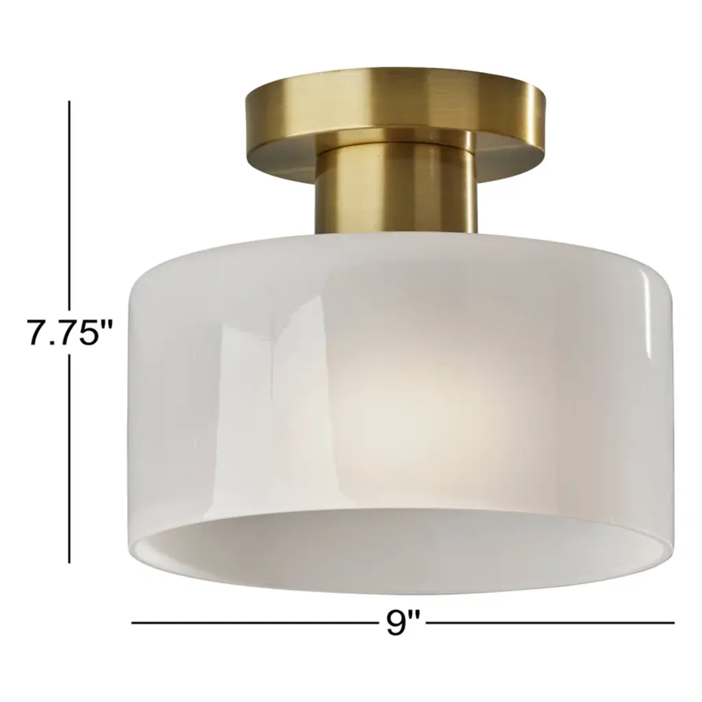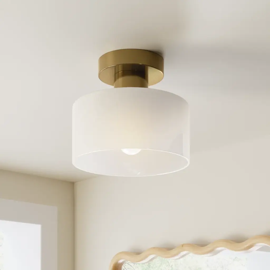 Introducing a 1-light semi-flush mount that's captivating and stylish, bringing a bold mod look and lots of illumination to any room, big or small. The fixture is crafted from metal with an antique brass finish, and it holds in place a single 60W max bulb (sold separately). Surrounding that is a white glass drum shade that casts a warm, welcoming glow throughout your space. And with a hanging height of 7.75", it's ideal for low-ceilinged rooms. And it's compatible with dimmer switches to move you effortlessly from day to night.