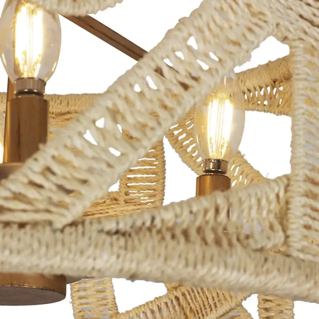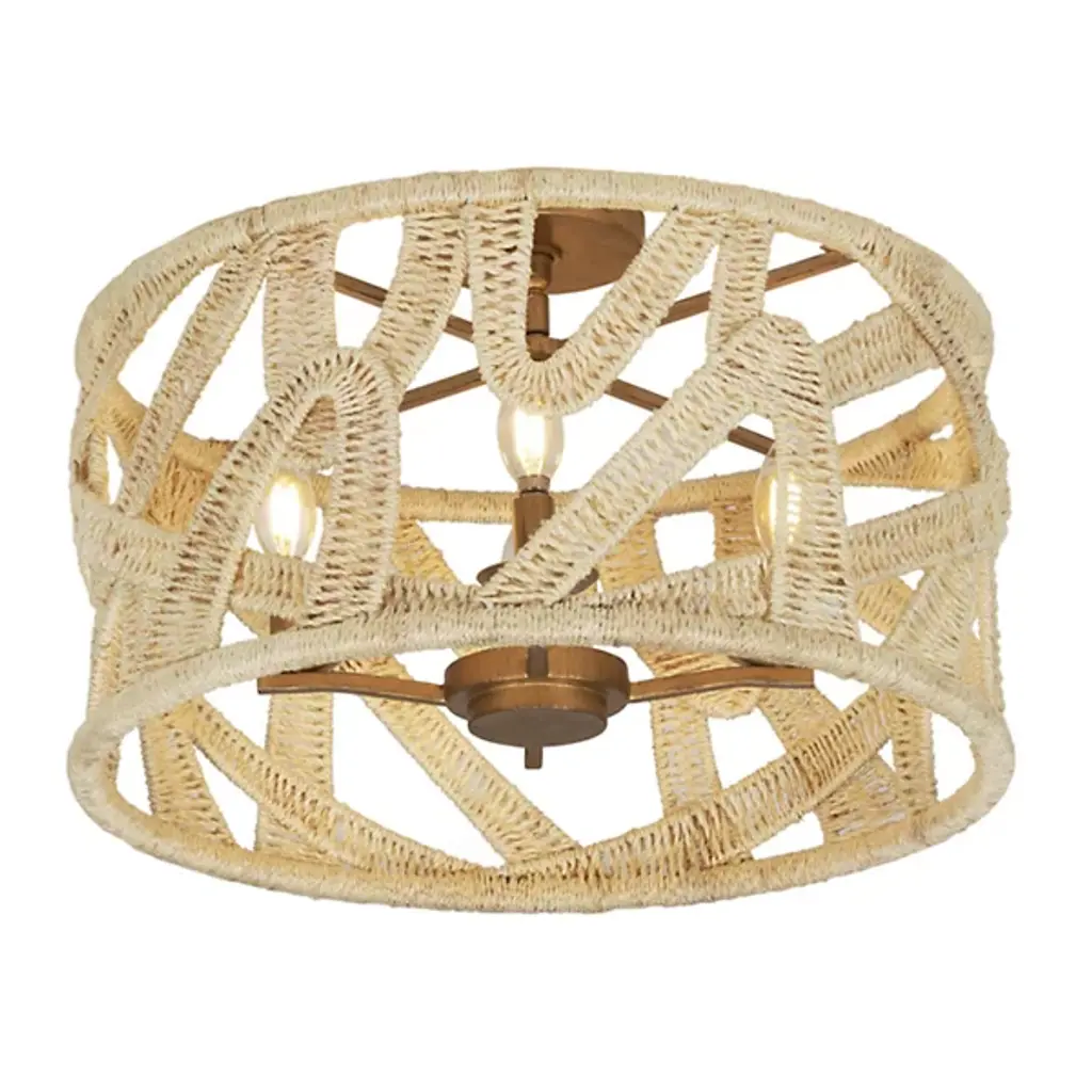 The Soga Semi-Flushmount from Kalco Lighting draws inspiration from the fluid movement and abstract shapes of stretched fabric, offering a natural yet refined aesthetic. Crafted from hand-wrapped Abaca rope, it encases a durable forged steel framework, combining organic texture with structural strength. The exposed hardware, finished in natural Jute, enhances its warm, earthy appeal. Expertly crafted, this semi-flushmount seamlessly blends organic materials with modern design, making it a sophisticated lighting solution for contemporary interiors.