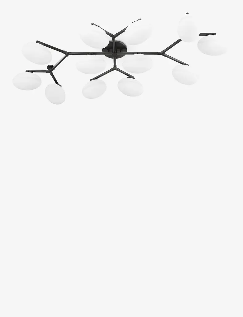 Six soft white opal glass shades are connected in a branching organic structure for a bright and natural touch of modern overhead lighting. This semi-flush mount light's finish strikes a refined note that contrasts with the soft matte white of the opal glass for a ceiling light with dramatic visual impact.