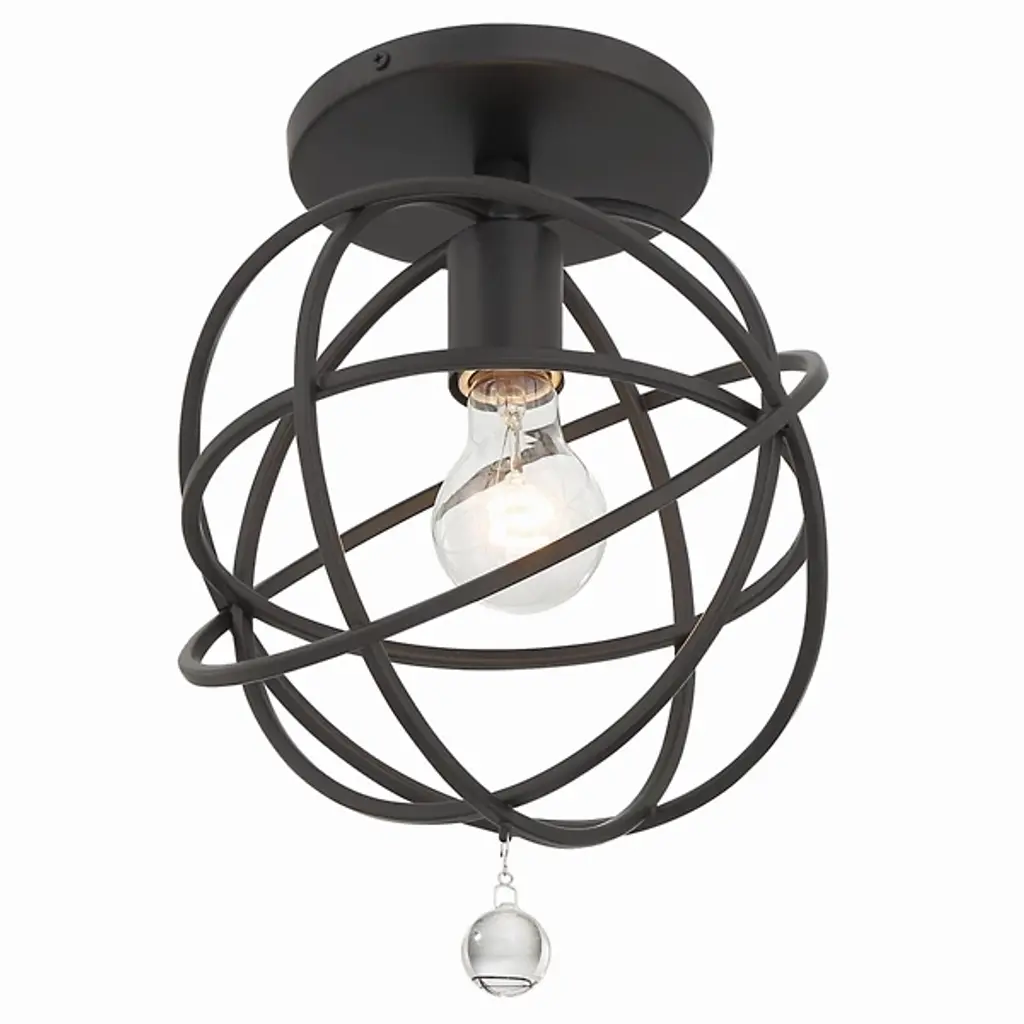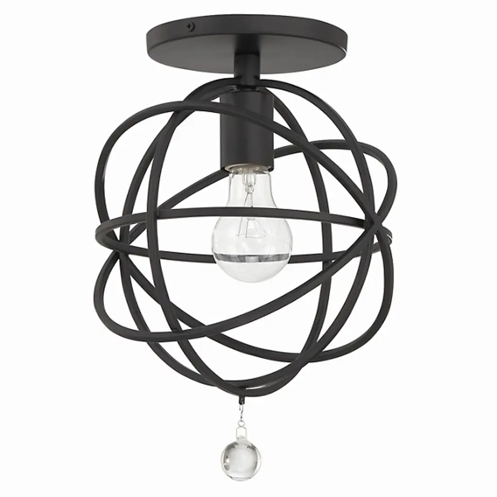 The Crystorama Solaris Semi-Flushmount has both notes of space age retro and classic elegance. A single exposed bulb is centered around a series of rings that form into a spherical shape. A single clear crystal ball delicately hangs from the bottom, adding a classic touch and visual impact.
