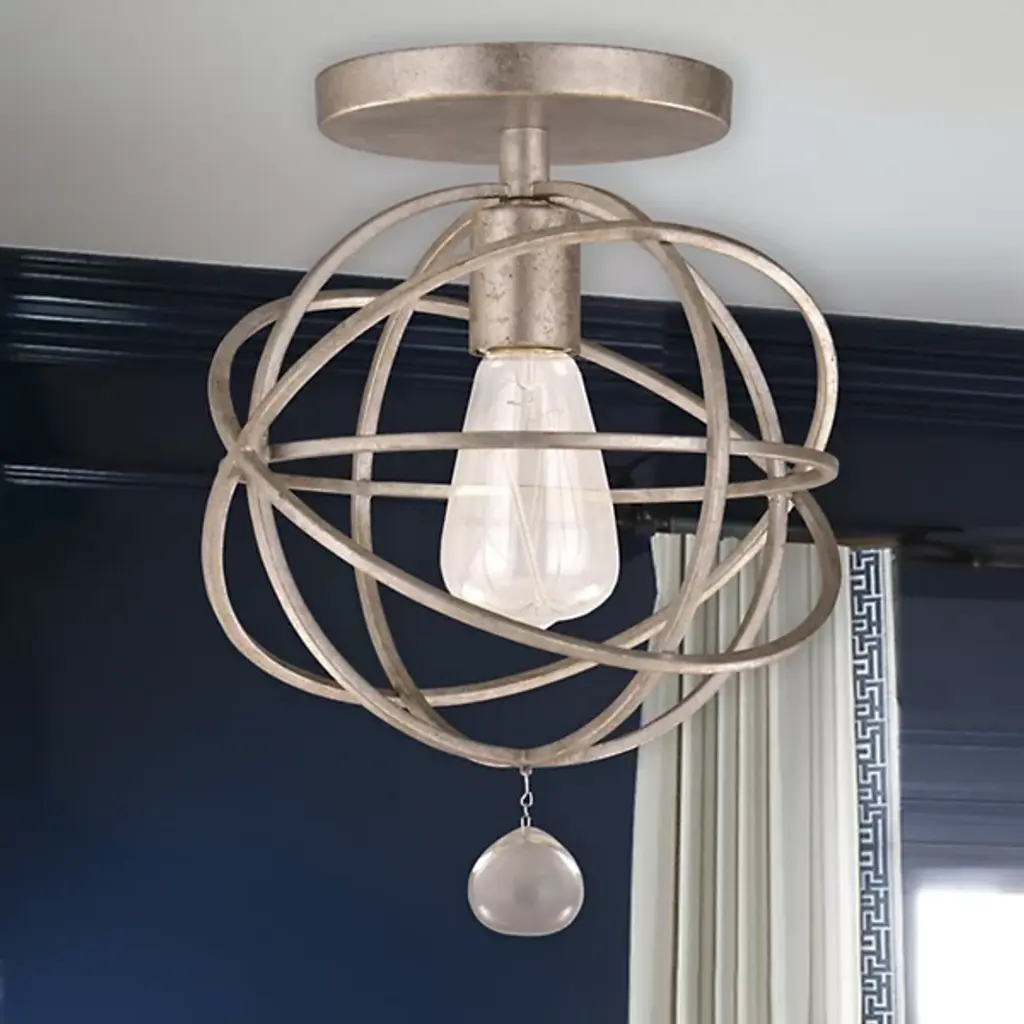The Crystorama Solaris Semi-Flushmount has both notes of space age retro and classic elegance. A single exposed bulb is centered around a series of rings that form into a spherical shape. A single clear crystal ball delicately hangs from the bottom, adding a classic touch and visual impact.