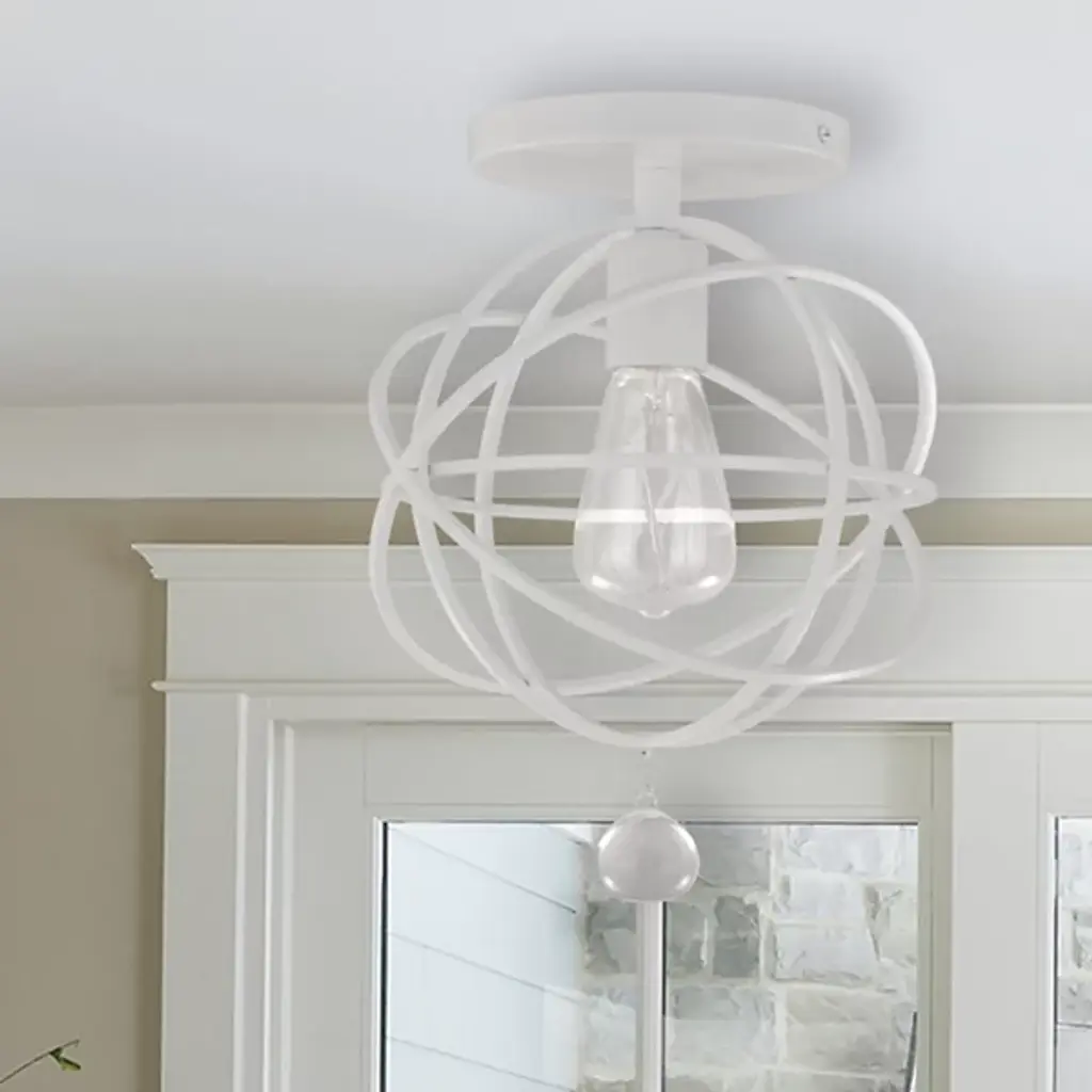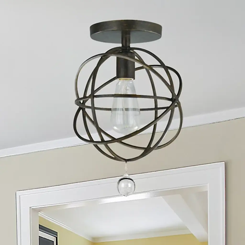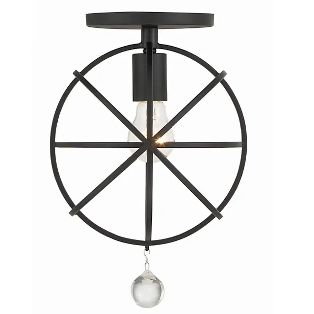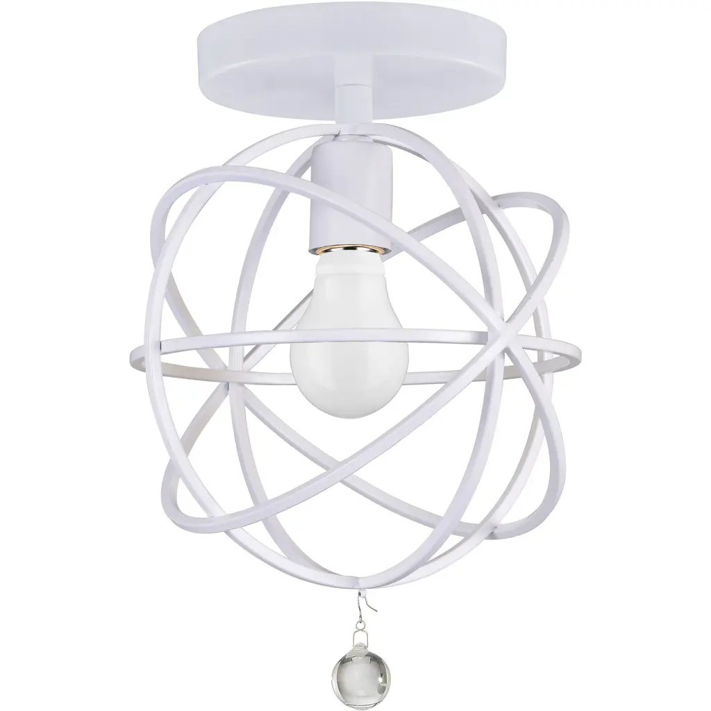 The Crystorama Solaris Semi-Flushmount has both notes of space age retro and classic elegance. A single exposed bulb is centered around a series of rings that form into a spherical shape. A single clear crystal ball delicately hangs from the bottom, adding a classic touch and visual impact.