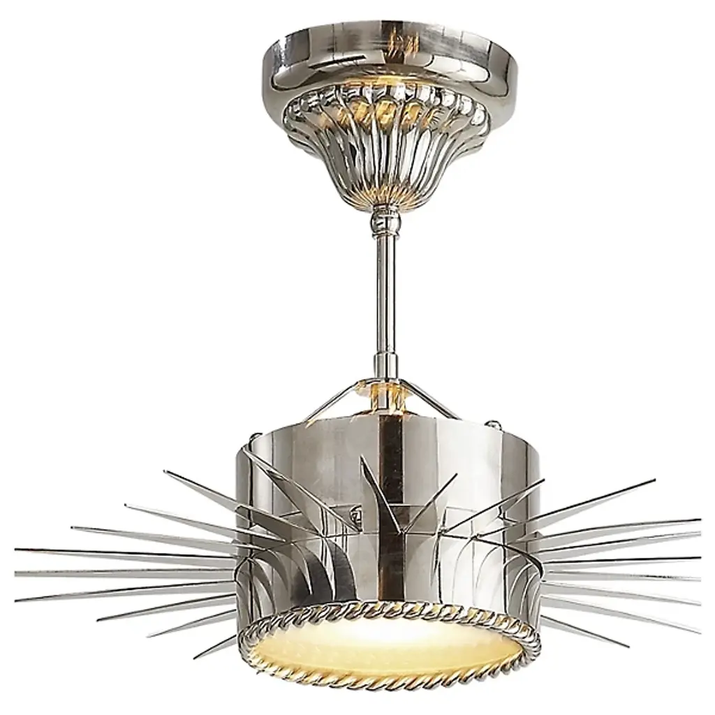 When the night hours arrive, cue the sun. A creation of designer Suzanne Kasler, the Visual Comfort Signature, formerly known as Visual Comfort, Soleil Semi-Flushmount makes a point to keep interiors bright with a wide drum shade and Frosted Glass diffuser. The Soleil flares with decorative appeal as multiple “sunbeams” jut from all directions, reflecting and refracting bits of light around a warm glowing Halogen lamp. Keep your living space radiant even after the sun goes down.