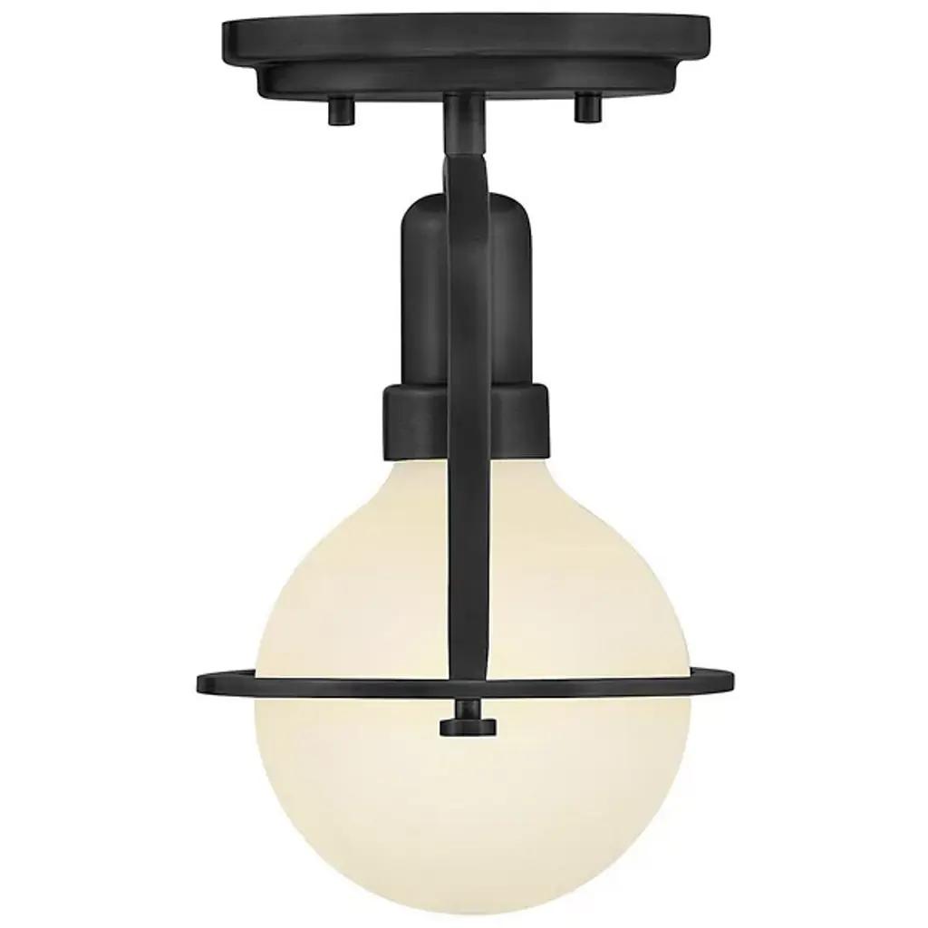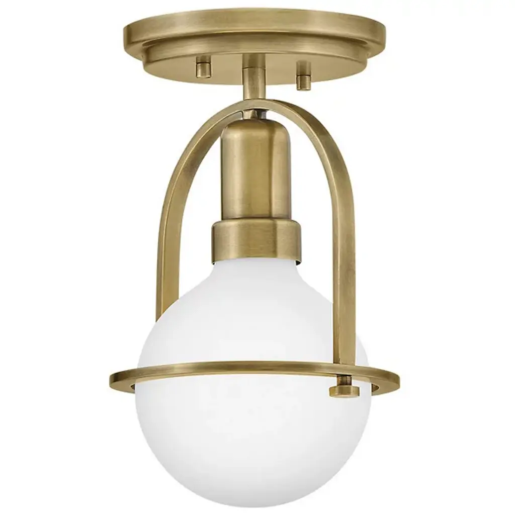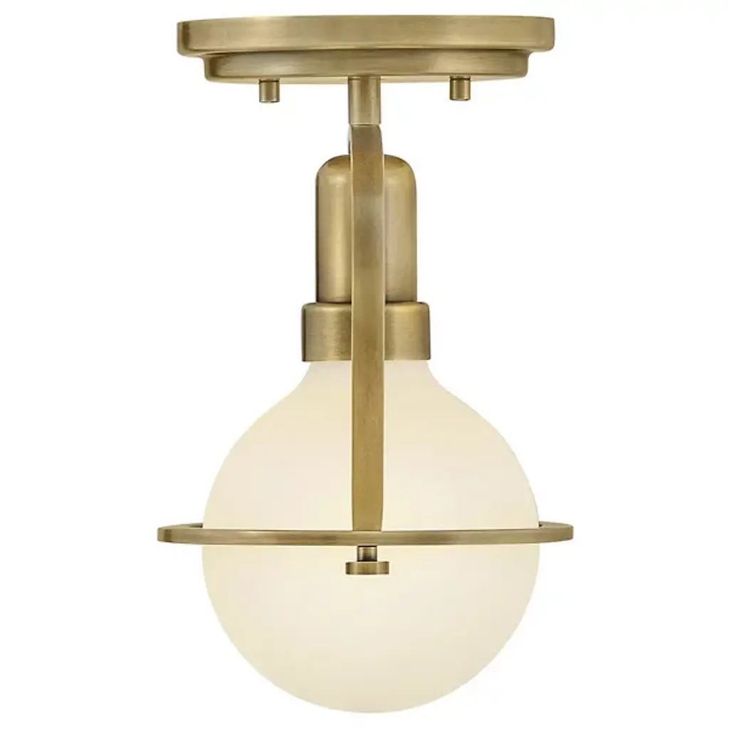 The Somerset Semi-Flushmount from Hinkley suspends a globe-shaped etched opal glass within a precisely crafted metal yoke. This transitional design introduces subtle vintage touches through thoughtful details like the turned metal knobs that anchor the glass. The lighting fixture offers installation versatility with its convertible design—functioning as either a pendant or semi-flush mount depending on your space requirements. Multiple included stem options allow for custom height adjustments to suit various ceiling heights and room proportions. This adaptable piece works equally well in dining rooms, entrances, or hallways.