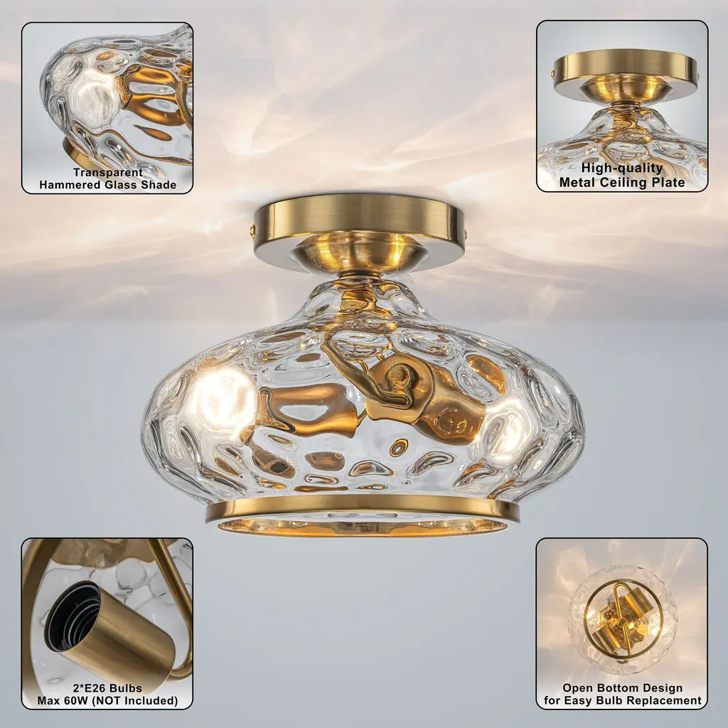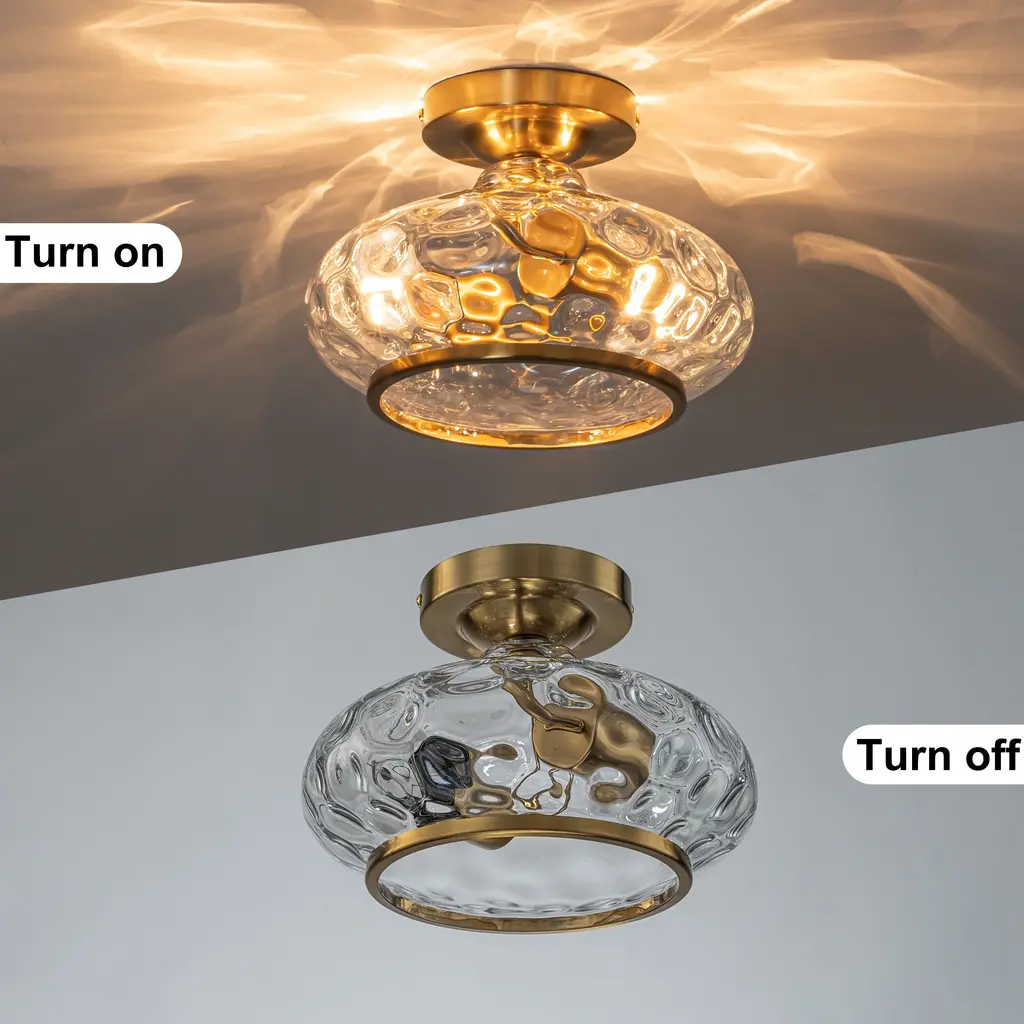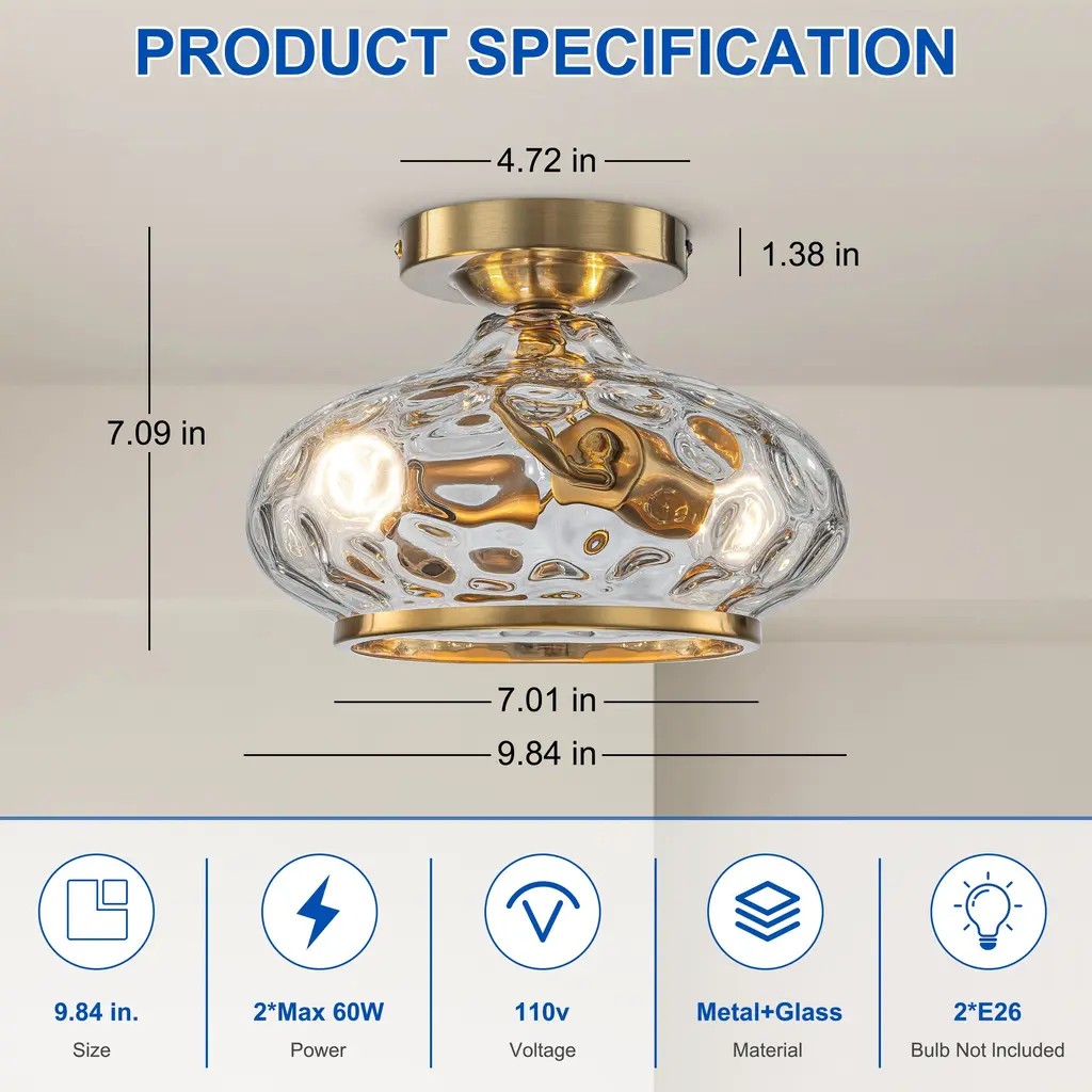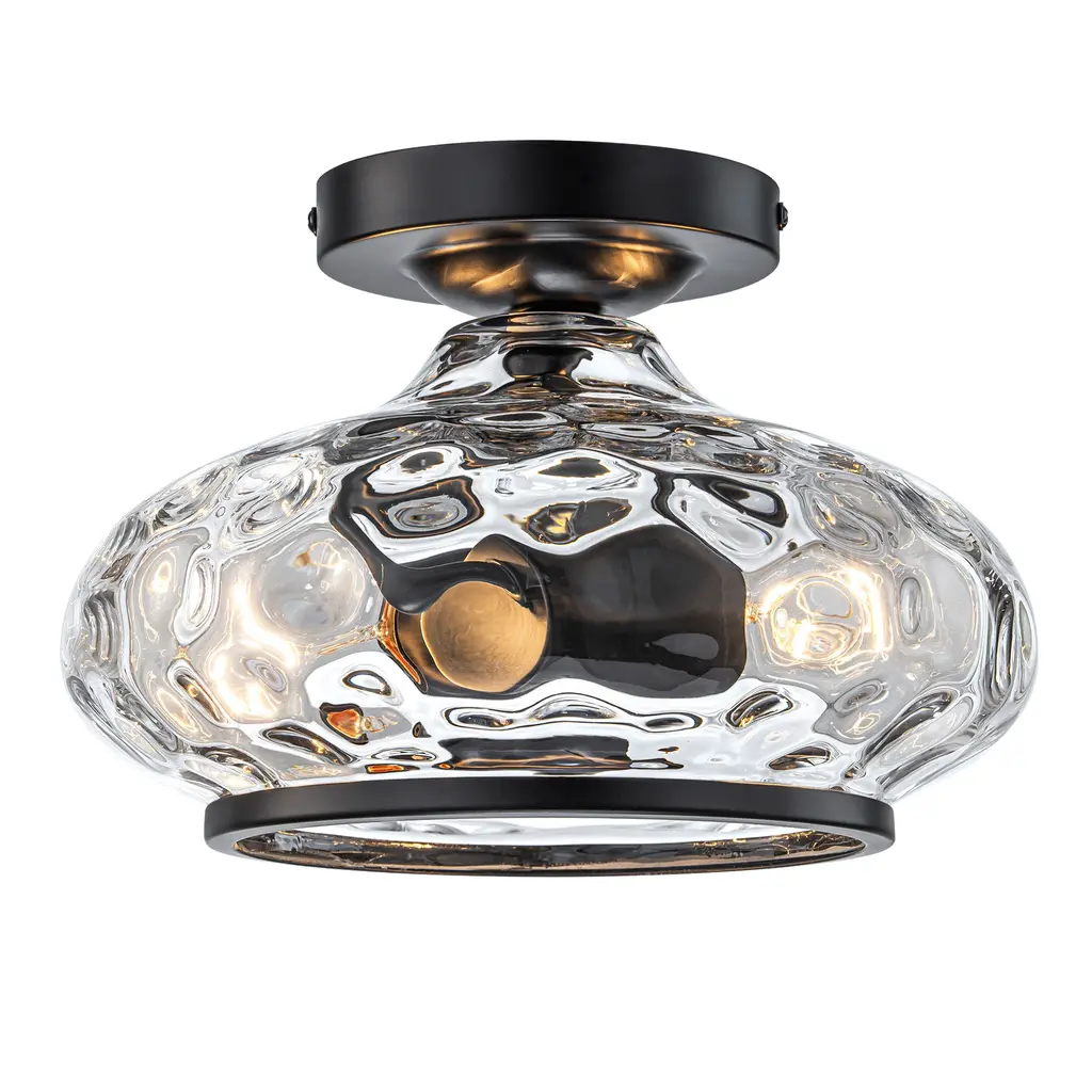 Blending rustic charm with modern aesthetics, this compact mushroom-shaped fixture reimagines farmhouse elegance. Its empire-style silhouette features a water-ripple glass shade that casts a soft cobblestone glow, paired with a polished chrome base and a delicate finial for refined detailing. Perfect for cozy spaces, the semi-flush design adds character to hallways, bedrooms, or entryways while maintaining a low-profile appeal.Feature