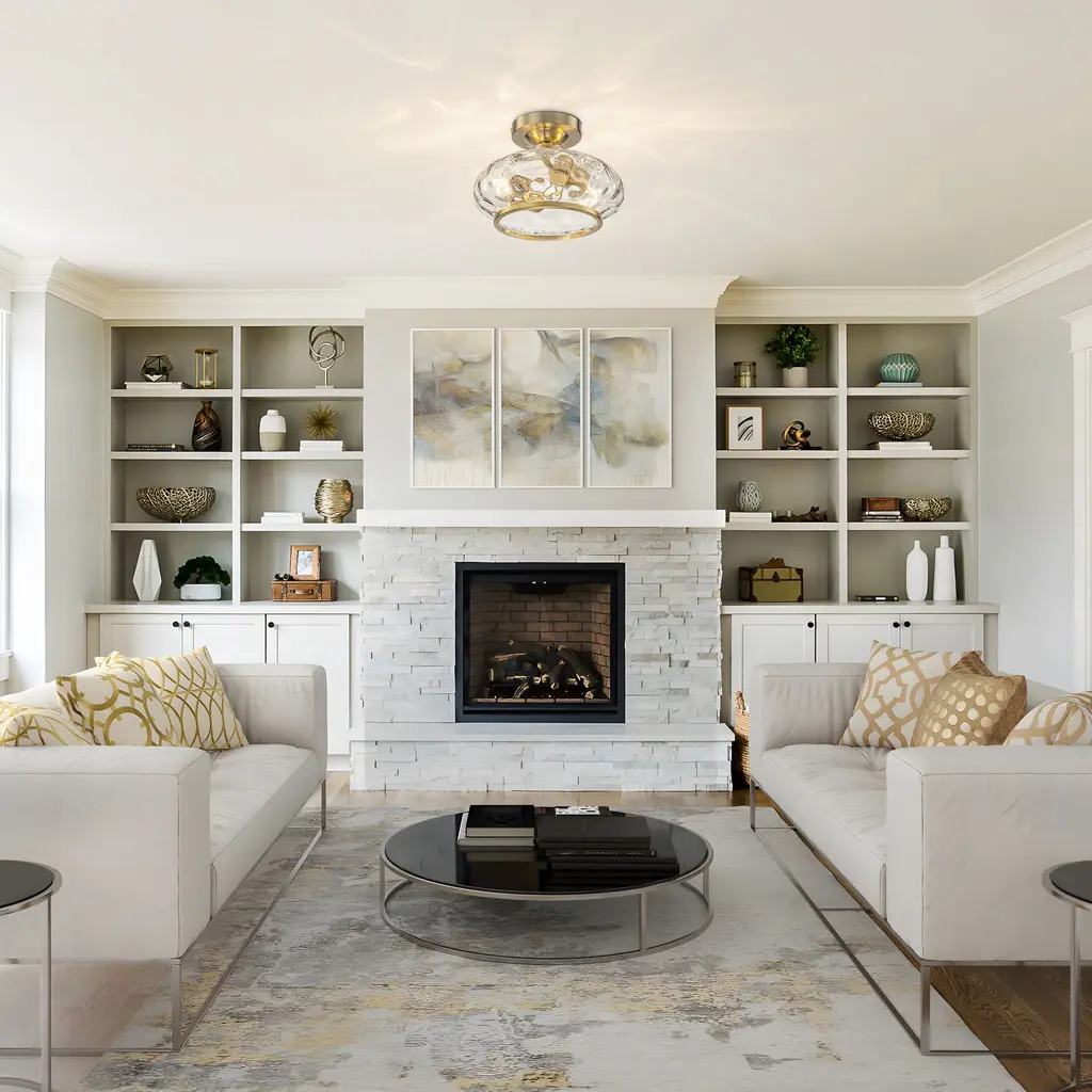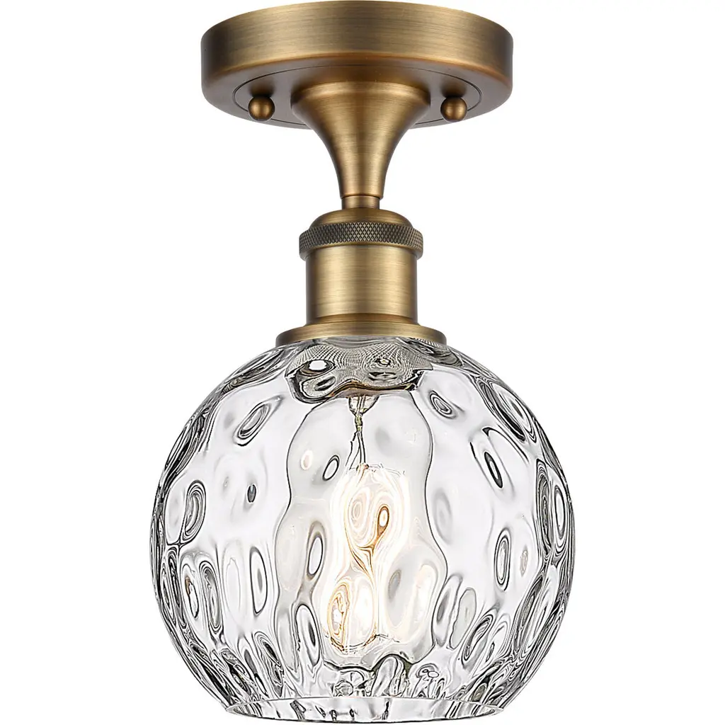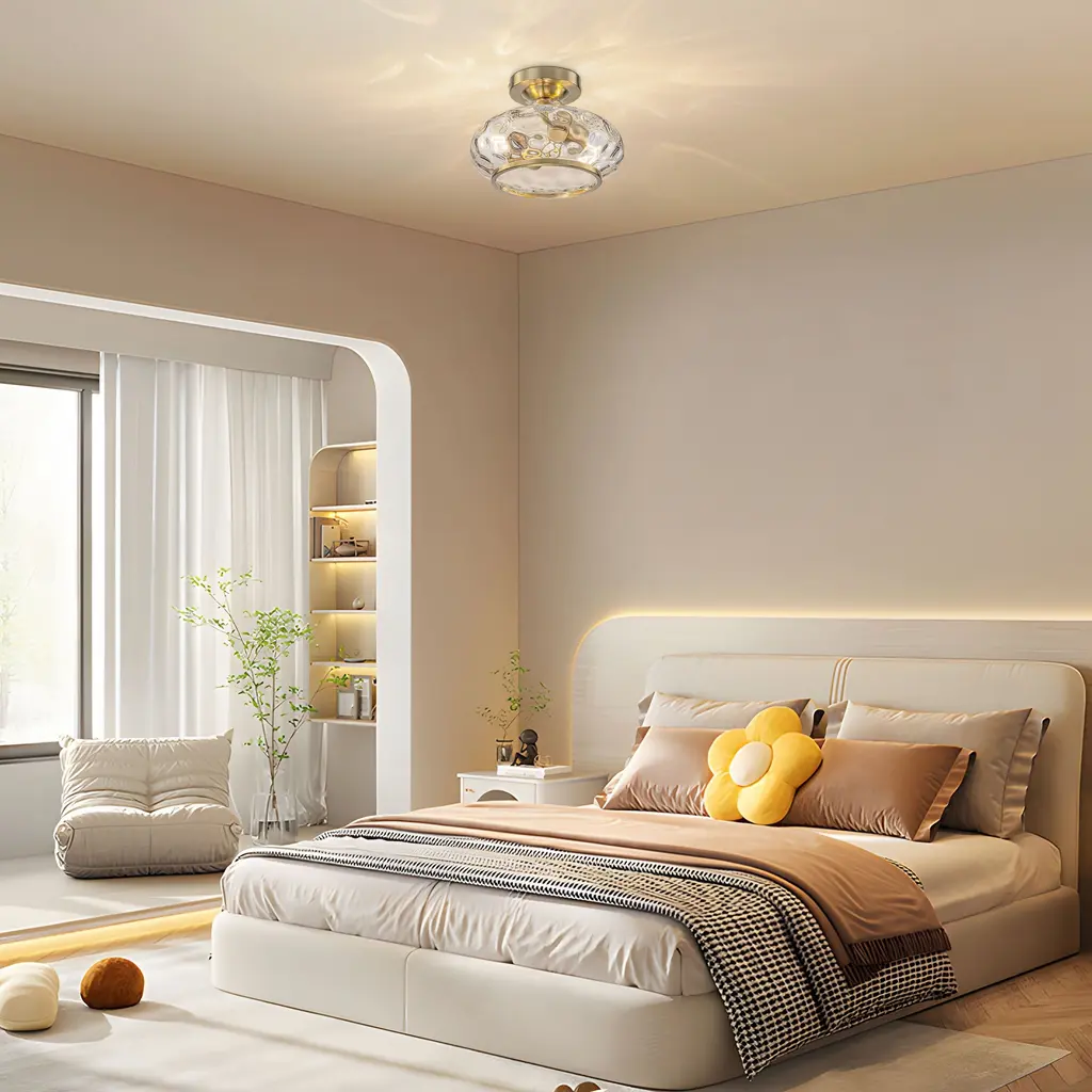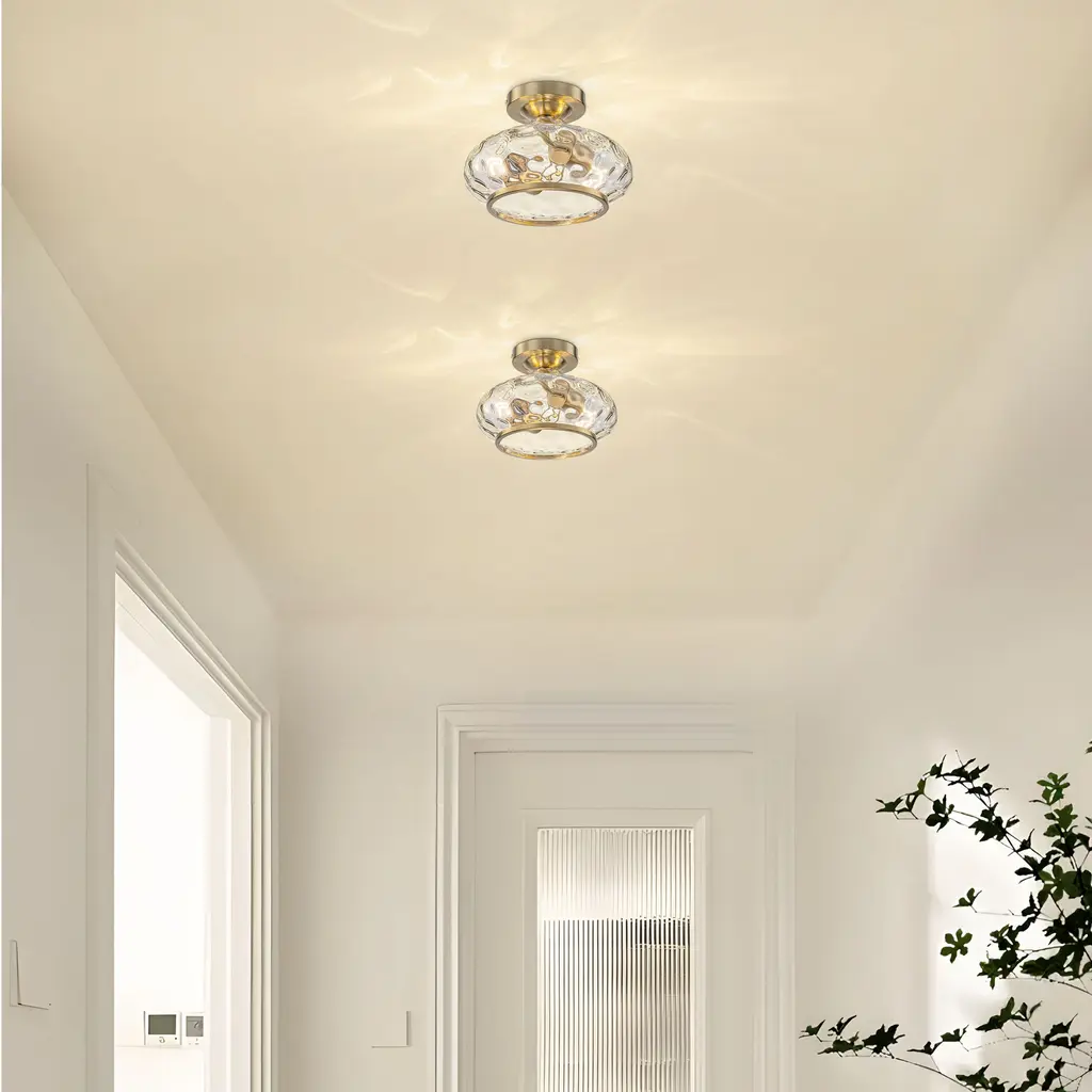 Blending rustic charm with modern aesthetics, this compact mushroom-shaped fixture reimagines farmhouse elegance. Its empire-style silhouette features a water-ripple glass shade that casts a soft cobblestone glow, paired with a polished chrome base and a delicate finial for refined detailing. Perfect for cozy spaces, the semi-flush design adds character to hallways, bedrooms, or entryways while maintaining a low-profile appeal.Feature