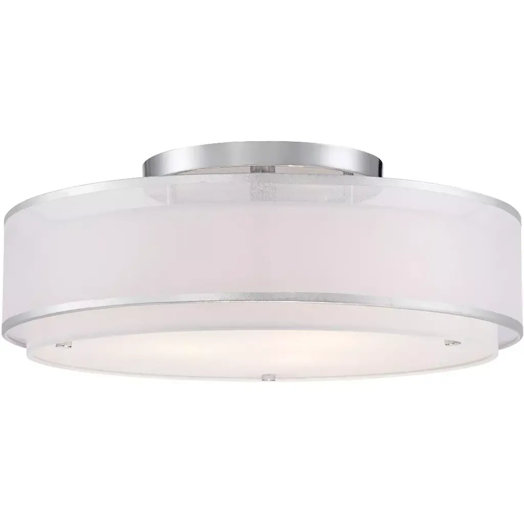 Give interiors a clean transitional touch with the Studio Semi-Flushmount from Minka-Lavery. A sleek metal canopy and short stem support the fixture and bring contrast to the softness of its double-layered shade. A drum-shaped frame is wrapped in linen fabric and surrounded by a matching outer shade that brings elegance and depth to its design. An etched diffuser at the bottom of the shade full encloses its incandescent light while offering additional diffusion for its ample illumination.
