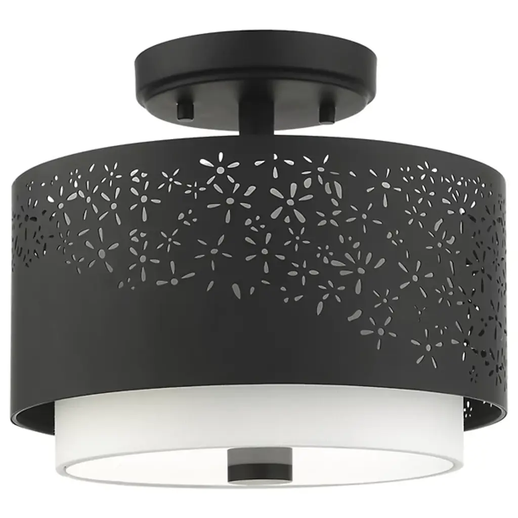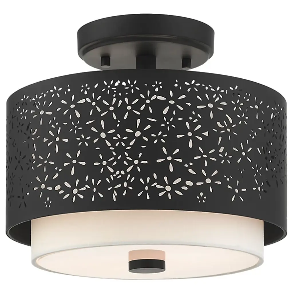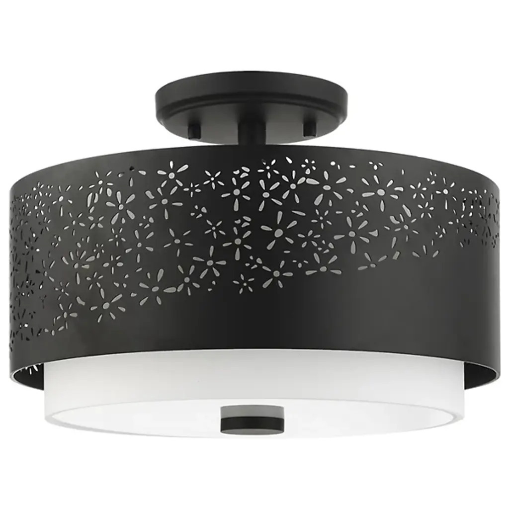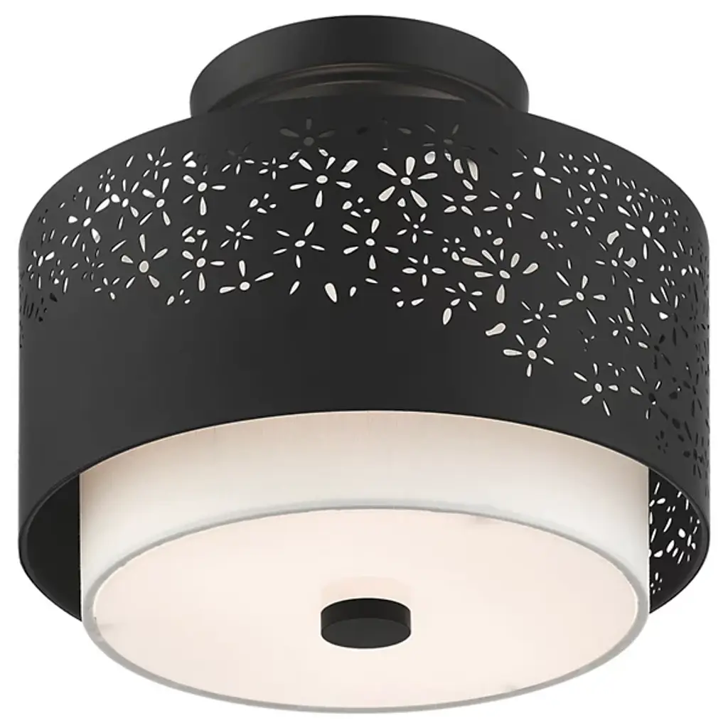 Bright and joyous like summer. The Summer Semi-Flushmount from Alder & Ore envelops the room with a bountiful light while leaving behind a delightful graphic design of floral inspiration. The piece satisfies the refined styling needs of the home while adding artful decoration. Its semi-flush composition makes it a great choice over low ceilings. The eyes are instantly drawn to the contrasting colors of the shade pairing. The outer metal shade uses the internal shade’s white hue to fill in its perforated floral pattern with color. The bulbs inside beam through the decorative perforations for a stunning projected display. The light also flows out the base as a diffused, room-filling glow.