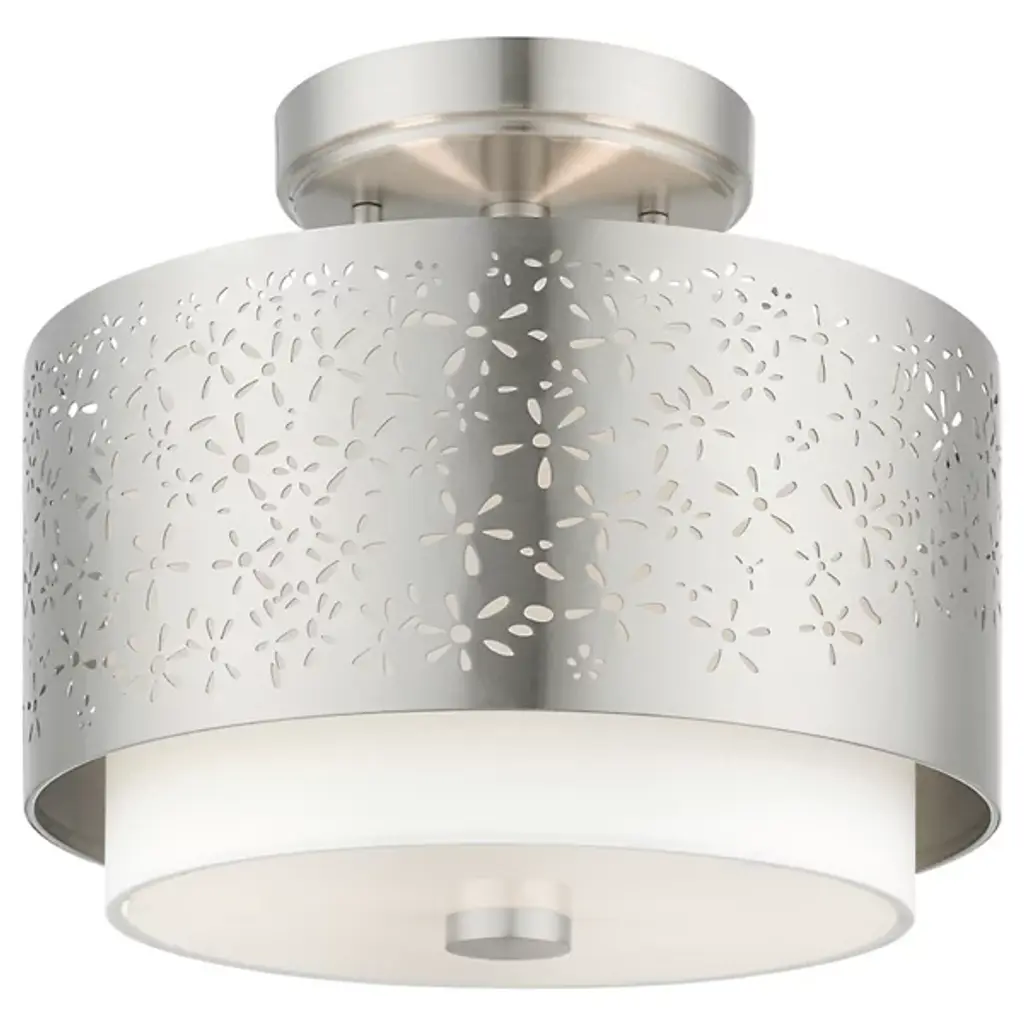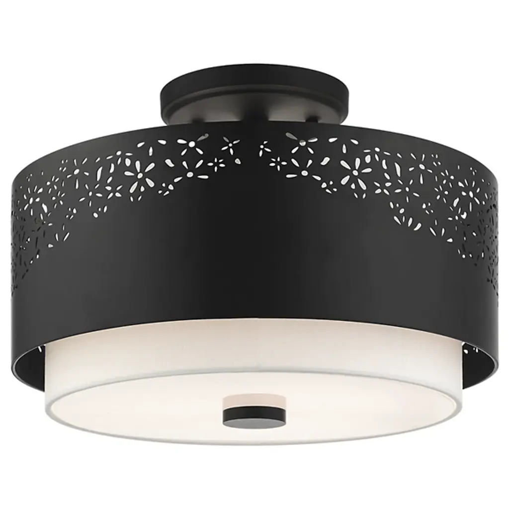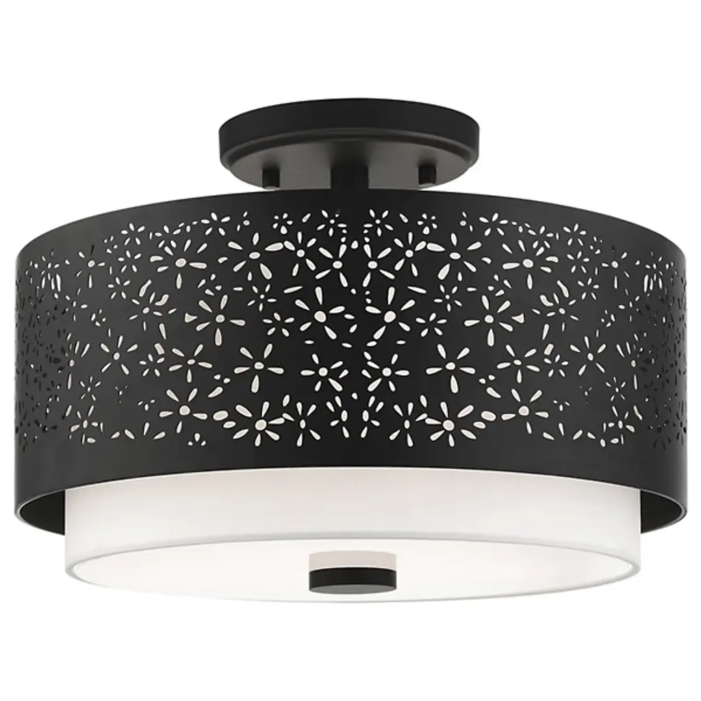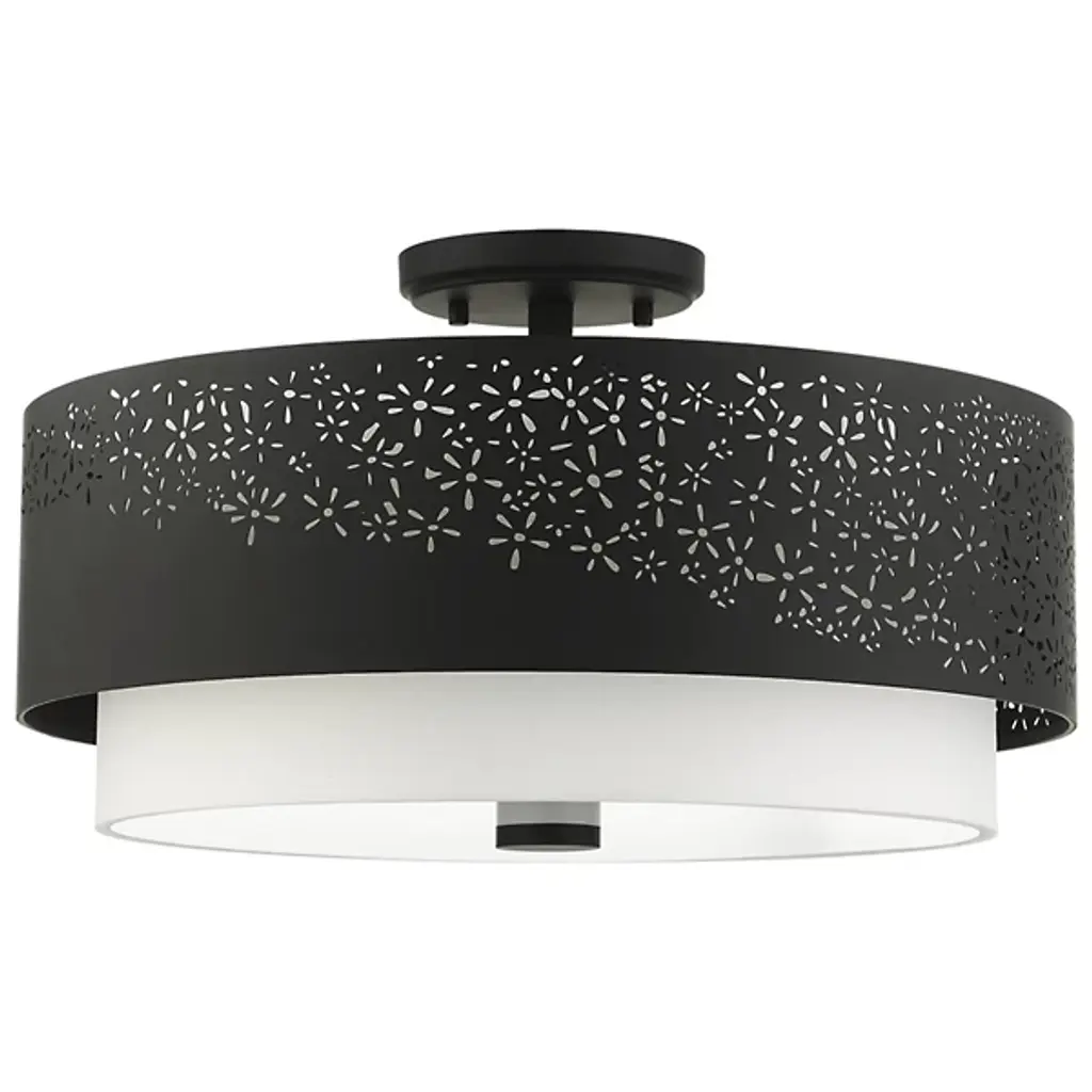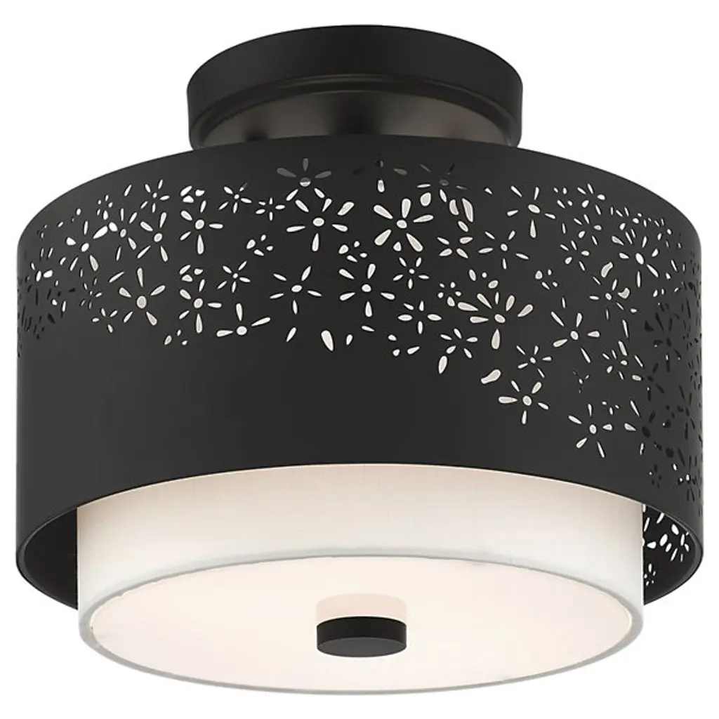 Bright and joyous like summer. The Summer Semi-Flushmount from Alder & Ore envelops the room with a bountiful light while leaving behind a delightful graphic design of floral inspiration. The piece satisfies the refined styling needs of the home while adding artful decoration. Its semi-flush composition makes it a great choice over low ceilings. The eyes are instantly drawn to the contrasting colors of the shade pairing. The outer metal shade uses the internal shade’s white hue to fill in its perforated floral pattern with color. The bulbs inside beam through the decorative perforations for a stunning projected display. The light also flows out the base as a diffused, room-filling glow.