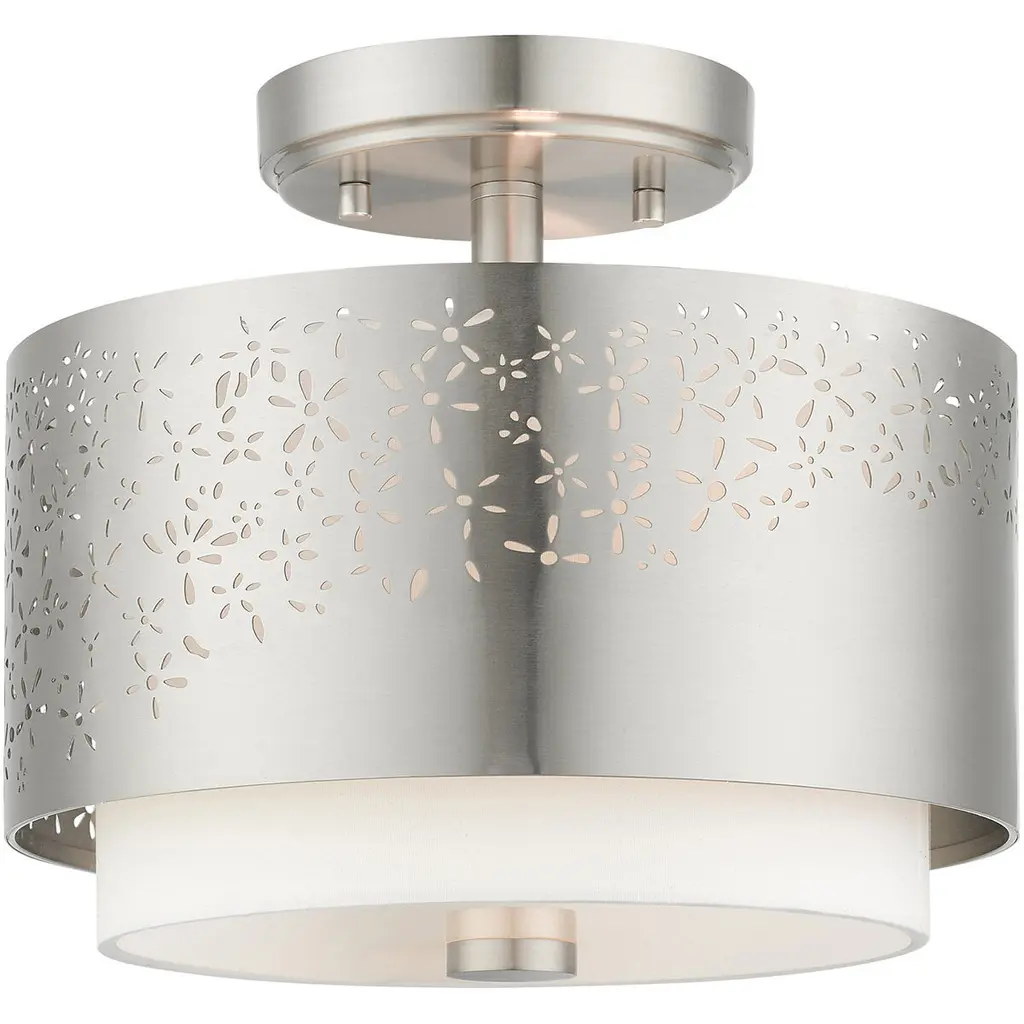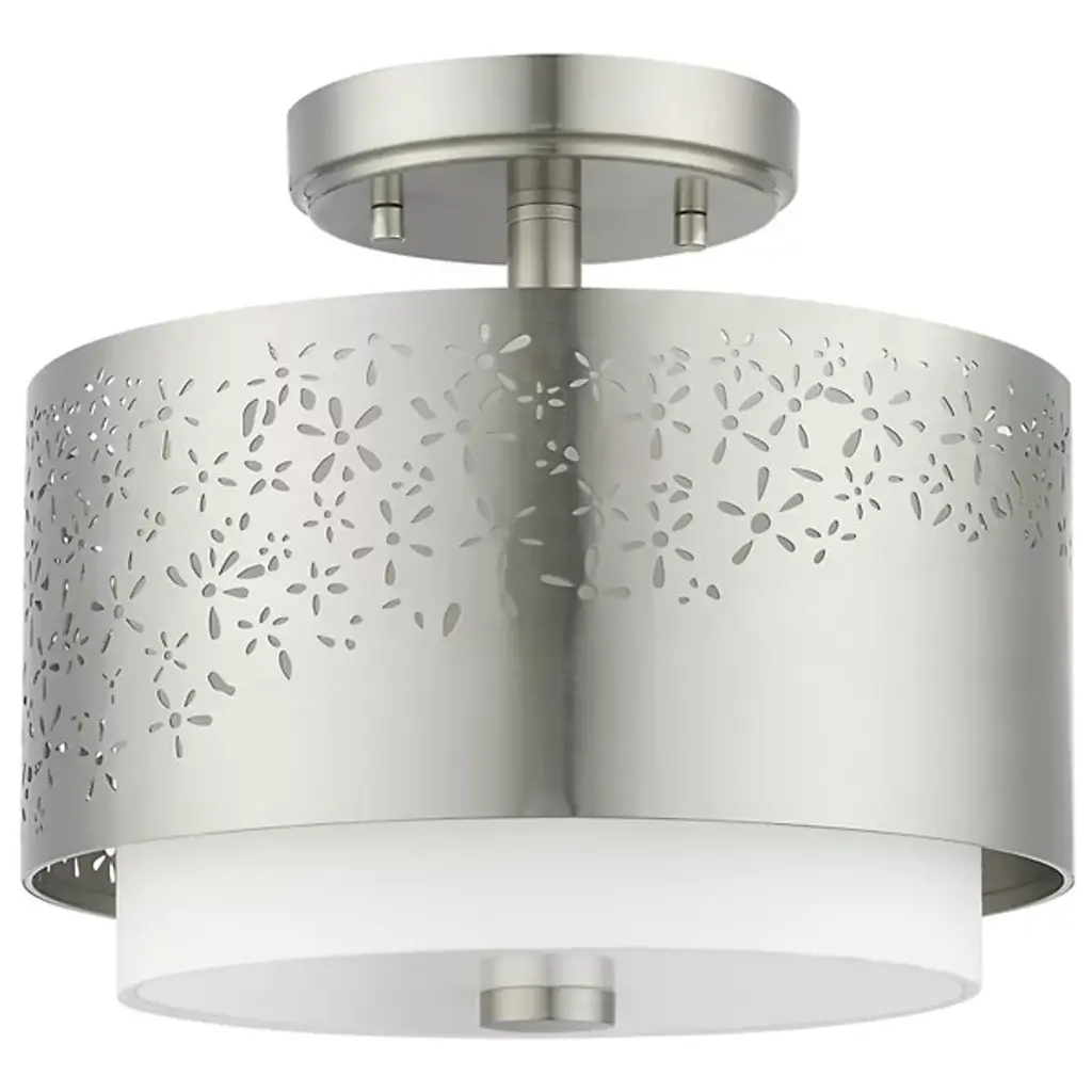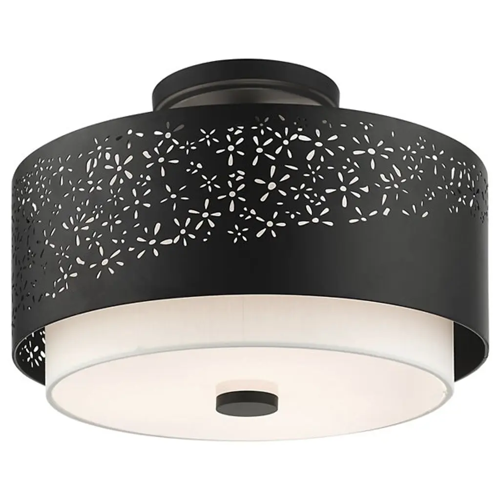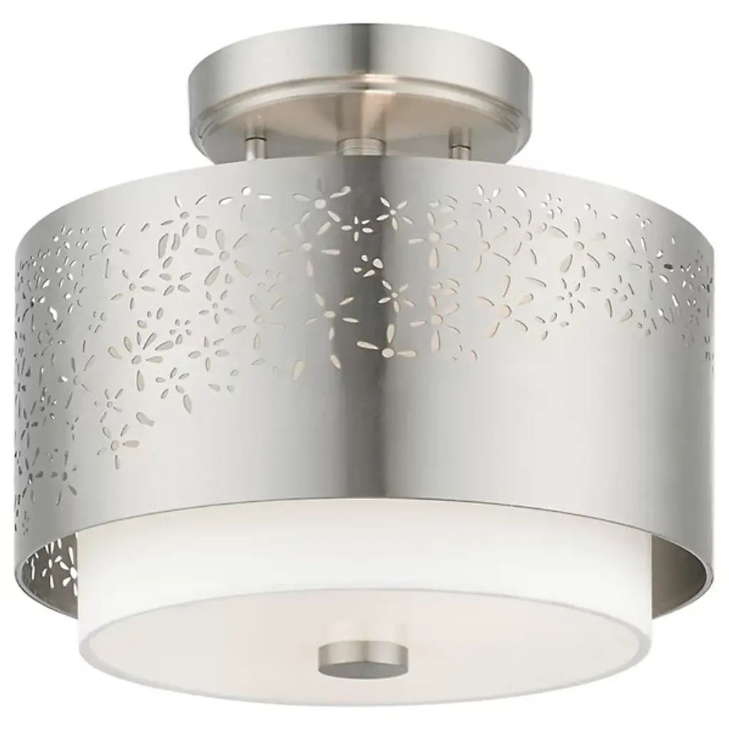 Bright and joyous like summer. The Summer Semi-Flushmount from Alder & Ore envelops the room with a bountiful light while leaving behind a delightful graphic design of floral inspiration. The piece satisfies the refined styling needs of the home while adding artful decoration. Its semi-flush composition makes it a great choice over low ceilings. The eyes are instantly drawn to the contrasting colors of the shade pairing. The outer metal shade uses the internal shade’s white hue to fill in its perforated floral pattern with color. The bulbs inside beam through the decorative perforations for a stunning projected display. The light also flows out the base as a diffused, room-filling glow.