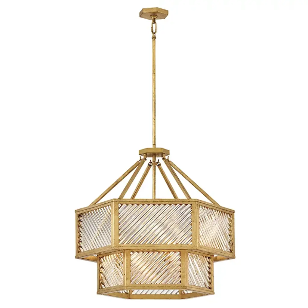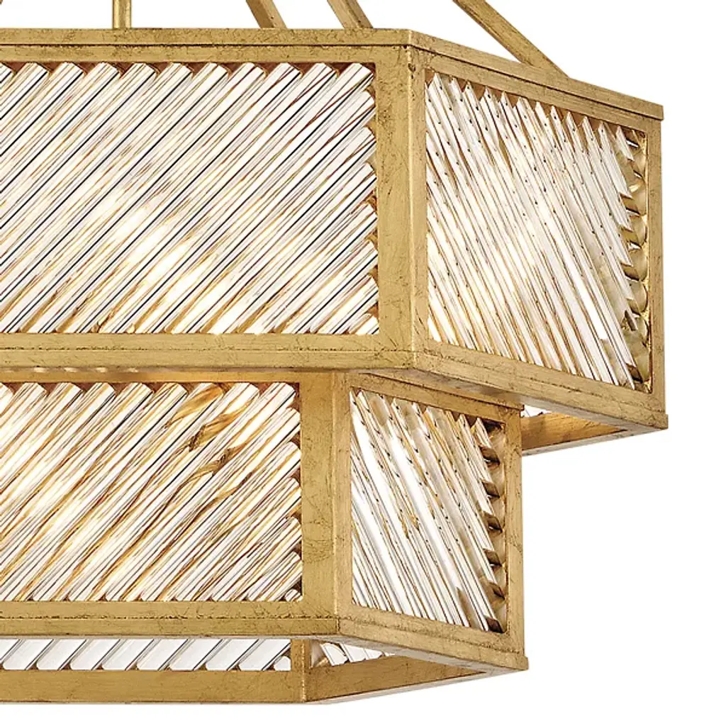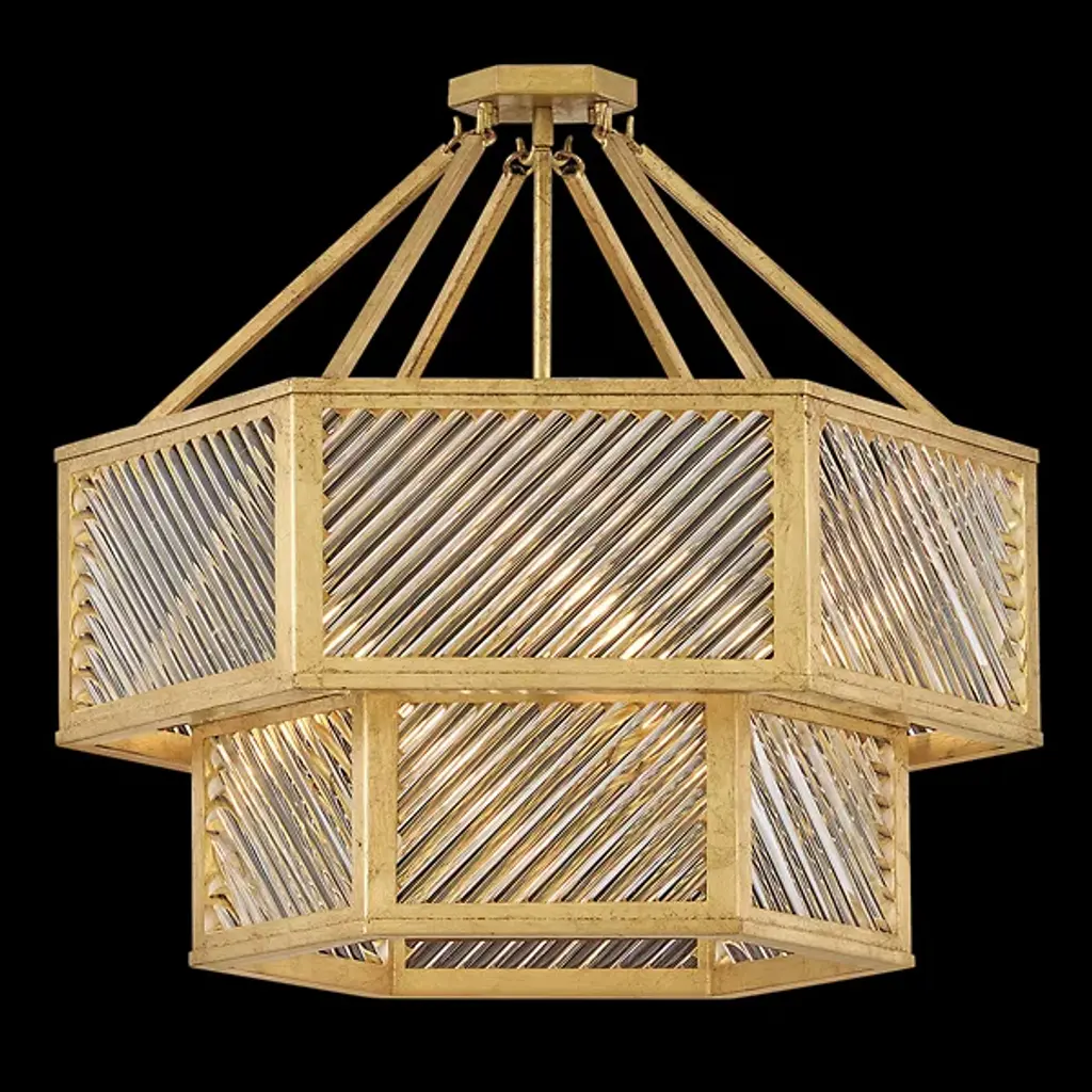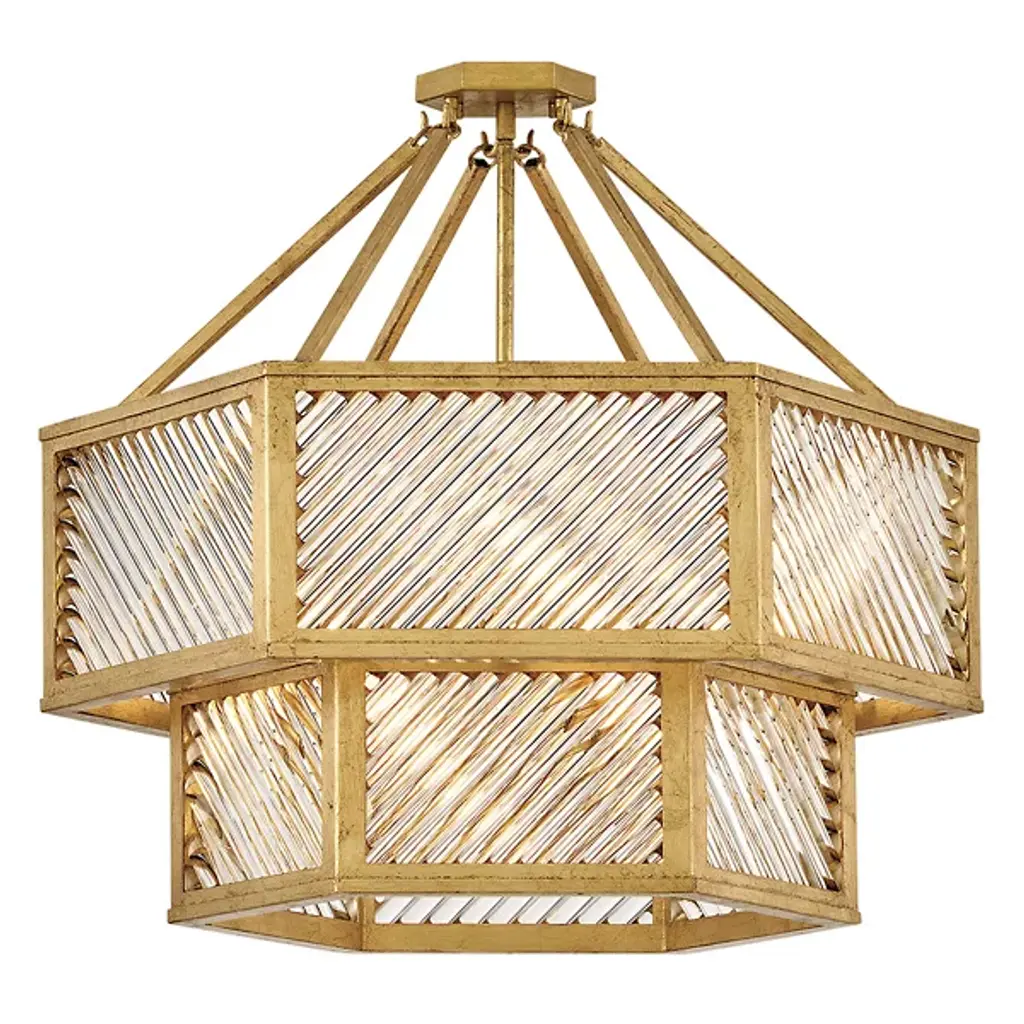 The Sura Convertible Semi-Flushmount / Chandelier from Hinkley brings mid-century design principles into the present through its distinctive glass rod arrangement. The hexagonal framework houses diagonal crystal elements that play with light in unexpected ways. Angled glass pieces form an intricate herringbone pattern that multiplies illumination throughout the space. Multiple stem options allow for customized installation heights, making this piece adaptable as either a semi-flush mount or chandelier. The diagonal glass placement creates an ever-changing display of refracted light, while the structured frame maintains visual balance and proportion.