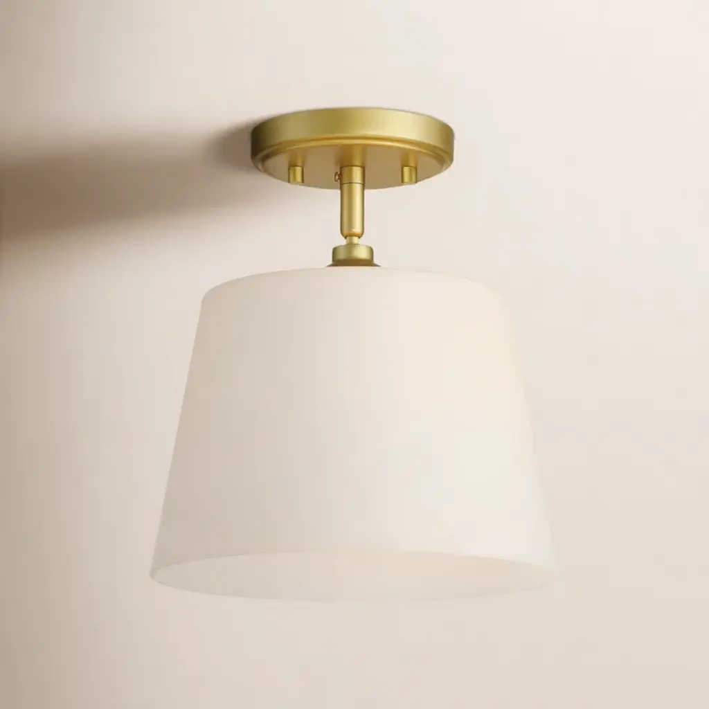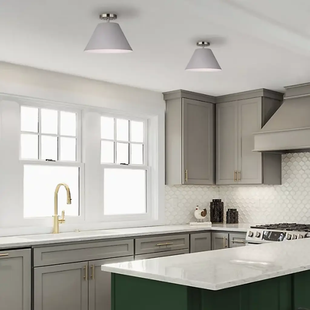 The Talia Semi-Flushmount from Canarm blends modern simplicity with subtle detailing for a versatile lighting solution. Its steel shade, finished in a matte coating, is complemented by a brushed nickel ceiling mount for a refined contrast. The pale interior enhances light reflection, casting a warm and inviting glow. The fixture is optimized for open spaces with low ceilings and is damp-listed for added durability, making it a practical choice for various interiors.