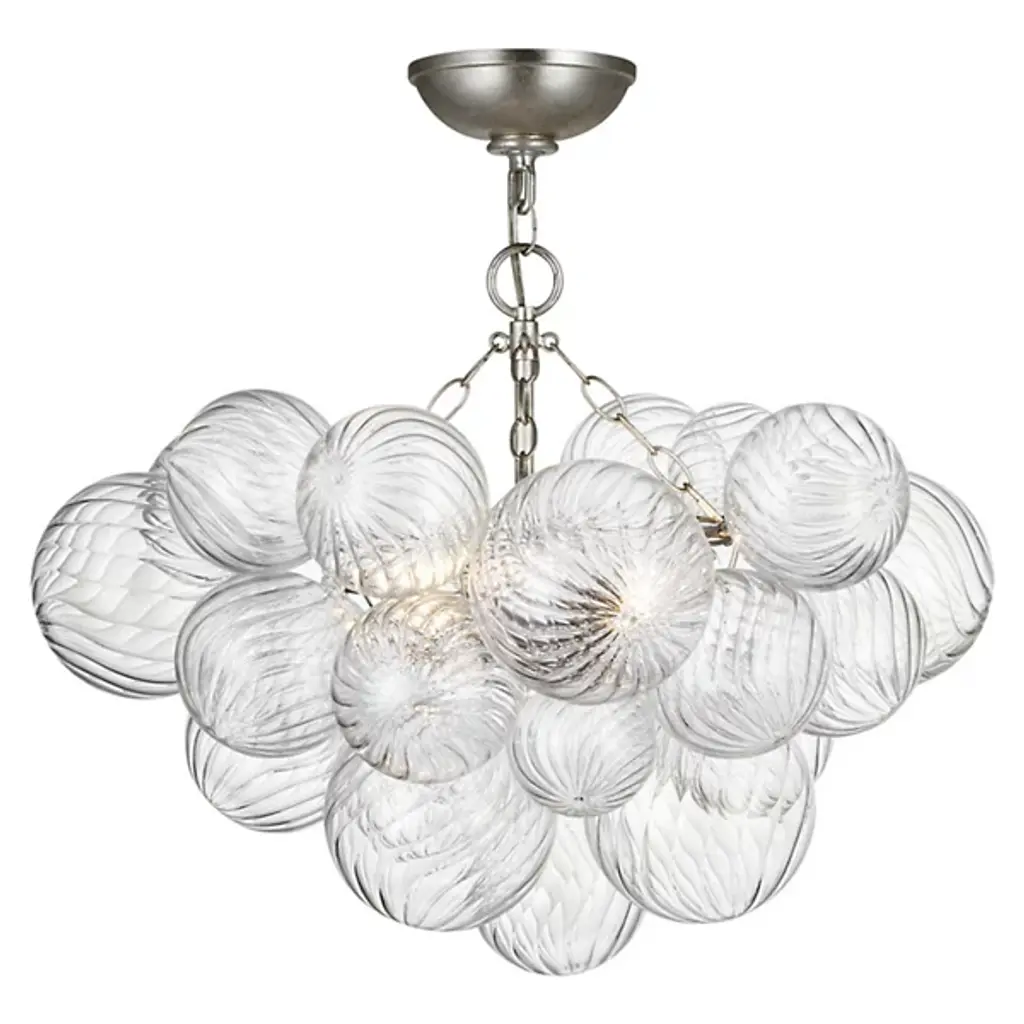The Talia Semi-Flushmount from Visual Comfort Modern delights like a beautiful bouquet as a cluster of shimmering artisanal glass. This piece underscores designer Julie Neill's art and craft-based approach. The semi-flush mount sports a delicate chain and a compact canopy for a seemingly floating suspension. A minimal framework with lamps rests inside the captivating group of swirled glass globes. These globes pop with highlights as warm light scatters through them with a relaxed quality