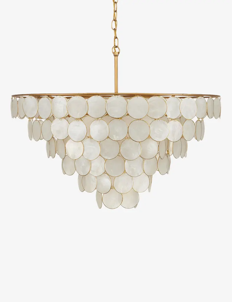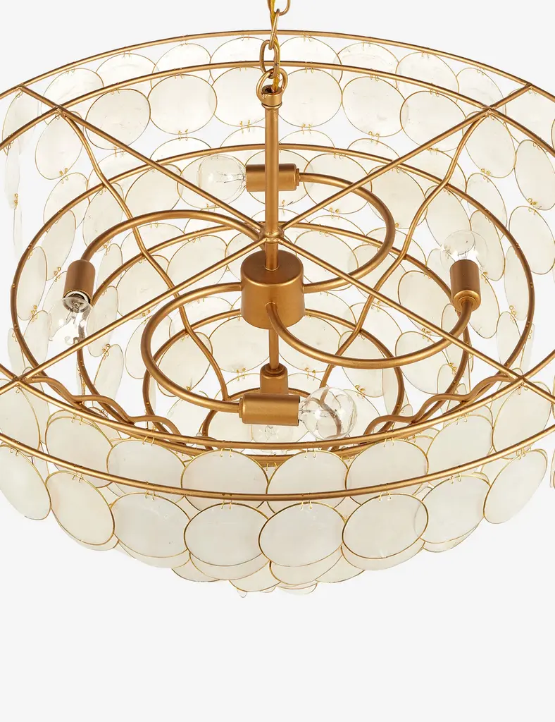 This semi-flush mount fixture stuns with sophistication. The design features capiz shells trimmed in metal and suspended from the gold leaf frame for a dazzling display overhead. An elegant ceiling light that proves the adagelighting is the jewelry of the room.