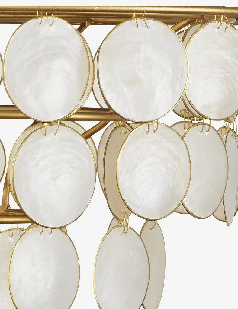 This semi-flush mount fixture stuns with sophistication. The design features capiz shells trimmed in metal and suspended from the gold leaf frame for a dazzling display overhead. An elegant ceiling light that proves the adagelighting is the jewelry of the room.