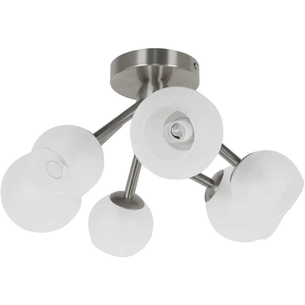 An artisanal network of shapely illumination. Bring the sophistication and pizzazz of mid-century modern design to your rooms with the Tanglewood Semi-Flushmount from Dainolite. It takes an artful approach to the traditional semi-flush mount by breaking up its bulbs across an intricate lighting system. Bold metal stems angle in every direction to each hold charming glass globe shades. The globes create an eye-grabbing visual even with the lights off as they capture the reflected highlights of a room. Bulbs fitted inside paint the globes a warm hue while shining through to produce a relaxing source of light.