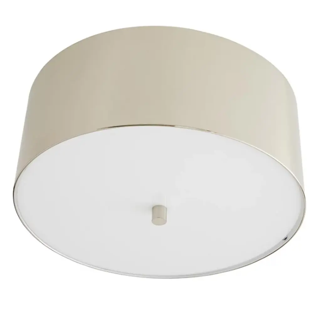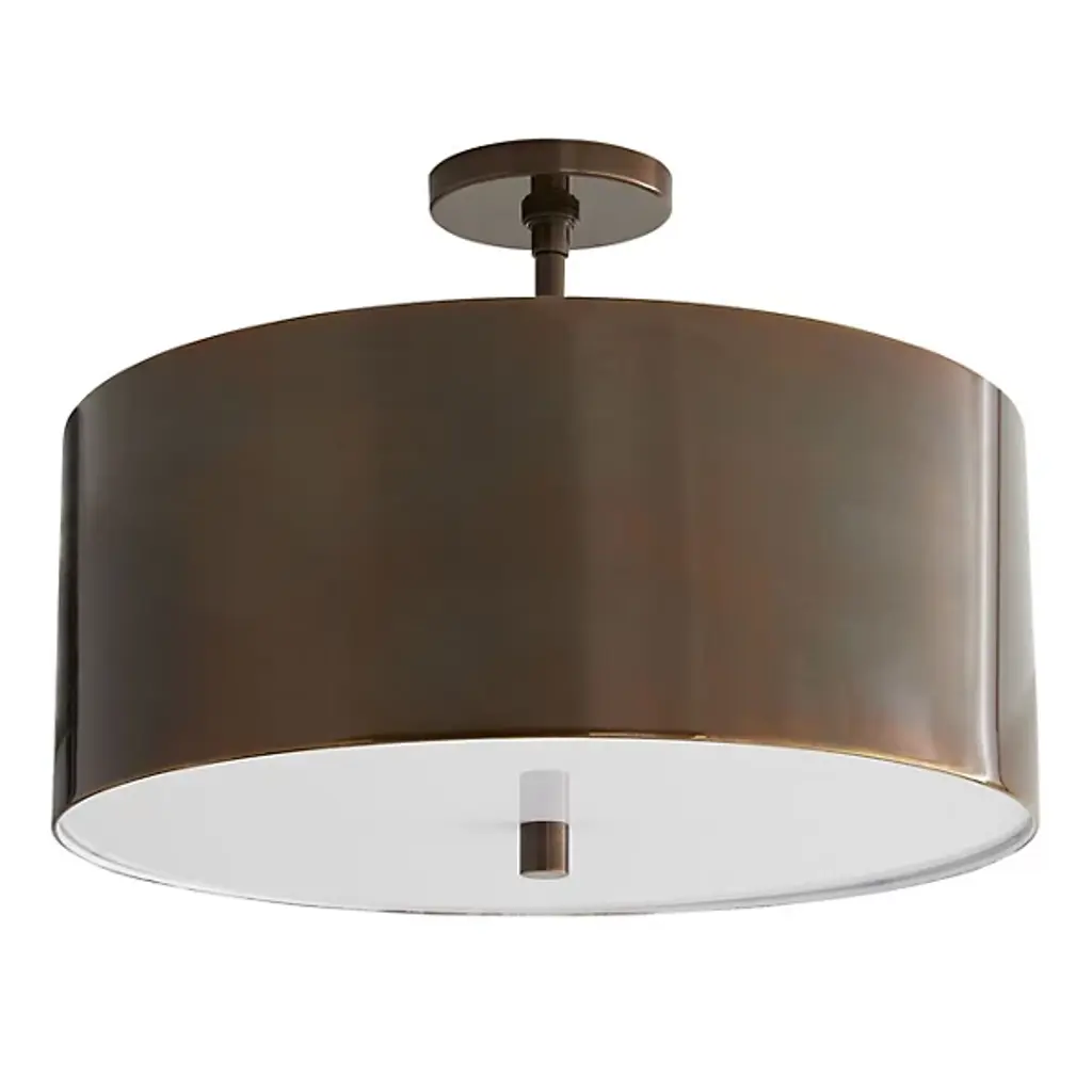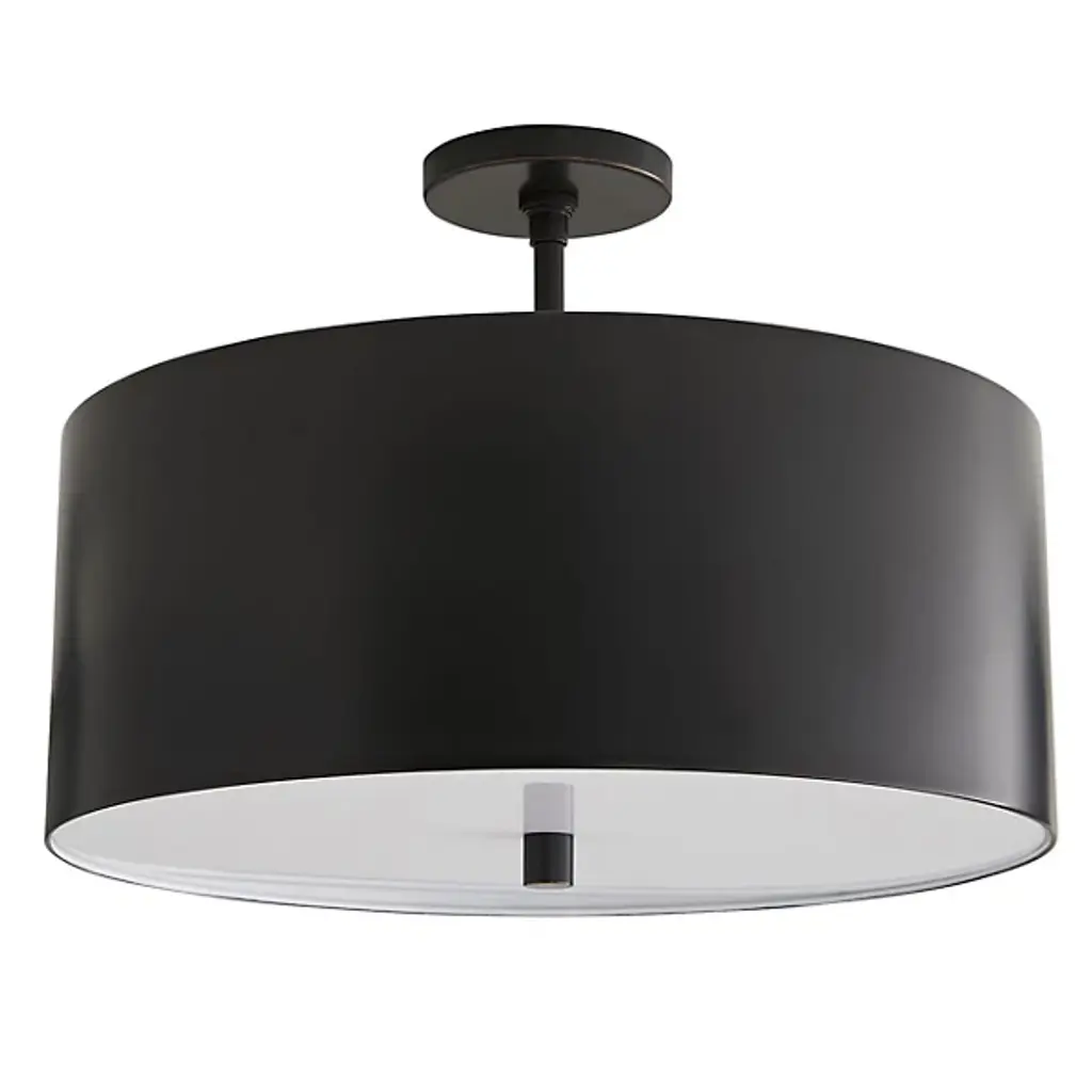 The Tarbell Semi-Flushmount by Arteriors captivates a space with its straightforward design and sleek composition. Suspended from a round canopy and narrow stem, the curved drum shade is constructed from steel to form a smooth and sophisticated shade. An acrylic diffuser maintains the simplicity of its design as it effortlessly softens the light that glows from the incandescent lamping inside. A rounded finial rounds out the modern fixture, making it a stylish addition to a bathroom, kitchen, or bedroom.