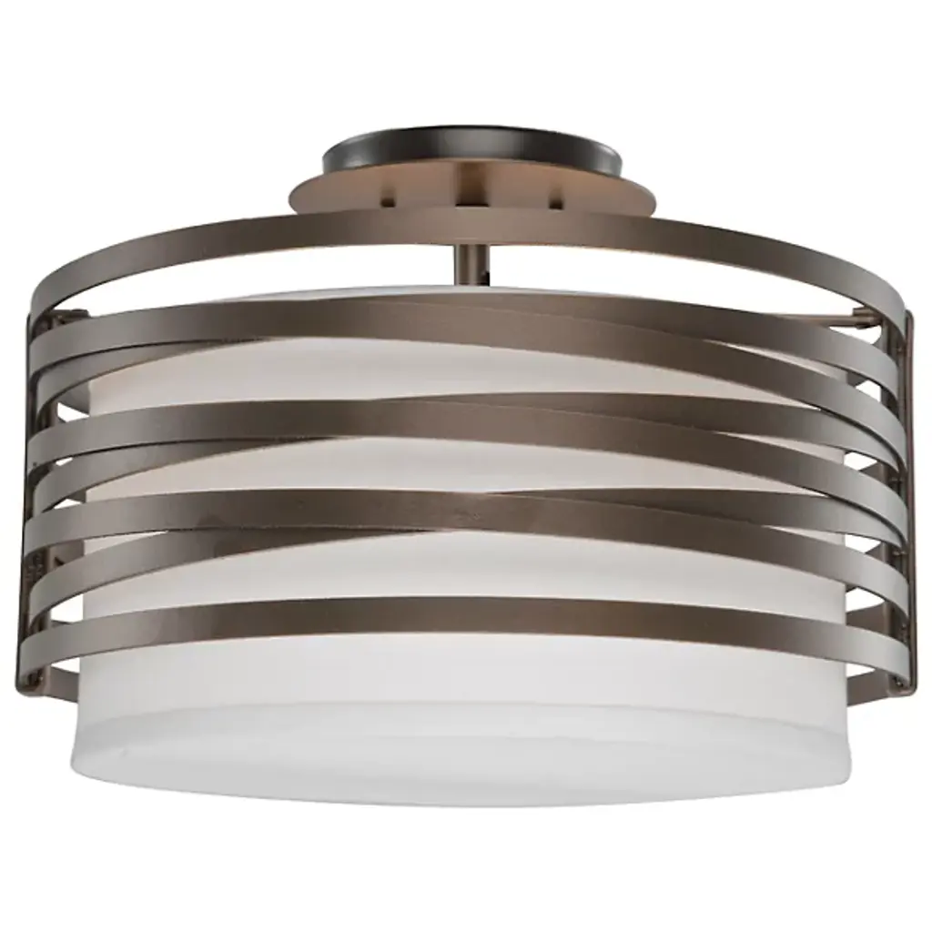 Let the Tempest Semi-Flushmount from Hammerton Studio move you with a swirling movement of lines and a wide-spreading light. The piece brings Hammerton Studio’s heavy-duty metal work together with a chic and stylish personality. In a true 3-dimensional design, steel bands shoot from side to side, overlapping each other in a display created to resemble a gusty storm. Its linen shade calms the storm in a bright, sophisticated hue. Bulbs trapped in the eye of the storm let out a comforting glow hinted with warmth.