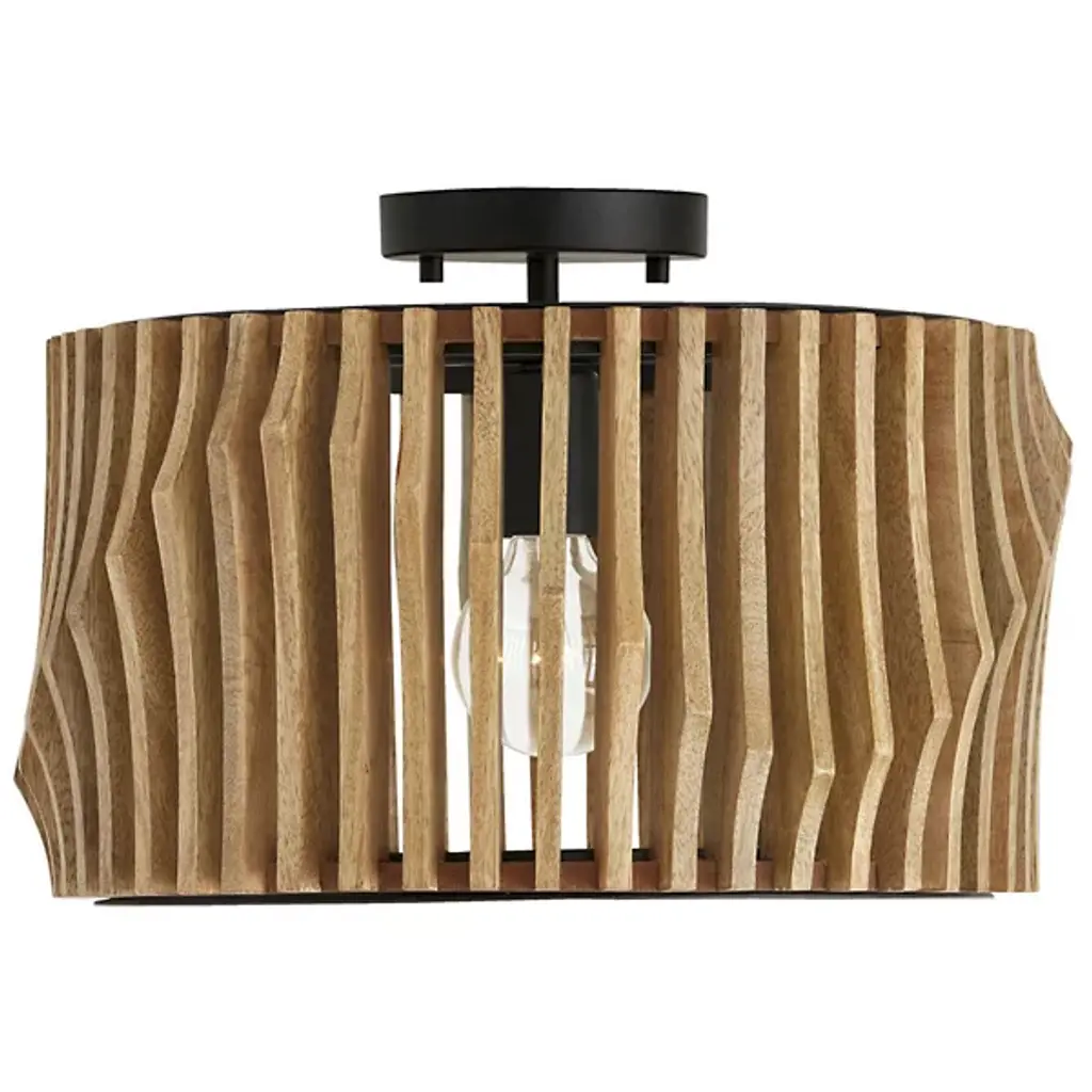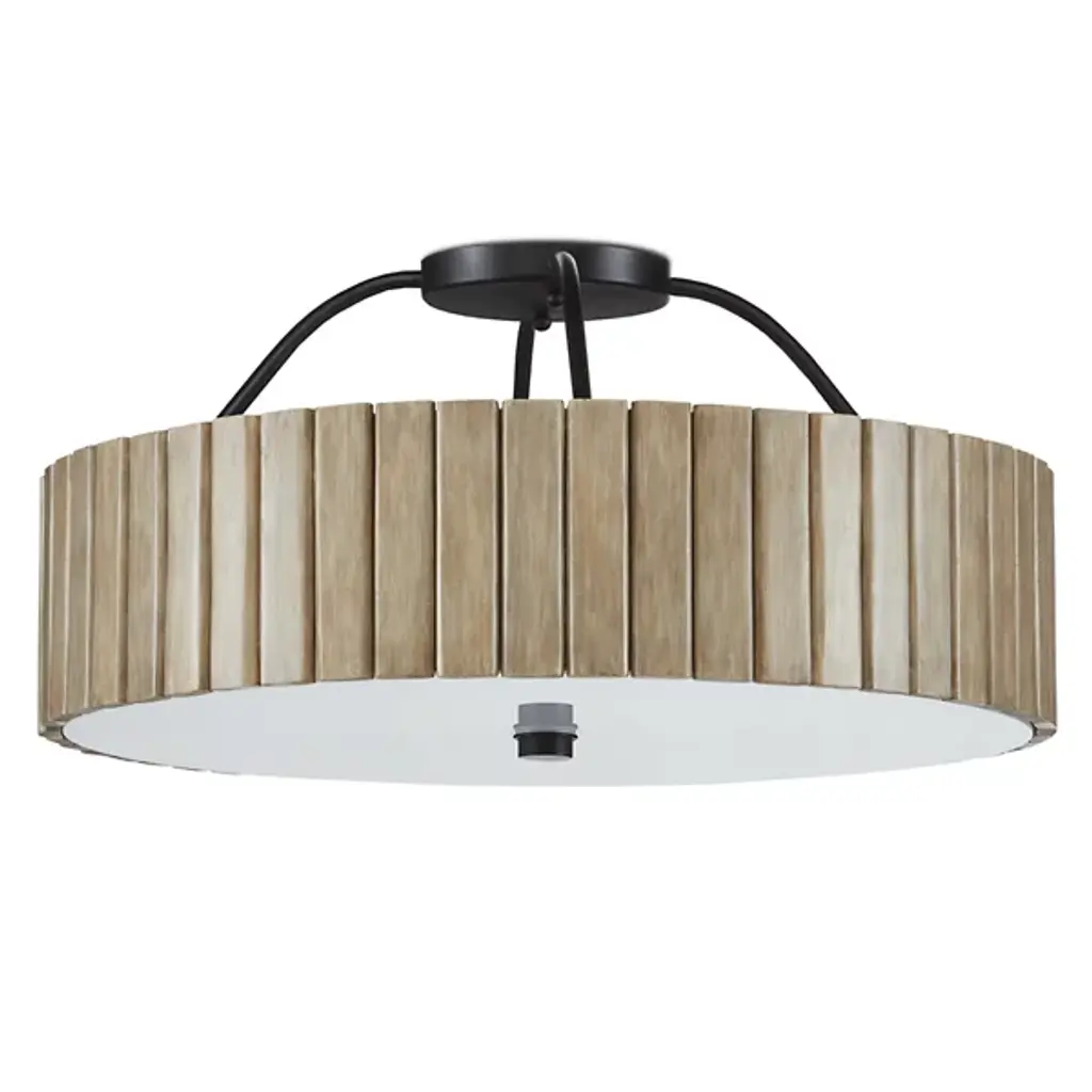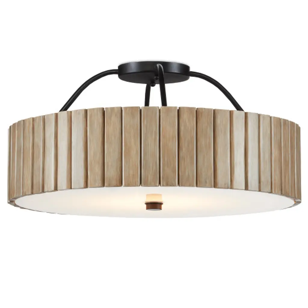 Bring smooth appeal to inside spaces with the Tetterby LED Semi-Flushmount from Currey & Company. A retro-modern fixture anchored by a sleek circular canopy, it drops four swooping arms down to a ring of vertically-slatted bamboo that surrounds strong, efficient LED lamping. A sleek disc of translucent acrylic held in place by a rounded finial obscures direct glare from the lamping, transforming it into an even and enduring glow.