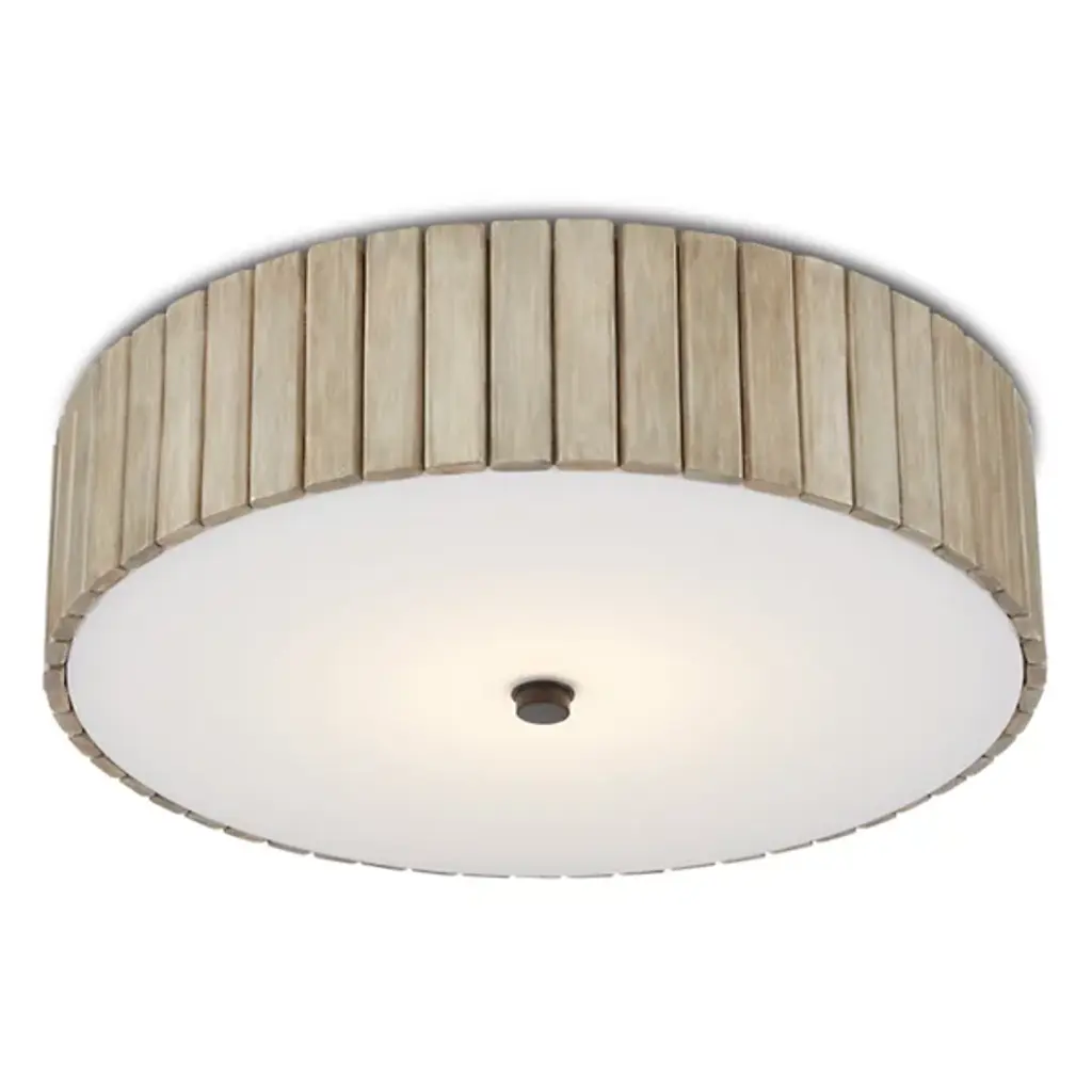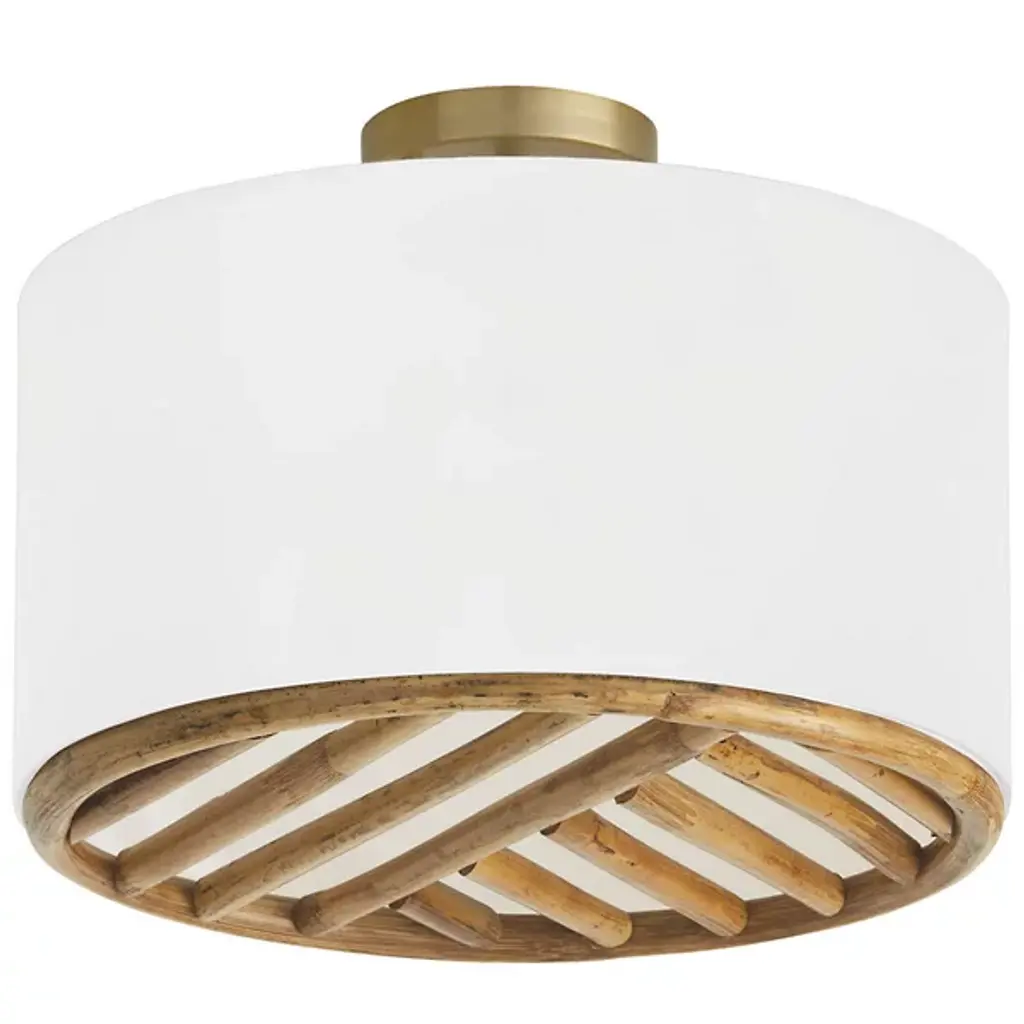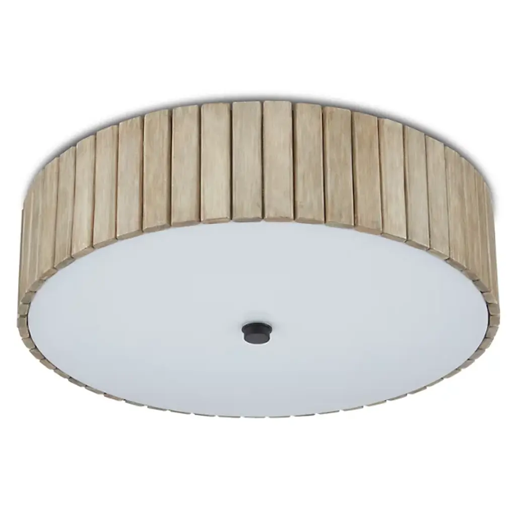 Bring smooth appeal to inside spaces with the Tetterby LED Semi-Flushmount from Currey & Company. A retro-modern fixture anchored by a sleek circular canopy, it drops four swooping arms down to a ring of vertically-slatted bamboo that surrounds strong, efficient LED lamping. A sleek disc of translucent acrylic held in place by a rounded finial obscures direct glare from the lamping, transforming it into an even and enduring glow.