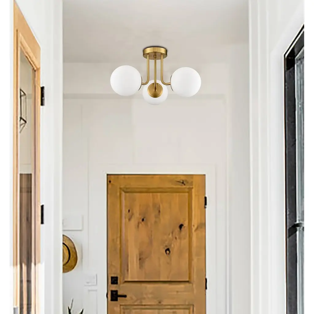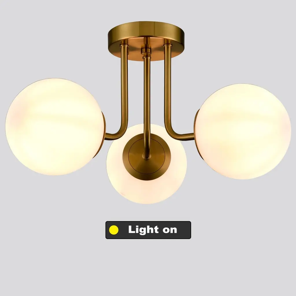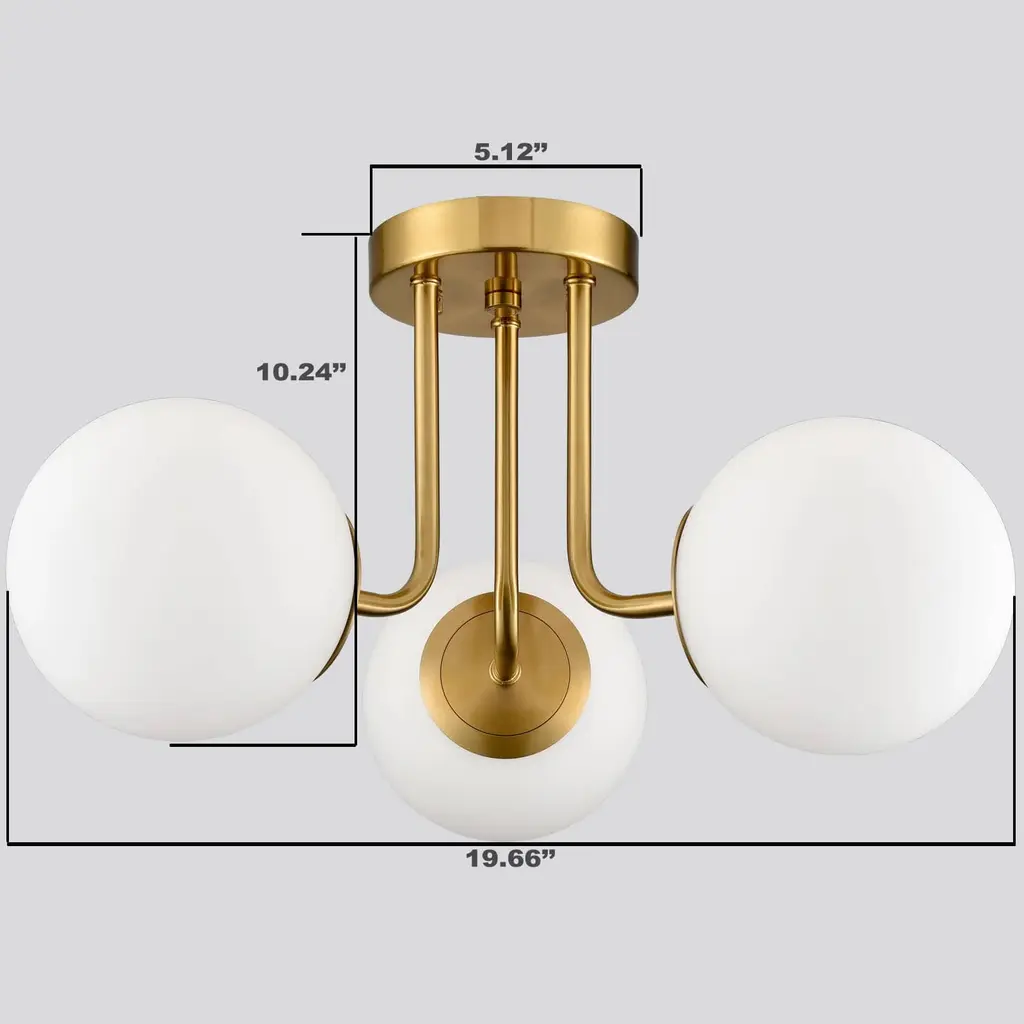 Modern ceiling light fixtures with an electrophoretic gold and black finish, the glass shade sputnik semi flush mount ceiling light fixture's canopy, arms, and lamp-holders shows off the unique texture of double-layer electroplating and brushed metal. Crafted from impurity-free hand-blown opaque opal glass, the ceiling light provides the perfect blend of mid-century classic and contemporary elements.The glass shade sputnik semi flush mount ceiling light fixture is an amazing addition to your living space with its gleaming finish. Three glass shades are supported by gracefully curved arms, conveying a refined touch. It works best in your bathroom, bedroom, dining room, entryway, foyer, hallway, kids room, kitchen, living room, porch, reading room, stairwell, and study room.The glass shade sputnik semi flush mount ceiling light fixture is compatible with three 40-watt E12-base bulbs (NOT included). It is fully dimmable with a compatible dimmer switch and dimmable bulbs. The ceiling light's globe shades can distribute light evenly to avoid shadows.Spreading subtle light rays throughout your space, the semi flush mount ceiling light fixture creates a soothing ambiance. ETL listed for dry locations. The sealing design of the glass shades and the aluminum parts make it easy for installation and bulb replacement.A hardwired connection is applicable to the ceiling light. Dimension: 10.84 inches wide * 19.66 inches high; canopy: 5.12 inches.